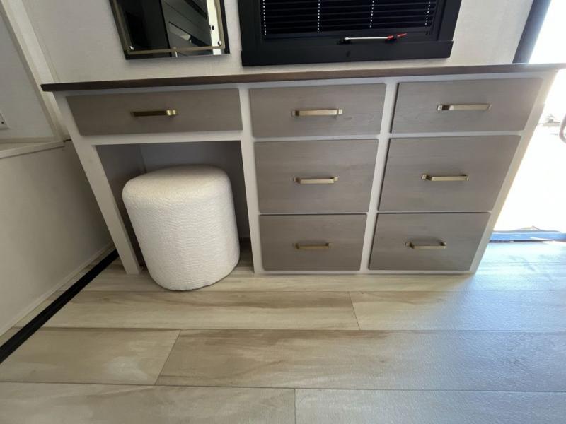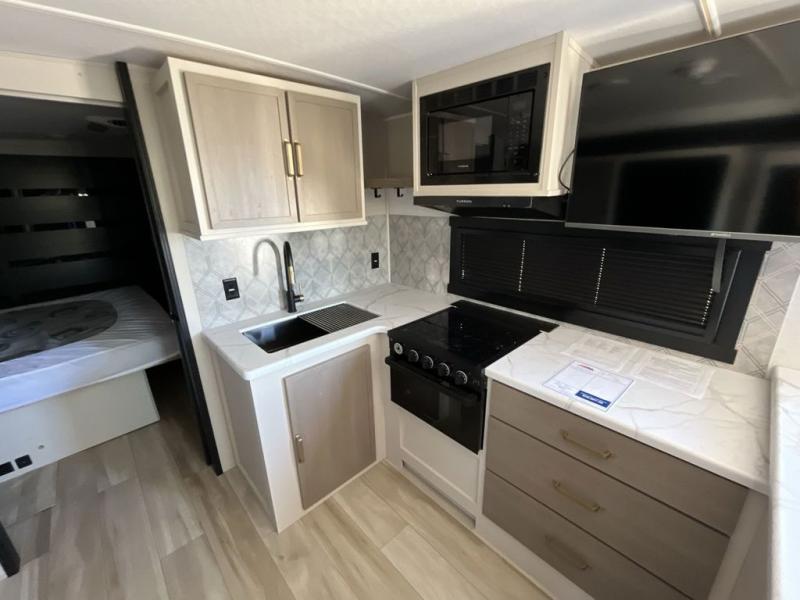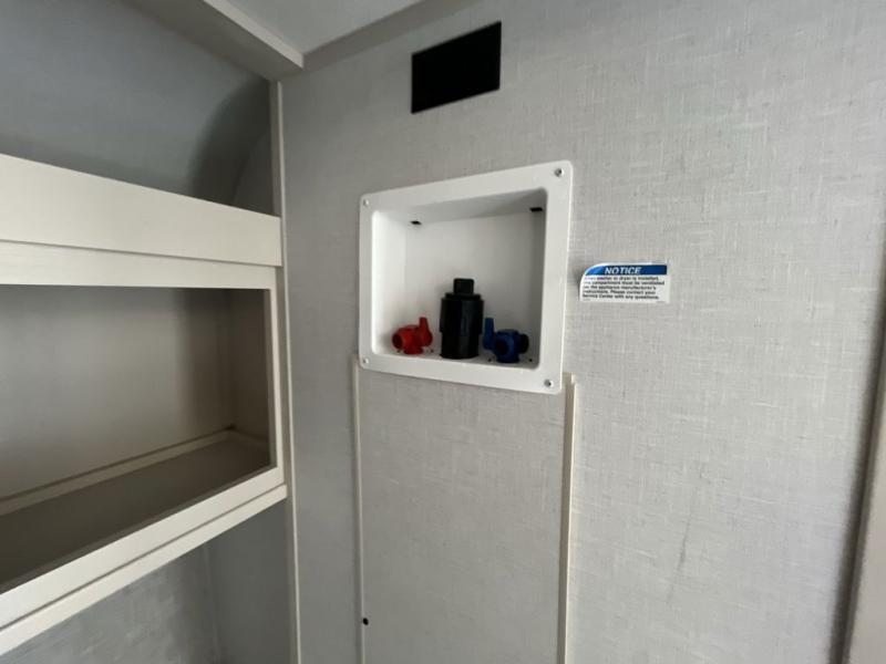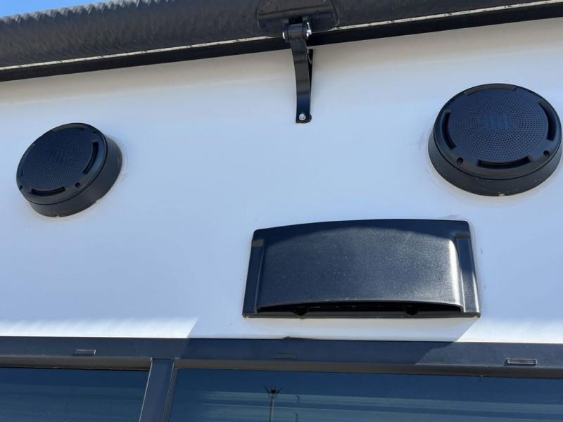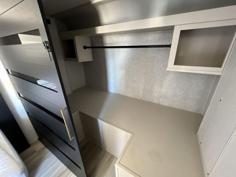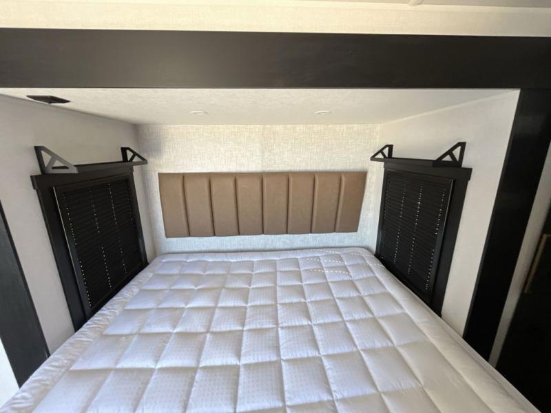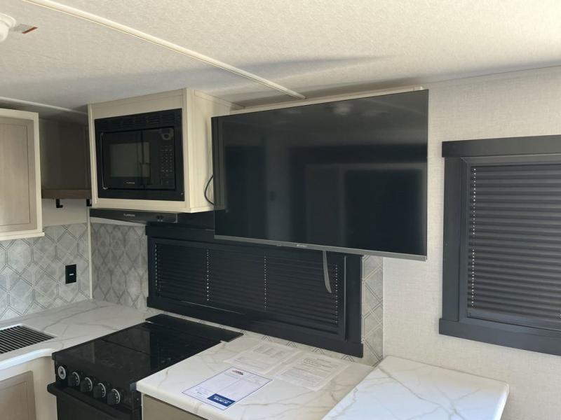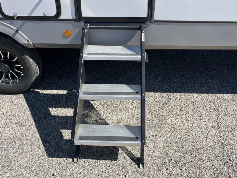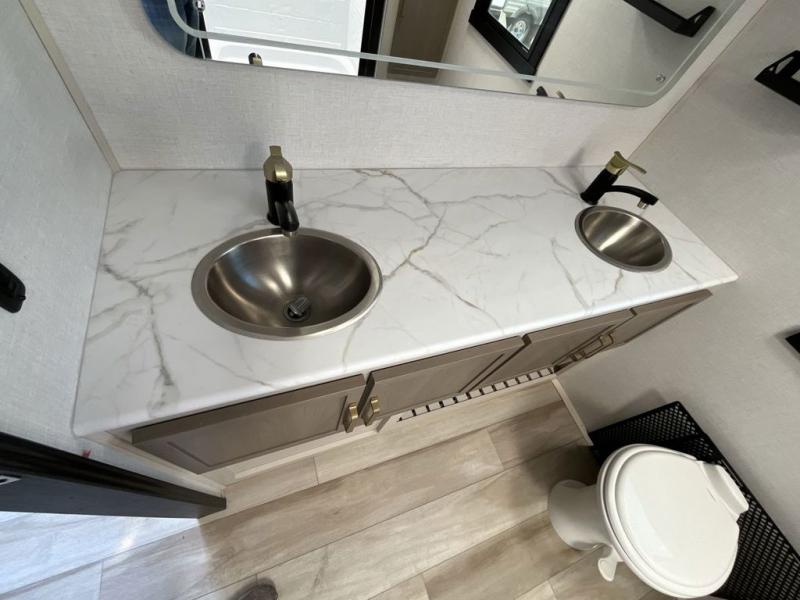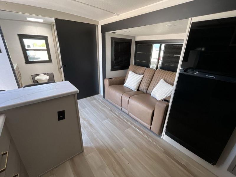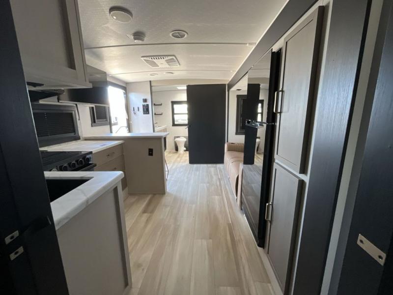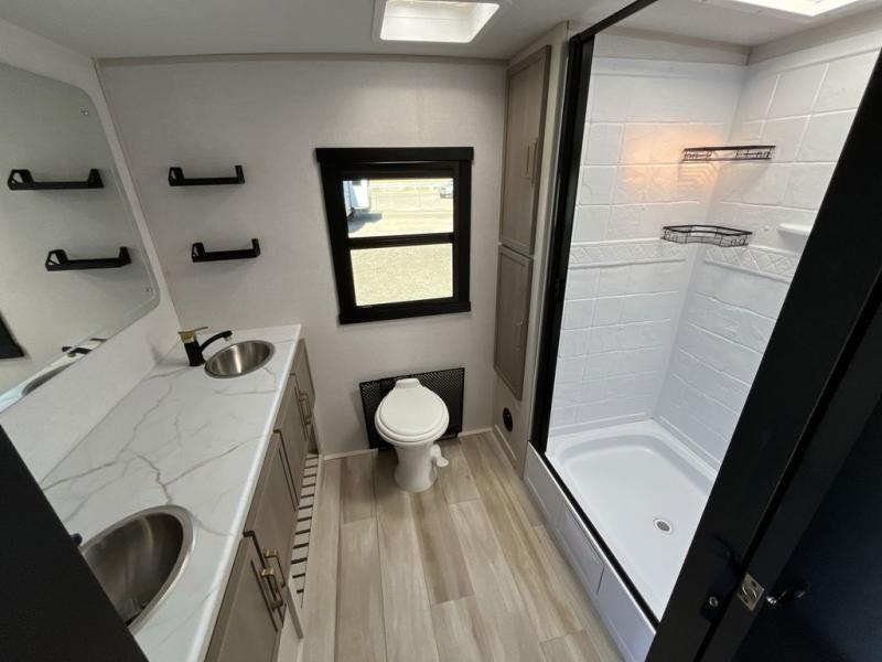 It won't be hard to find comfort in this dual entry travel trailer for two! The front bedroom includes one of the entry doors, a king bed slide out, and a large front wardrobe with washer and dryer prep if you want to add those appliances. You can relax in the main living room and combined kitchen that includes a large slide out and theater seating, or you can relax outside under the 21' awning! There is also an outside kitchen with a griddle and refrigerator if you enjoy cooking outdoors. Once you've headed back inside for the night, you can freshen up in the full rear bath before bed. Here, you'll find dual bath sinks, a linen closet, and a walk-in shower with skylights for more natural lighting!