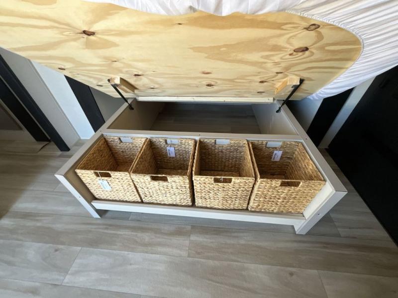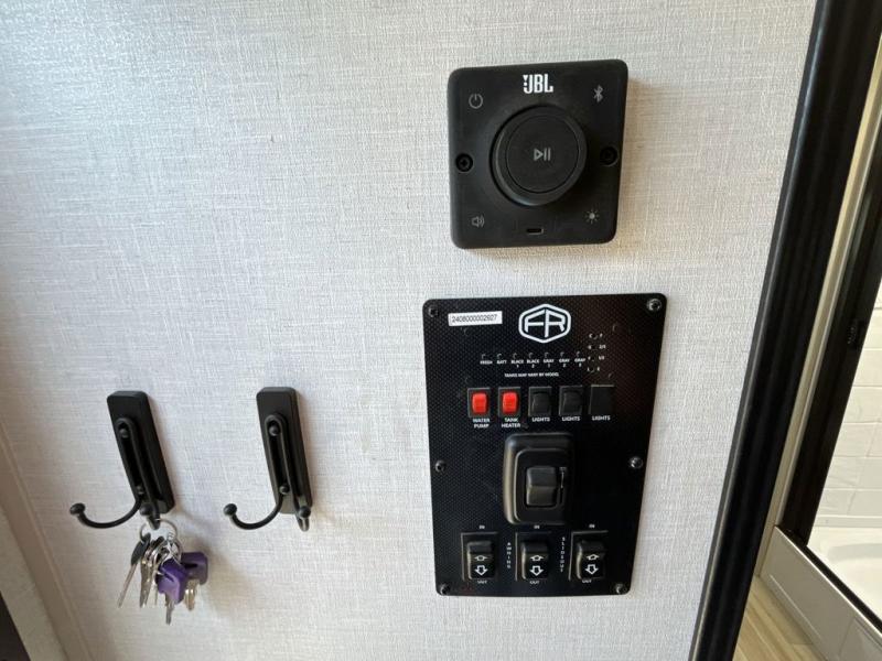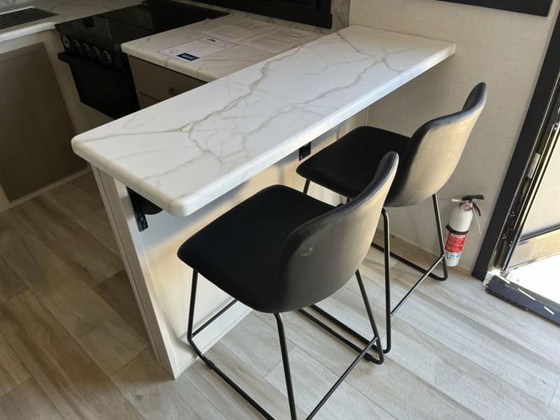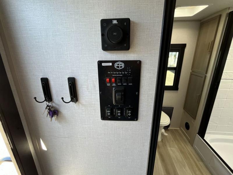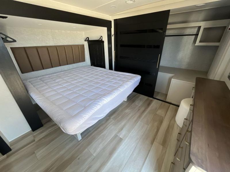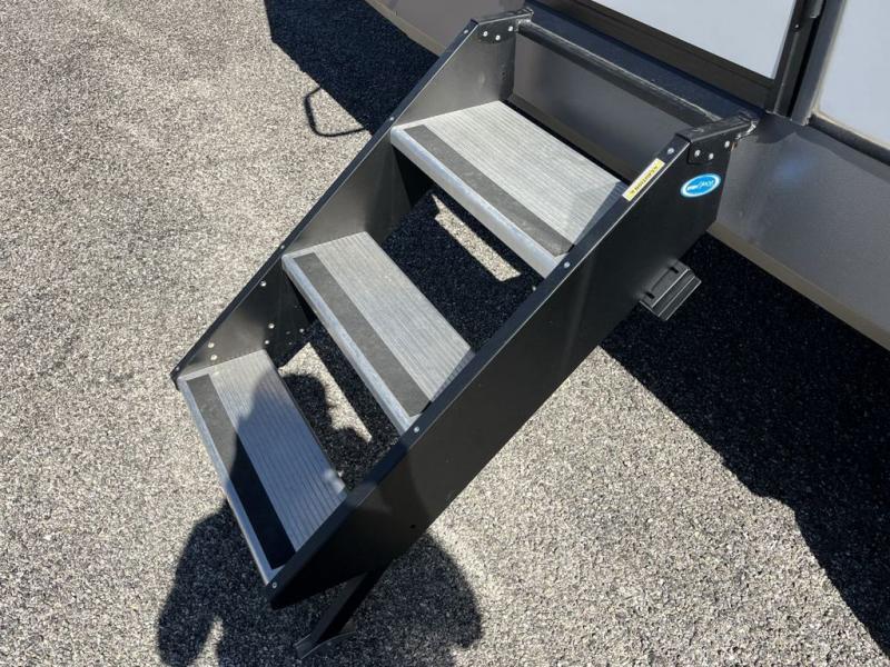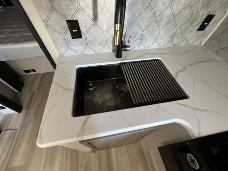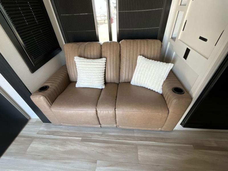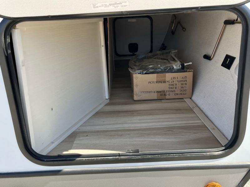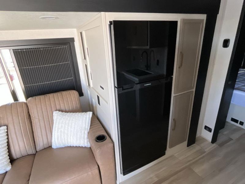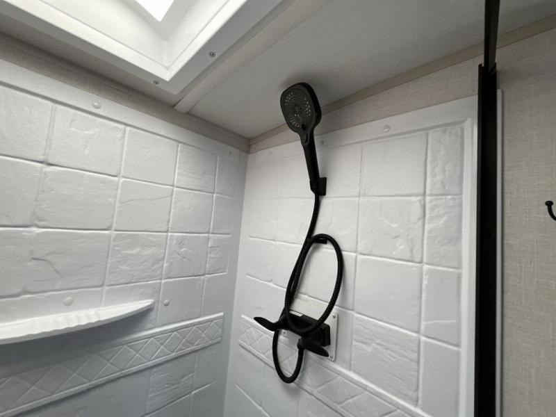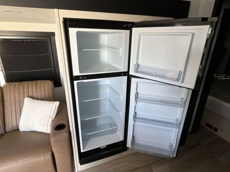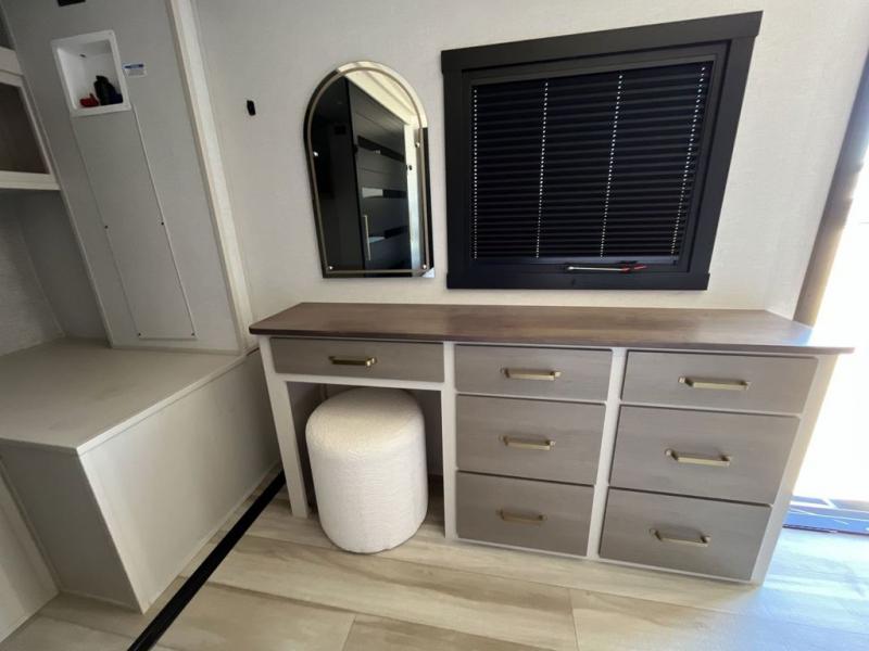It won't be hard to find comfort in this dual entry travel trailer for two! The front bedroom includes one of the entry doors, a king bed slide out, and a large front wardrobe with washer and dryer prep if you want to add those appliances. You can relax in the main living room and combined kitchen that includes a large slide out and theater seating, or you can relax outside under the 21' awning! There is also an outside kitchen with a griddle and refrigerator if you enjoy cooking outdoors. Once you've headed back inside for the night, you can freshen up in the full rear bath before bed. Here, you'll find dual bath sinks, a linen closet, and a walk-in shower with skylights for more natural lighting!