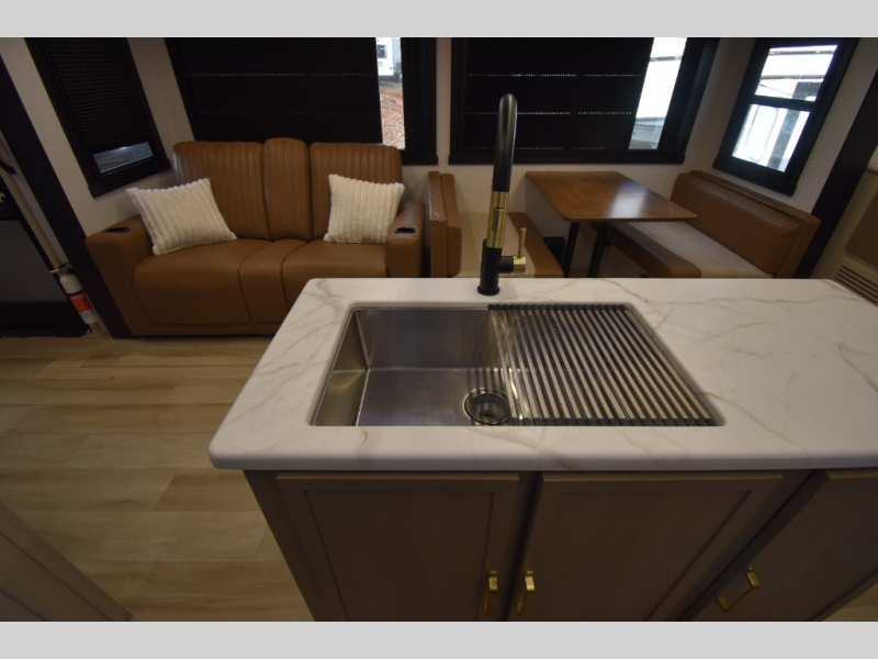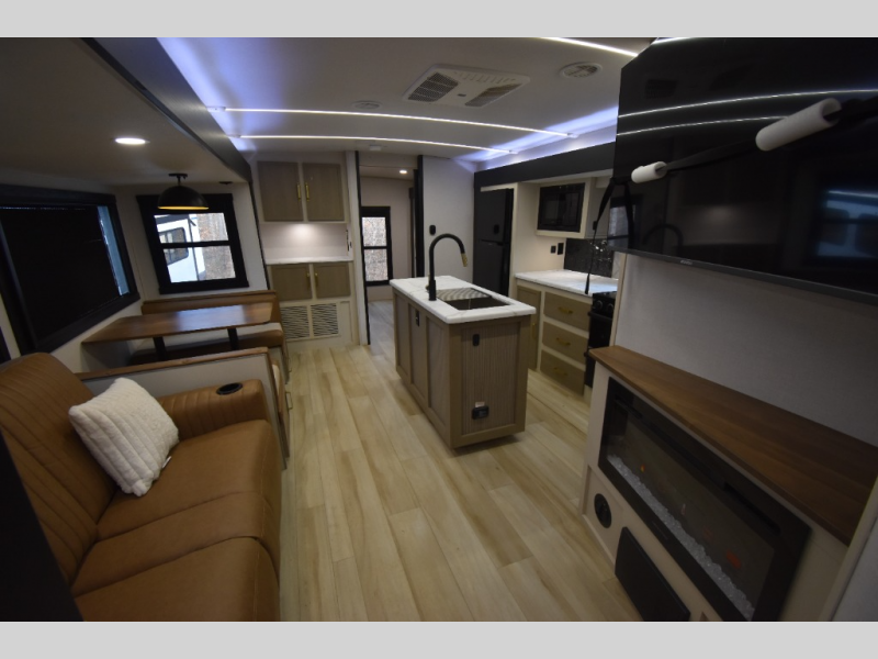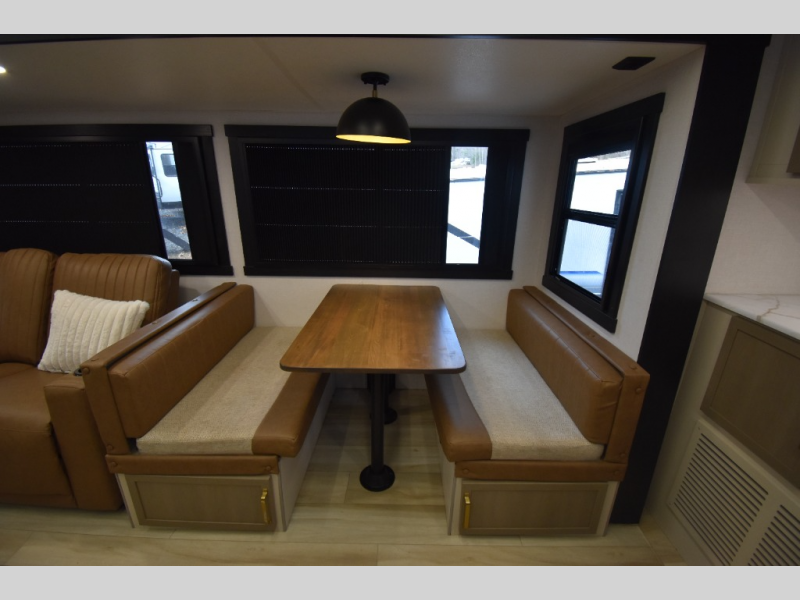 Your kids or friends are ready for a trip in this Wildwood Heritage Glen travel trailer, but are you? As the kiddos or your buddies claim the private bunkhouse for themselves, which includes two bunk beds and a convertible sofa bed, you can escape to your own privacy in the front bedroom with a queen bed with Versa Tilt and lots of storage. There is even washer/dryer prep for added convenience. The main living area and kitchen might be the next indoor hangout spot thanks to the chef-size walk-in pantry and 12V refrigerator. The cook even has a choice of making meals on the outside kitchen/bar which also includes an LP quick connect nearby. On rainy days, the theatre seats and booth dinette will offer a place to watch TV and play games, and the panoramic windows will always offer beautiful scenery no matter the weather conditions.