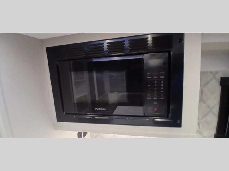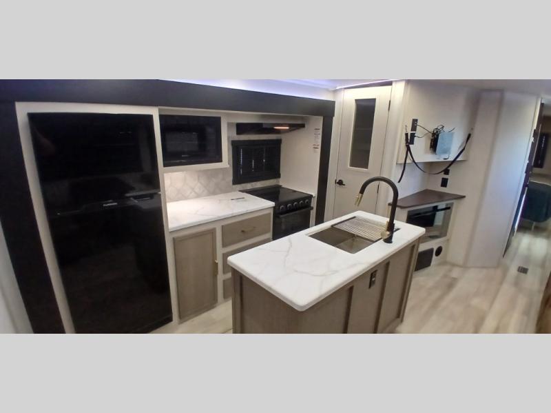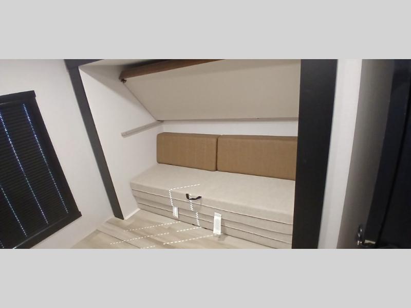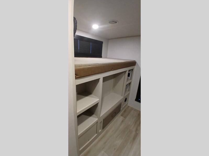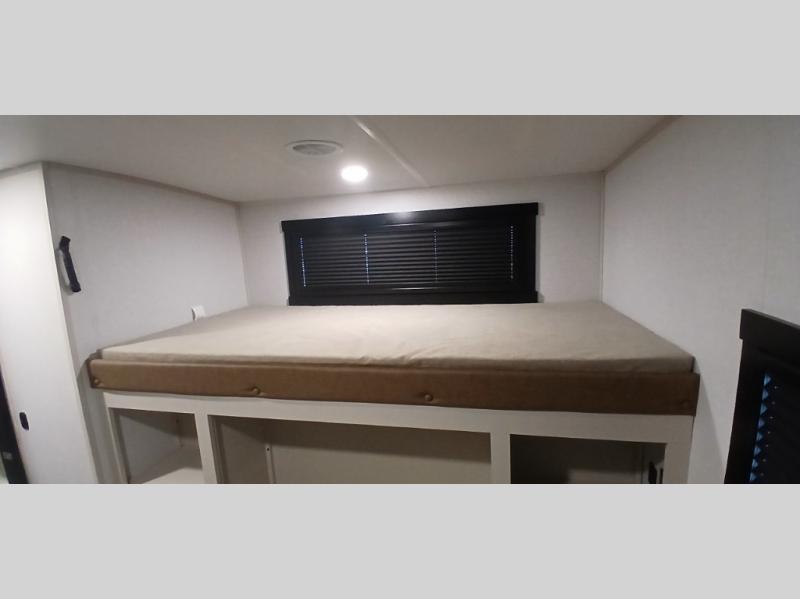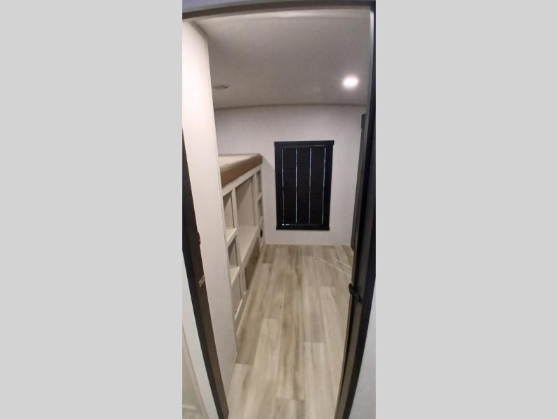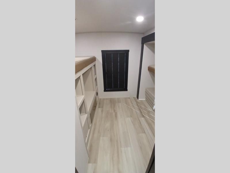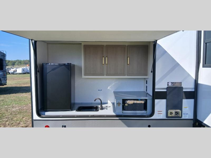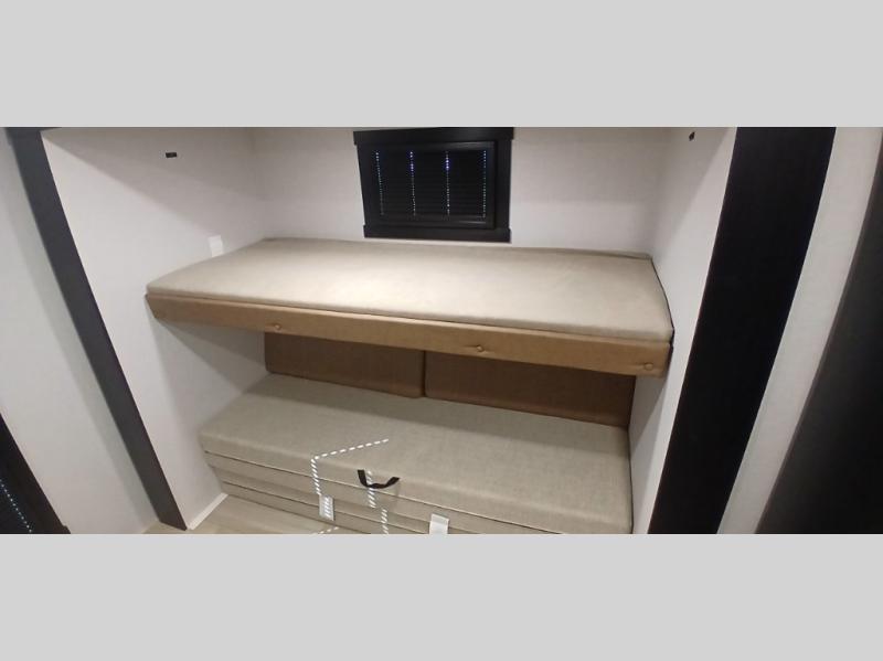Your kids or friends are ready for a trip in this Wildwood Heritage Glen travel trailer, but are you? As the kiddos or your buddies claim the private bunkhouse for themselves, which includes two bunk beds and a convertible sofa bed, you can escape to your own privacy in the front bedroom with a queen bed with Versa Tilt and lots of storage. There is even washer/dryer prep for added convenience. The main living area and kitchen might be the next indoor hangout spot thanks to the chef-size walk-in pantry and 12V refrigerator. The cook even has a choice of making meals on the outside kitchen/bar which also includes an LP quick connect nearby. On rainy days, the theatre seats and booth dinette will offer a place to watch TV and play games, and the panoramic windows will always offer beautiful scenery no matter the weather conditions.