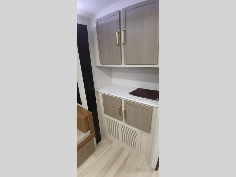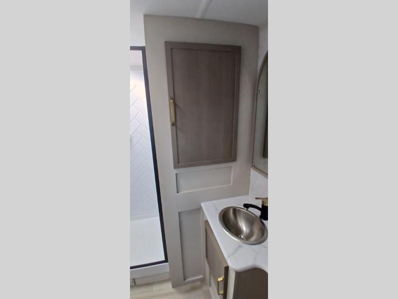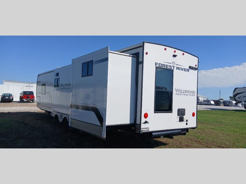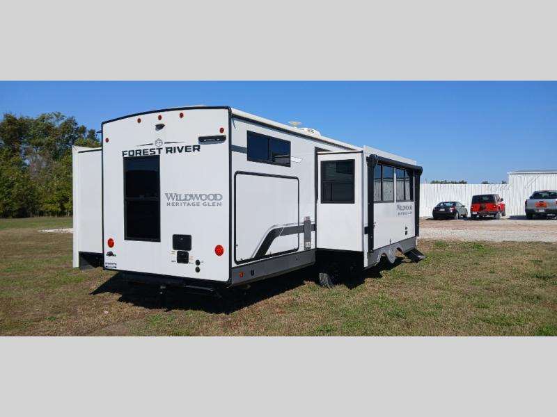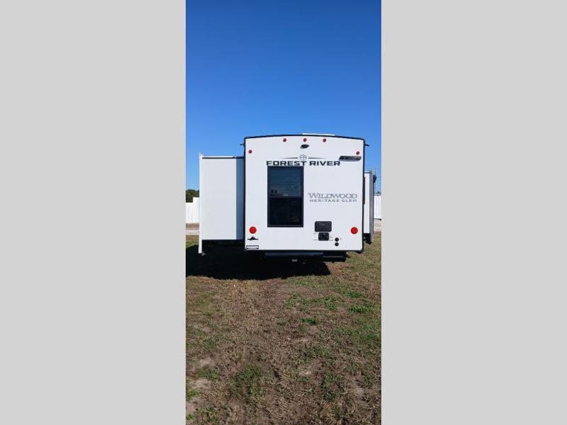 With any Wildwood Heritage Glen travel trailer by Forest River, the quality construction, attention to detail and design along with a bright and welcoming interior allows you to relax in comfort with conveniences while exploring outdoors. Each model includes a WeatherShield one piece fiberglass roof, Maxxis radial tires, and an enclosed underbelly with 12V tank heaters on all holding tanks for added protection. You will appreciate the on-demand tankless water heater, along with the 15K BTU Quite Cool A/C and 50 Amp service with a brace for a second A/C. There is an outside shower with hot and cold water, solar prep, a power tongue jack, plus many more exterior conveniences. Head inside to enjoy matte gold hardware, wood door casings in place of plastic door casings, and full length barreled ceilings for additional head room.