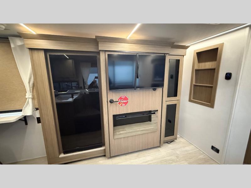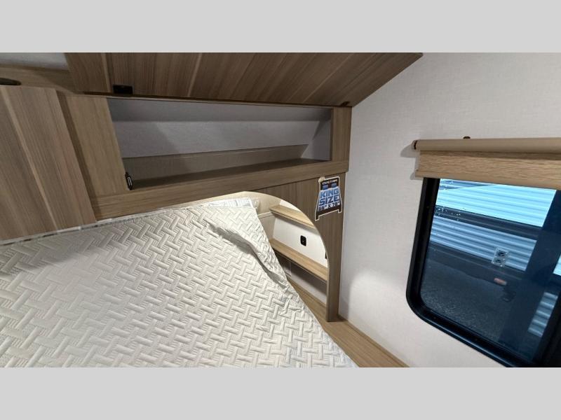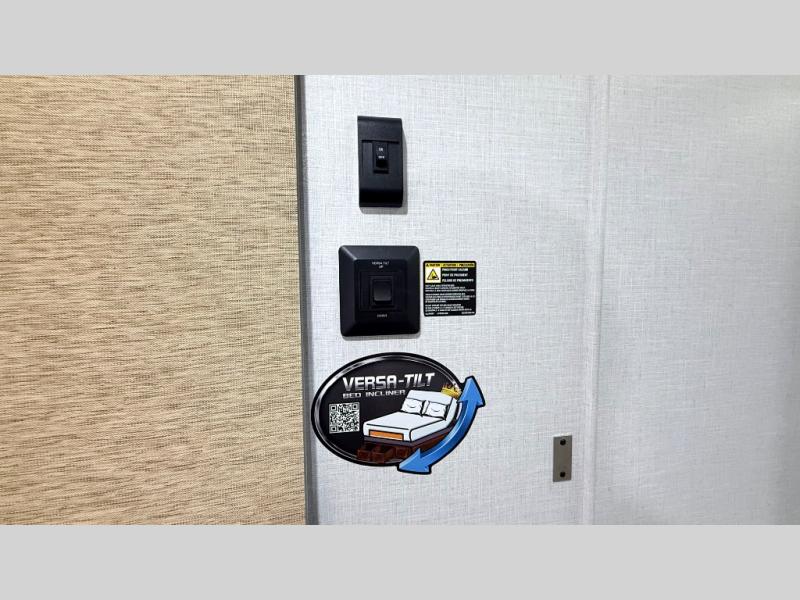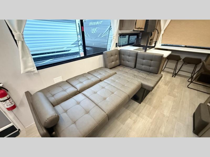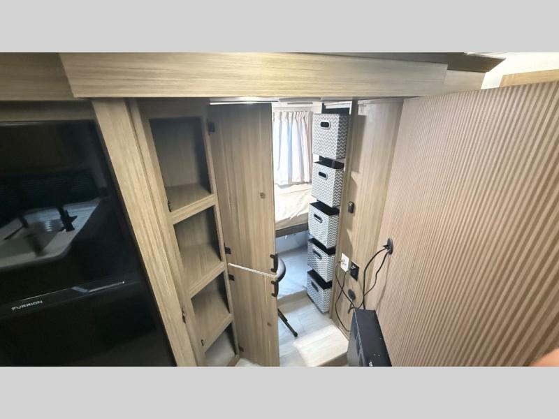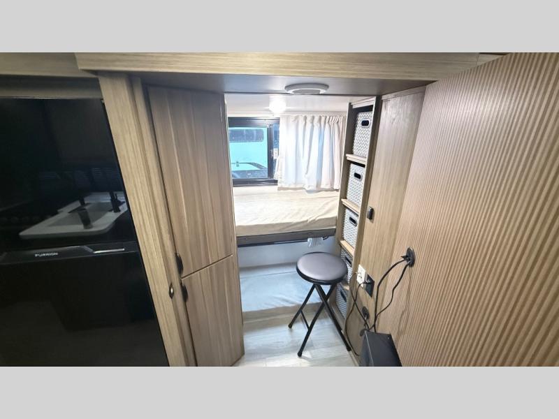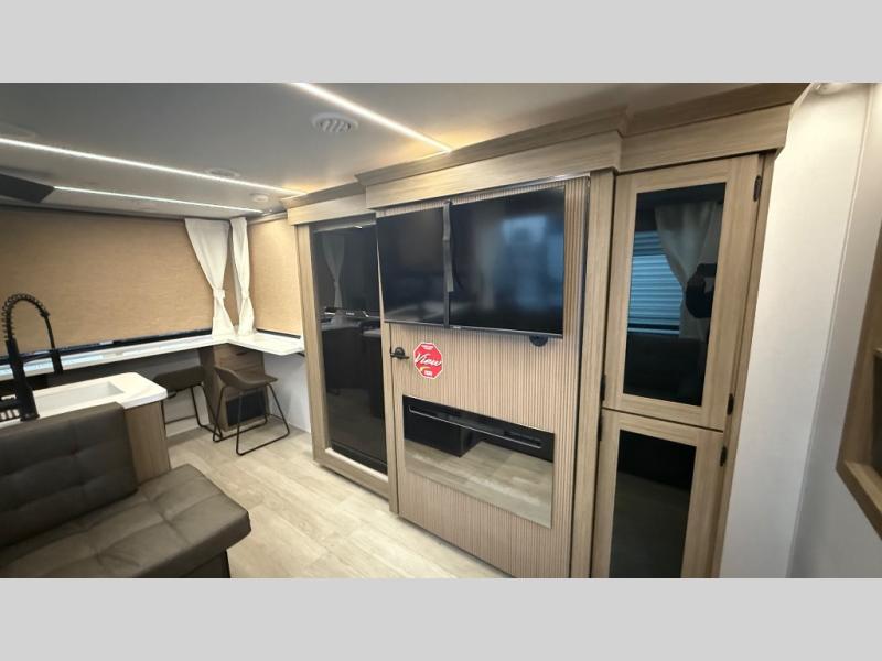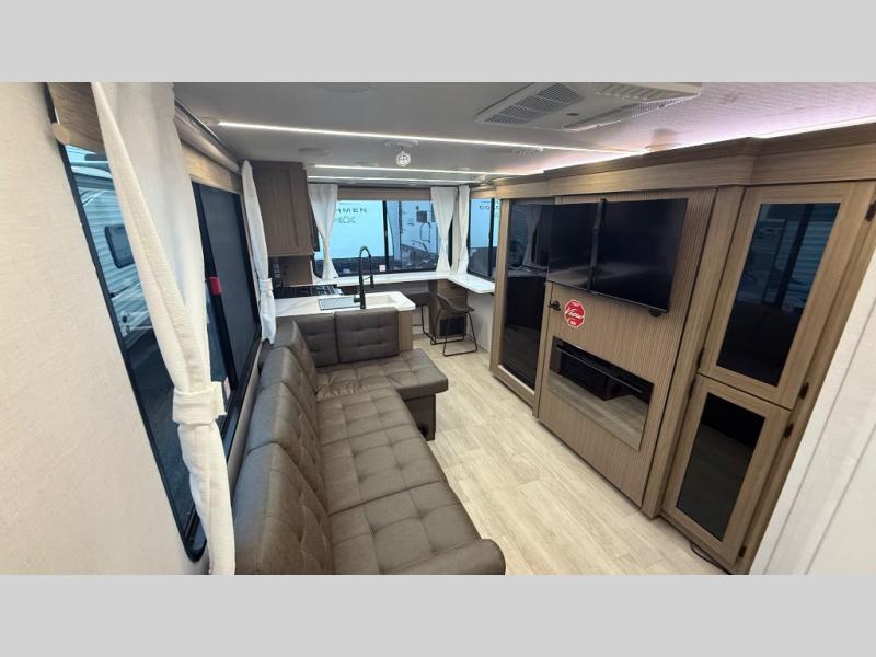 You're going to fall in love with this travel trailer that can sleep five to six each night. The front private bedroom includes a Versa-Tilt custom king bed and dual wardrobes to keep your things tidy. In the living room, a swiveling entertainment center hides the hinged mattress with a mattress below, along with a desk beneath the mattress pad and storage cubbies, making this space a hidden bunkhouse or office space! The L-shaped sofa is right across from the fireplace so you can enjoy your evenings, and the rear kitchen is sure to be a big hit with the cook. Here, you'll find wrap-around counter space with a flip-up table, two stools, plus all the appliances to cook and store food.