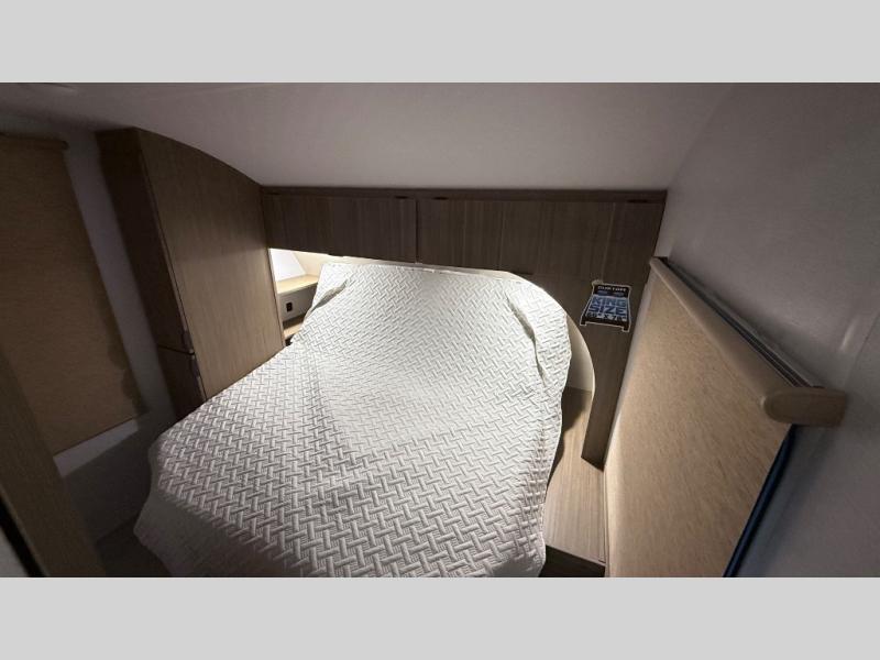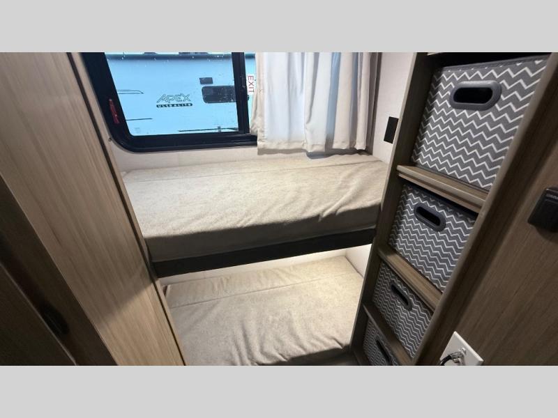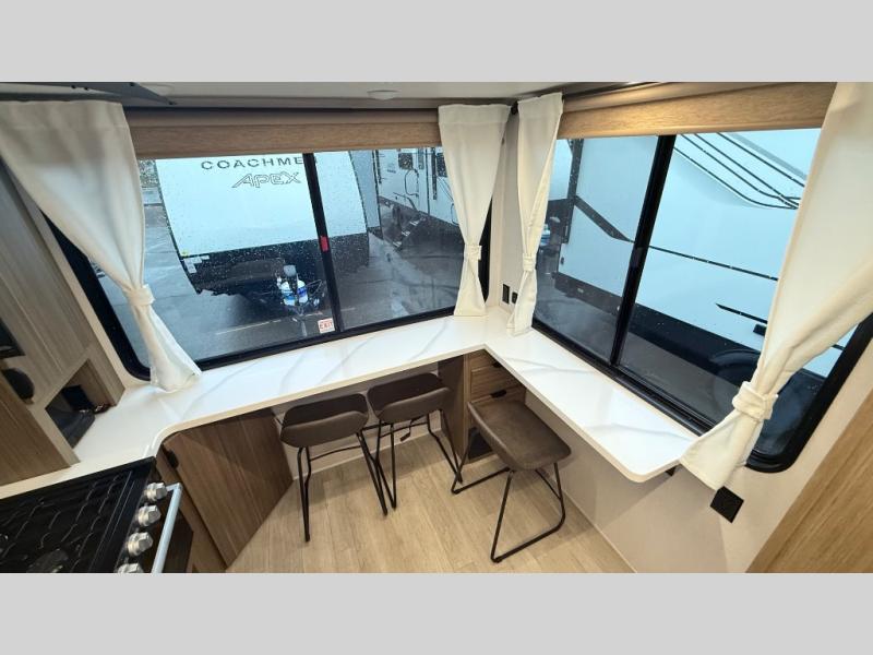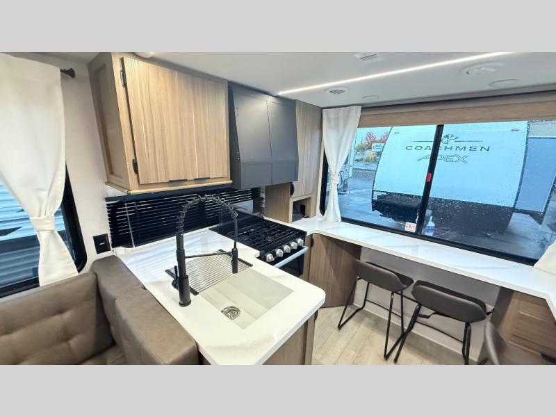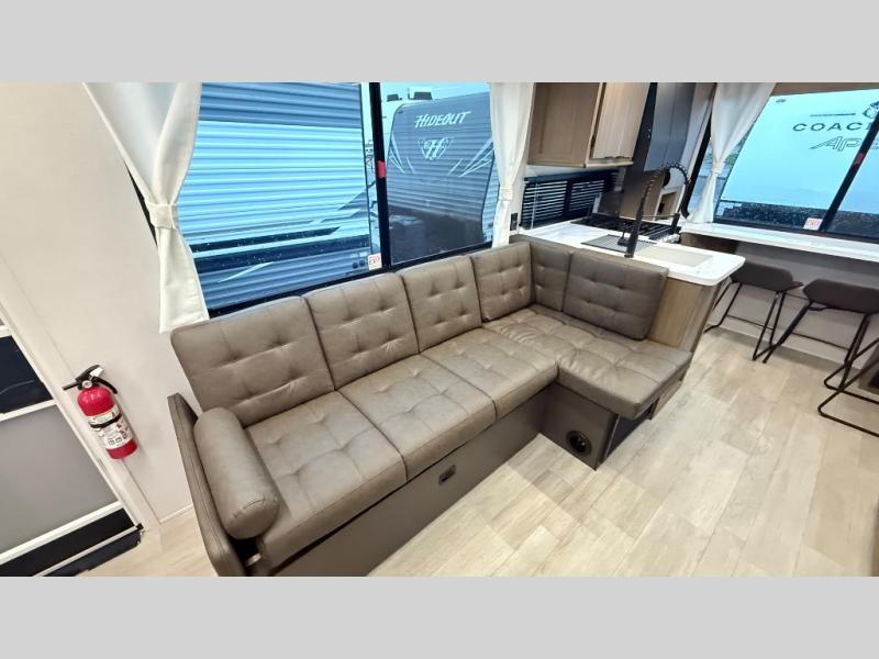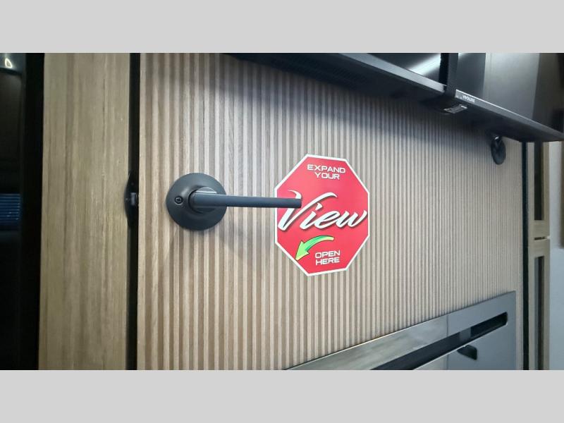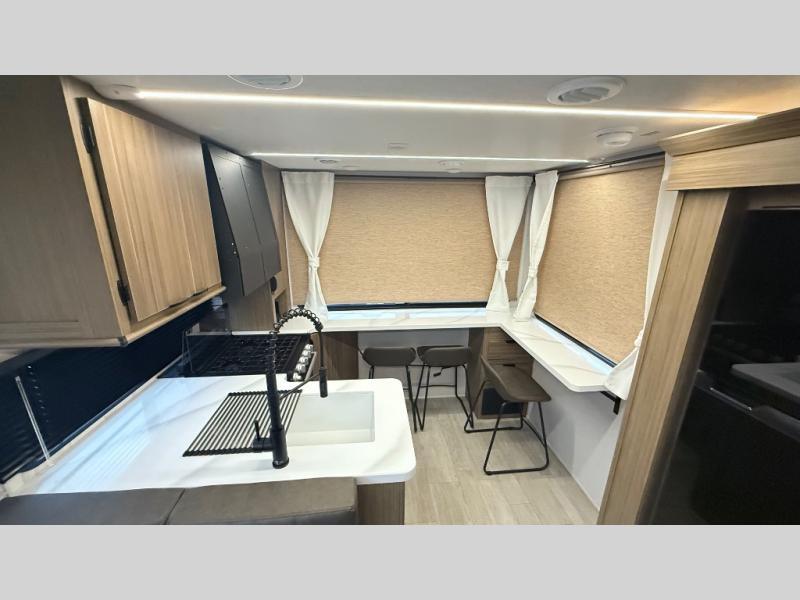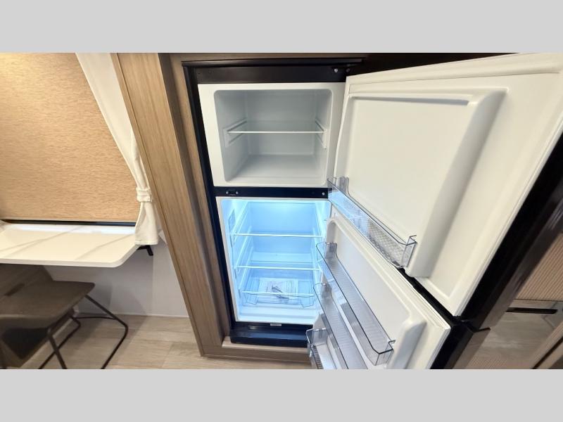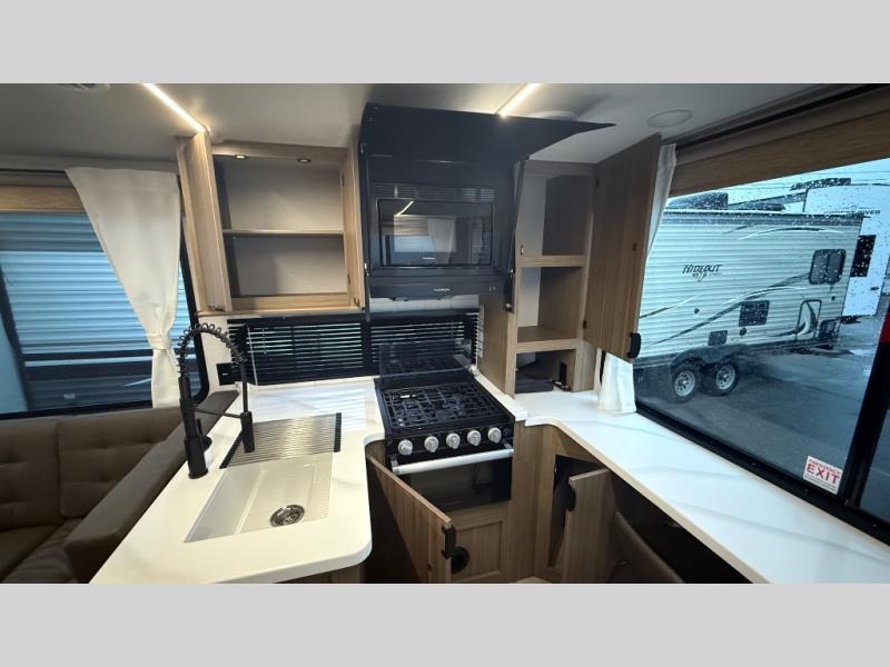You're going to fall in love with this travel trailer that can sleep five to six each night. The front private bedroom includes a Versa-Tilt custom king bed and dual wardrobes to keep your things tidy. In the living room, a swiveling entertainment center hides the hinged mattress with a mattress below, along with a desk beneath the mattress pad and storage cubbies, making this space a hidden bunkhouse or office space! The L-shaped sofa is right across from the fireplace so you can enjoy your evenings, and the rear kitchen is sure to be a big hit with the cook. Here, you'll find wrap-around counter space with a flip-up table, two stools, plus all the appliances to cook and store food.