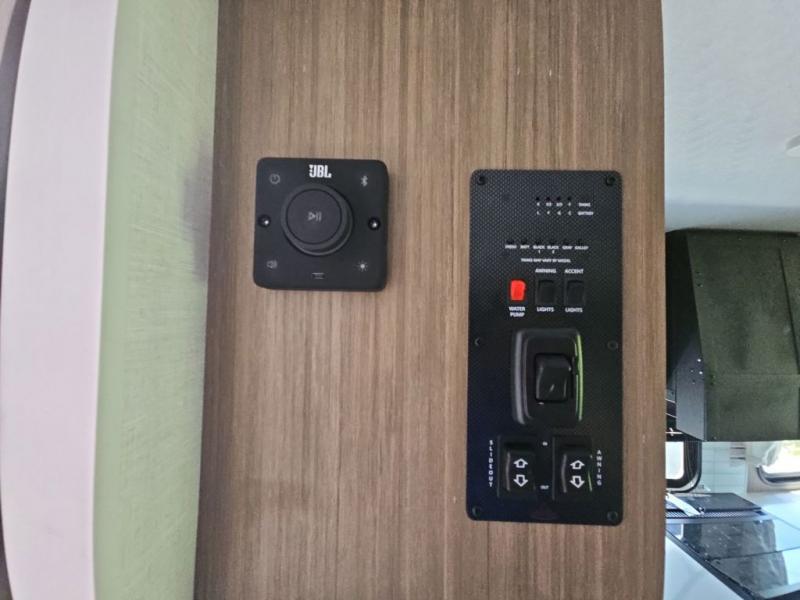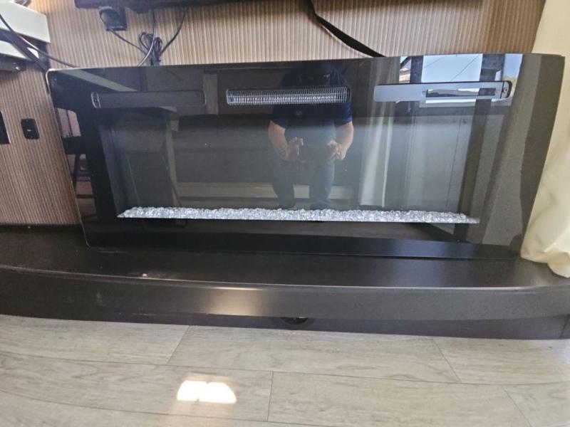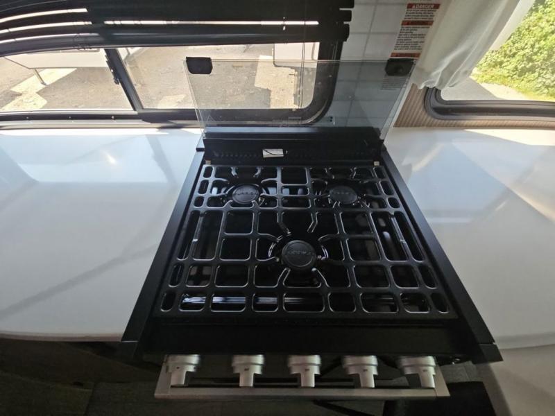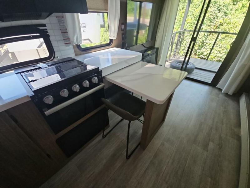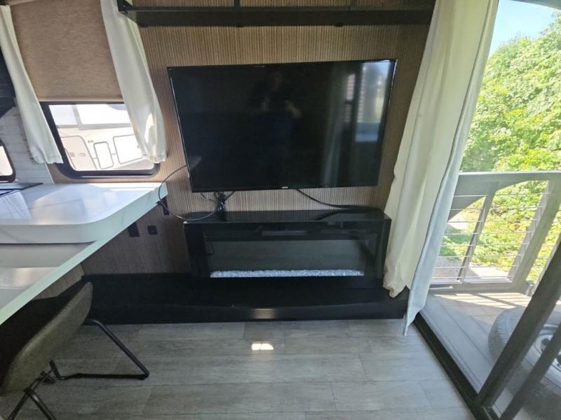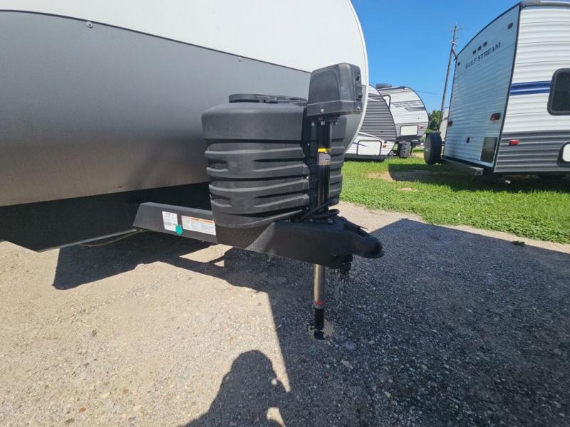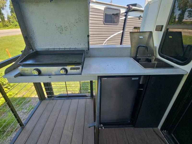 This travel trailer will feel more like home with its rear veranda/porch, dual entry doors, and front master bedroom! There is an outdoor kitchen on the back porch so you can make lunch in the fresh air, and the patio doors lead right into the main living area. Your crew can relax on the L-shaped sofa across from the fireplace, which will make your space more cozy. The U-shaped kitchen counter includes a pull-out table for even more counter space, and the walk-thru bath is easily accessible for everyone to use. You will love having your own space in the master bedroom, and the Versa-Tilt custom king bed will let you sit up in bed to read your book at night. One of the dual entry doors is also found here for added convenience!