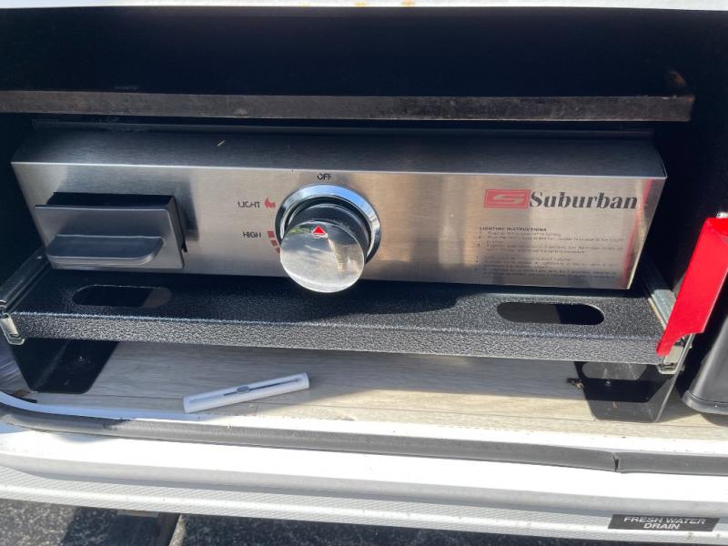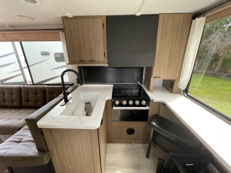Enjoy your surroundings with 64 square feet of windows! The rear kitchen features 18 linear feet of wrap-around counter space including a double sink and oversized refrigerator. There are bar stools for dining inside along the rear counter, and an L-shaped chaise lounge for additional seating in the open living area. The Versa Slide contains the hidden hinged mattress with a mattress below, along with a desk and storage cubbies for your things. There is also a pantry, fireplace, and oversized refrigerator within this slide as well. The front private bedroom features a Versa-Tilt custom king bed with a bedside closet, plus overhead storage. You will also find additional storage in a large pass-through beneath on the exterior, and the exterior camp kitchen is sure to be a big hit with the cook!