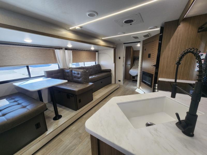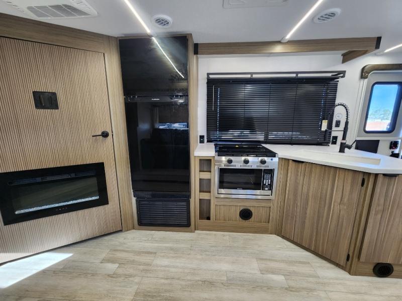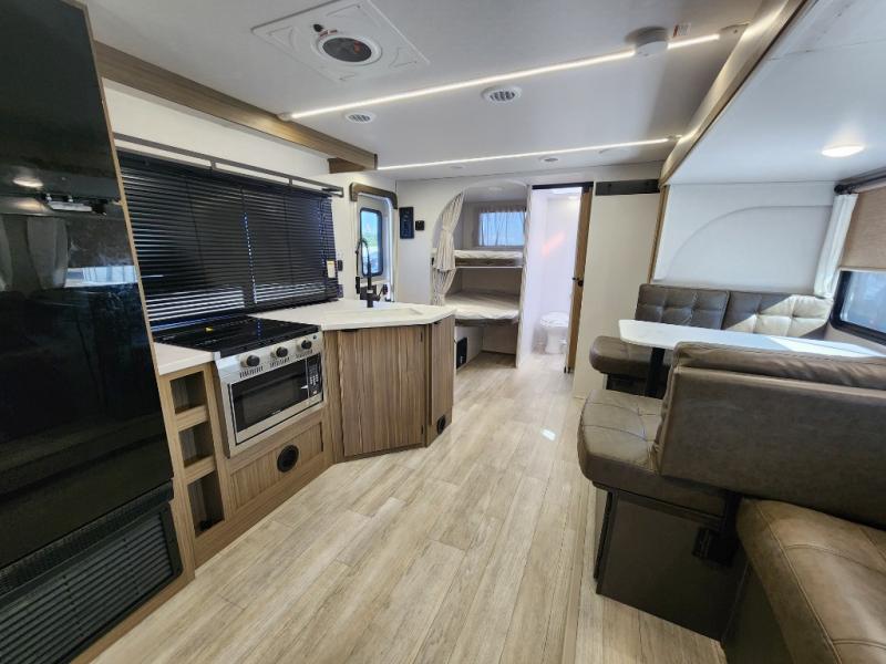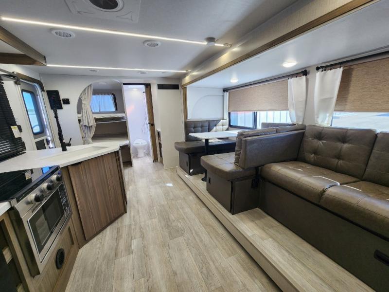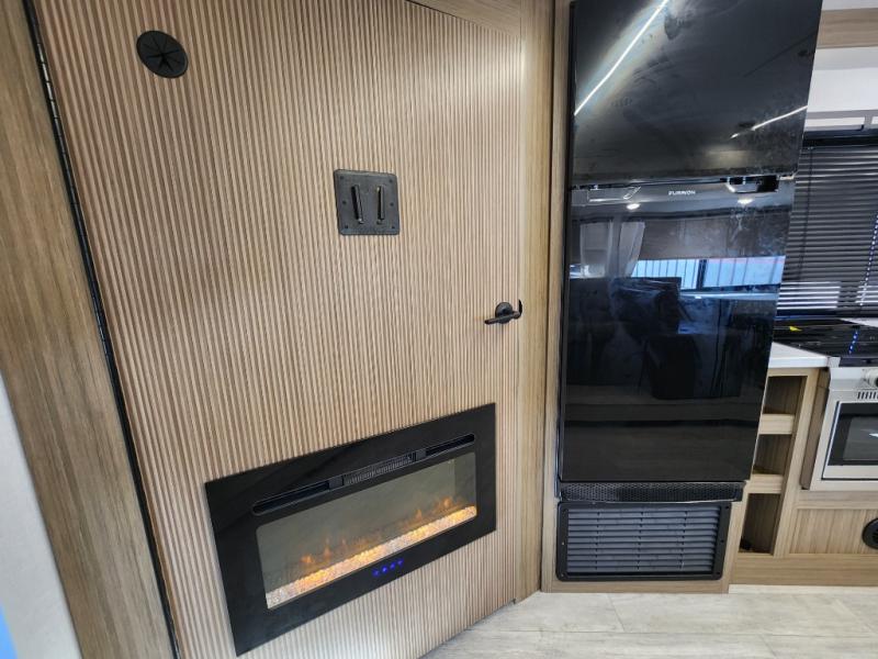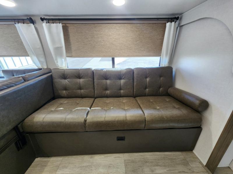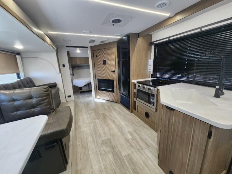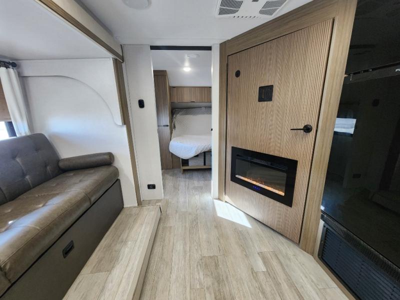 You're sure to make camping memories in this spacious travel trailer! You can easily sleep eight people each night thanks to the double-size bunks, the custom king bed with Versa Tilt in the front bedroom plus the Versa-Lounge within the large slide out! The full kitchen will let you make meals each day, and you'll appreciate the hidden pantry with shelves behind the fireplace. There is also a booth dinette where you can dine together or play a game of cards after dinner is cleaned up, or you may just find yourselves outdoors under the 16' awning. And don't overlook the full bath, complete with a tub/shower that will make bath time easier if you have little ones.
