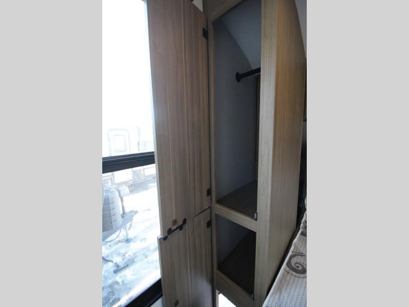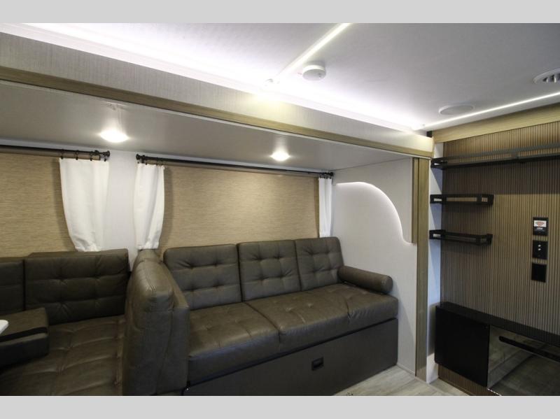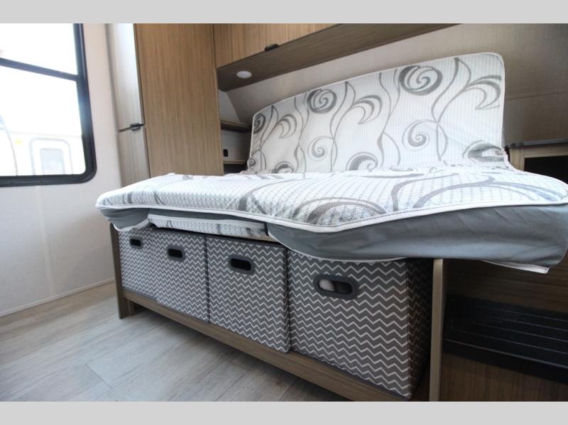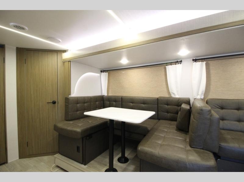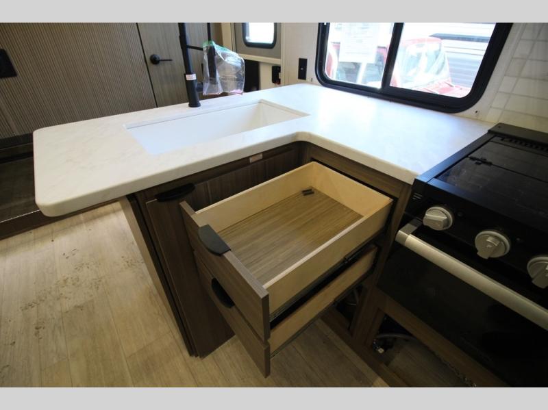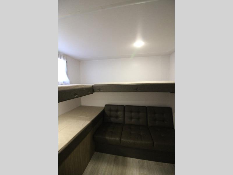 If you like to travel with a large crew, choose this Wildwood X-Lite travel trailer! This trailer has two private sleeping spaces with a private bedroom up front and a private bunkhouse in the back. Not only does the bunkhouse have three bunk beds, but it also has a closet for storage and a jiffy sofa for lounging. In the main living area, there is a large slide that holds the U-shaped dinette and sofa. These pieces of furniture are a part of the Versa Lounge, and you can customize them to function as you need them to. The panoramic windows surround the dinette and sofa so that you can take in the scenic views while you relax. You even have an outdoor camp kitchen to make it more convenient.