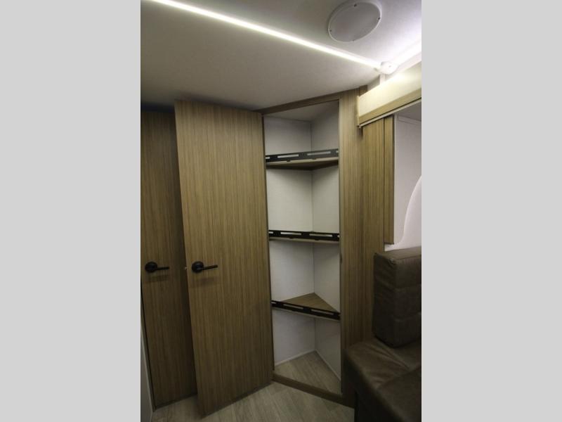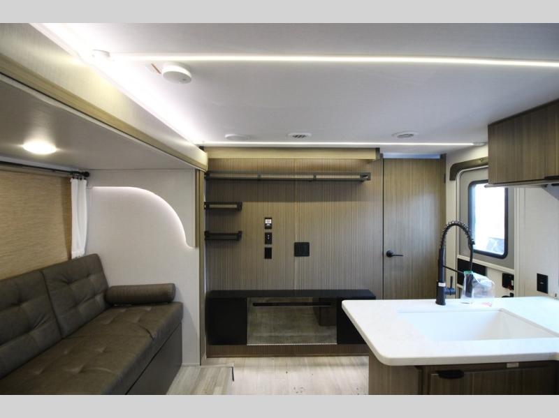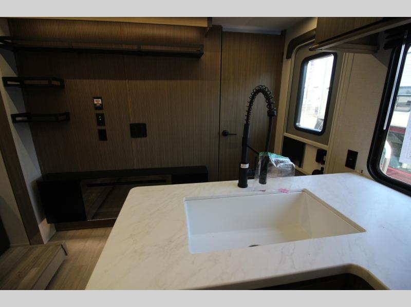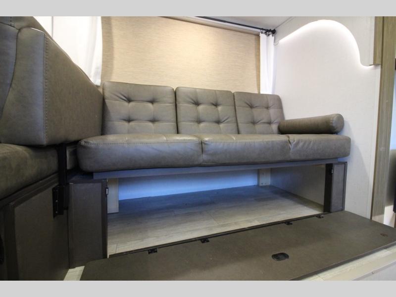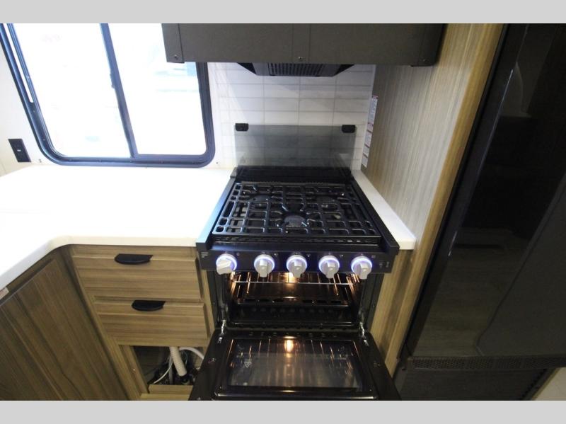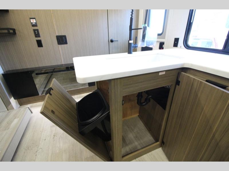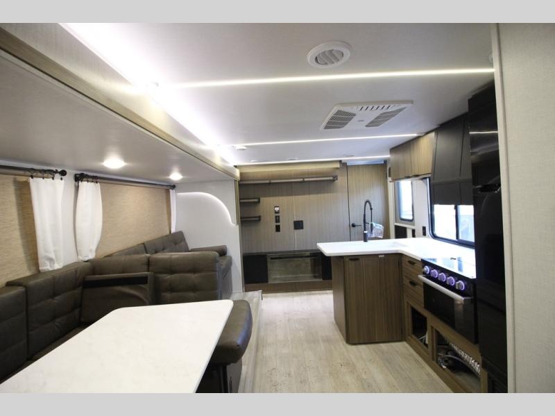 If you like to travel with a large crew, choose this Wildwood X-Lite travel trailer! This trailer has two private sleeping spaces with a private bedroom up front and a private bunkhouse in the back. Not only does the bunkhouse have three bunk beds, but it also has a closet for storage and a jiffy sofa for lounging. In the main living area, there is a large slide that holds the U-shaped dinette and sofa. These pieces of furniture are a part of the Versa Lounge, and you can customize them to function as you need them to. The panoramic windows surround the dinette and sofa so that you can take in the scenic views while you relax. You even have an outdoor camp kitchen to make it more convenient.