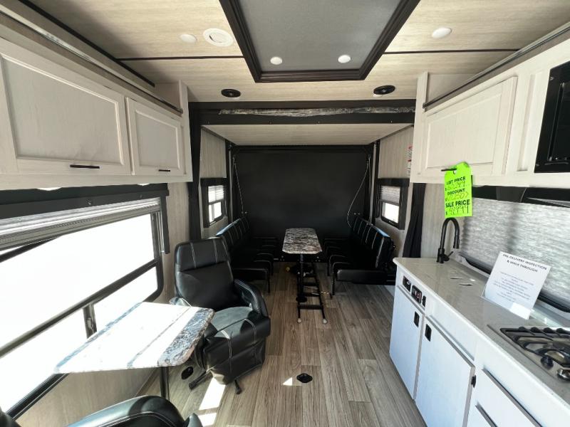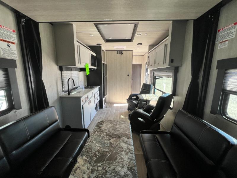 Step into the 2025 Genesis Supreme R2515FSXL and you’ll immediately notice how effortlessly it blends rugged capability with a comfortable, well-designed living space. Built for adventure, the spacious toy hauler garage offers generous room for your gear while easily converting into a welcoming lounge area once you’ve reached camp. The open interior features opposing sofas with an overhead bed, creating a flexible gathering space for relaxing after a long day on the trail. A well-equipped kitchen with a three-burner cooktop, microwave, and ample storage makes preparing meals simple and convenient while you’re on the road.