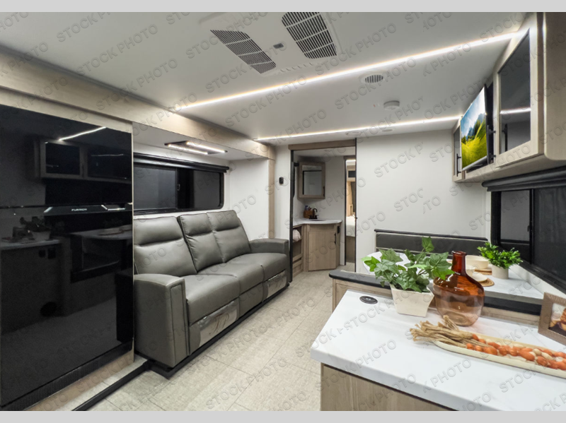 Outdoor Fun – 20' electric awning with LED lighting creates a shaded lounge area for dining or relaxing outdoors.