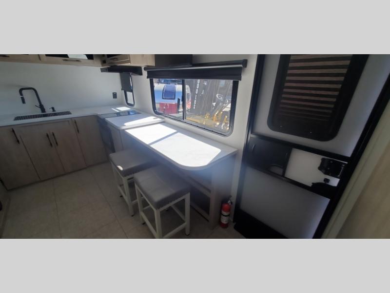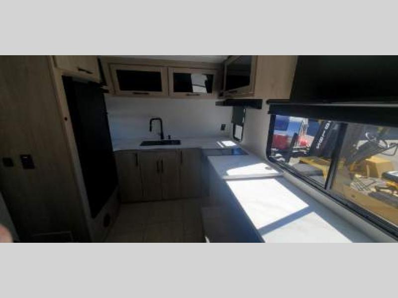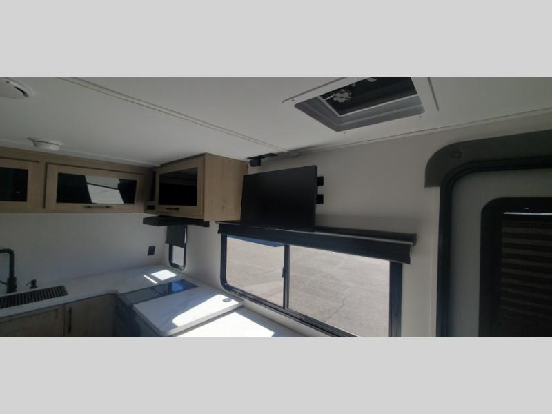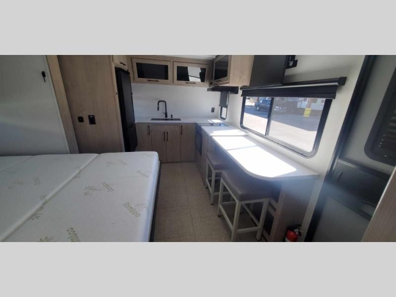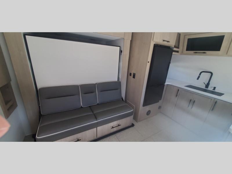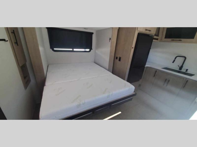 This simple, but cozy travel trailer is sure to meet all of your camping needs. There is a full rear bath with a shower skylight and wardrobe to keep your things tidy. The front kitchen includes ample counter space to prep meals and a bar tabletop dinette with three stools you are sure to love. A two burner cooktop also comes standard, along with a convection microwave, and an exterior griddle for when you want to cook outdoors under the 12' awning! The versatile Murphy bed provides seating and sleeping space each day, and the hi-definition LED TV across from the bed will let you watch movies at night.