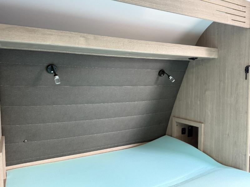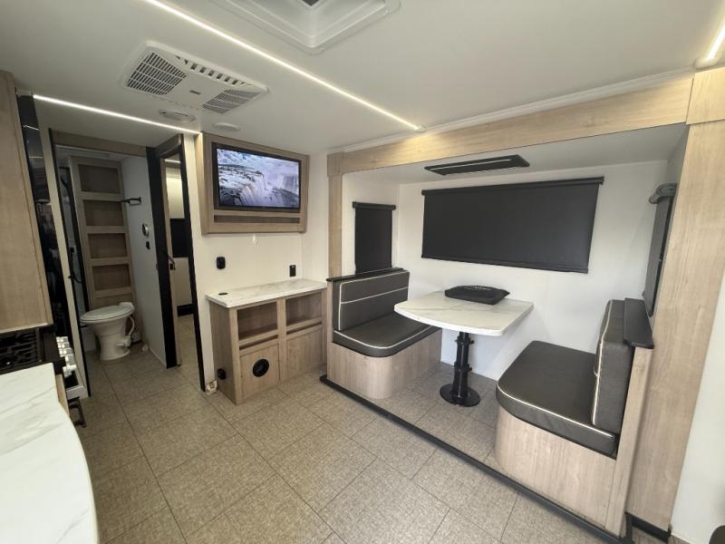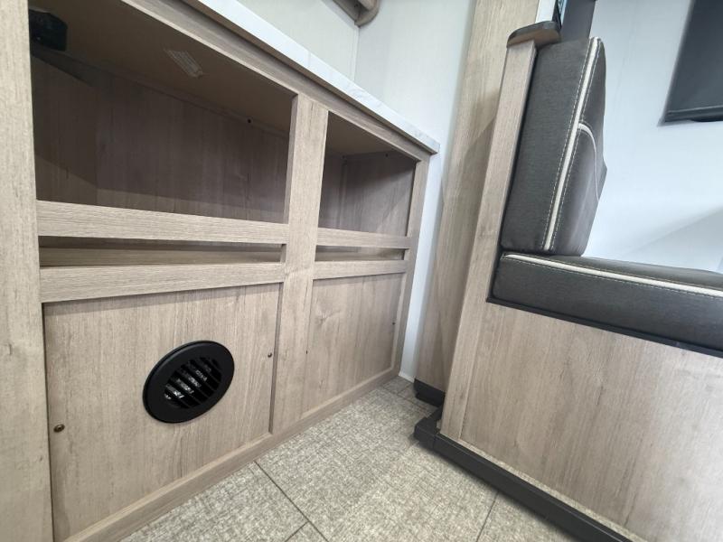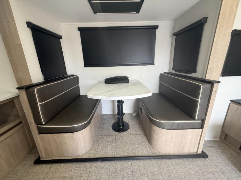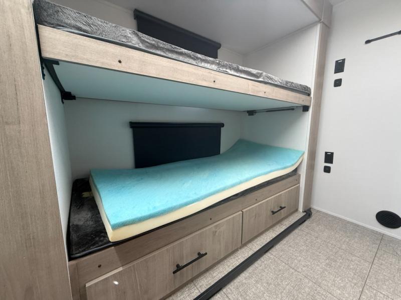 In the slide-out area, double bunk beds create a dedicated sleeping area for kids or guests, while the booth dinette provides another place to relax, eat meals, or convert into additional sleeping space.