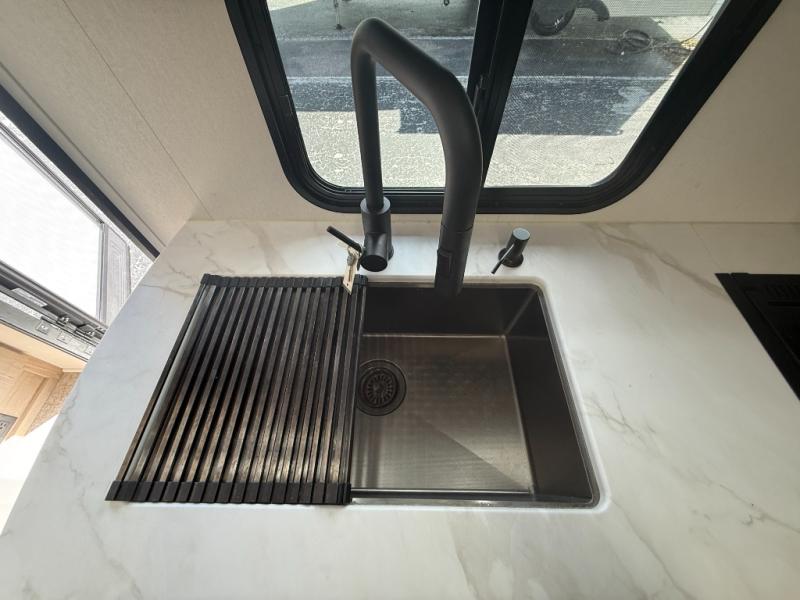 Grand Design also designed this trailer with smart storage solutions throughout, including overhead cabinets, wardrobe space, and exterior pass-through storage for camping gear.