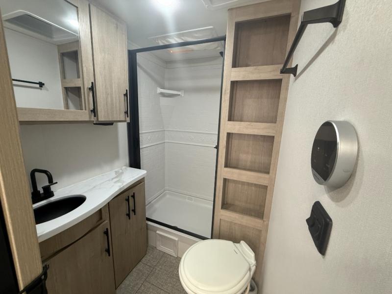 The rear corner bathroom includes a walk-in shower, toilet, and vanity, giving you the comfort and privacy you want after a long day outdoors.