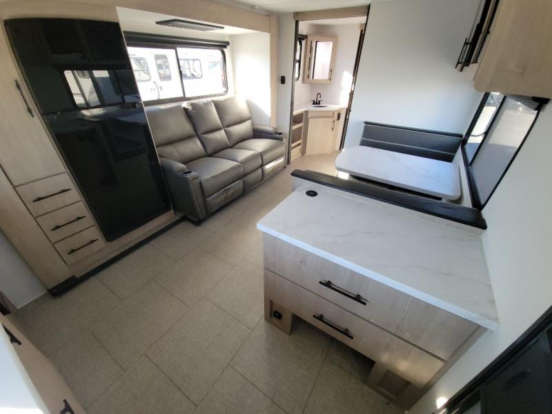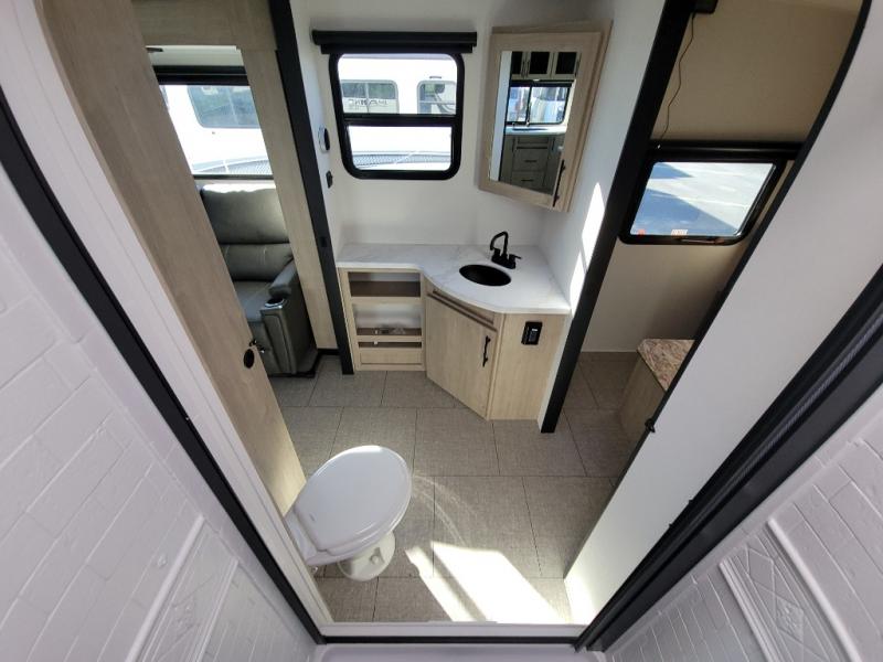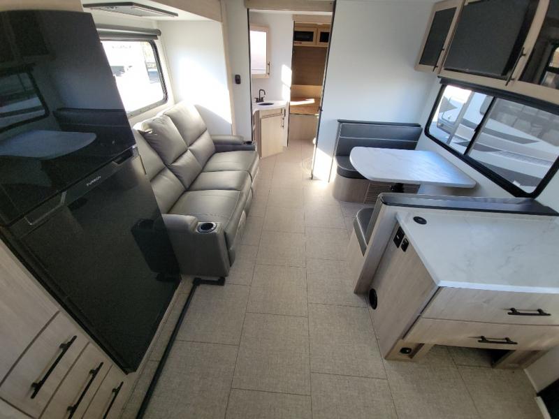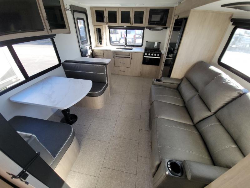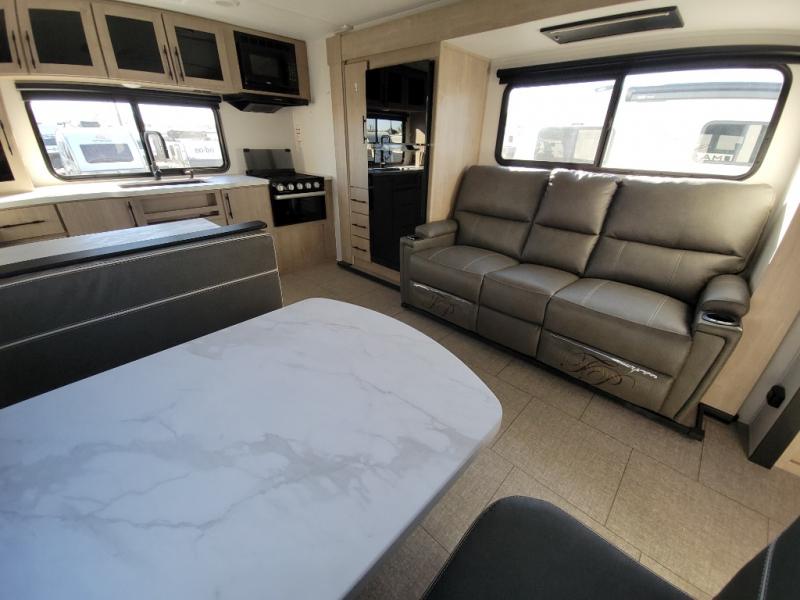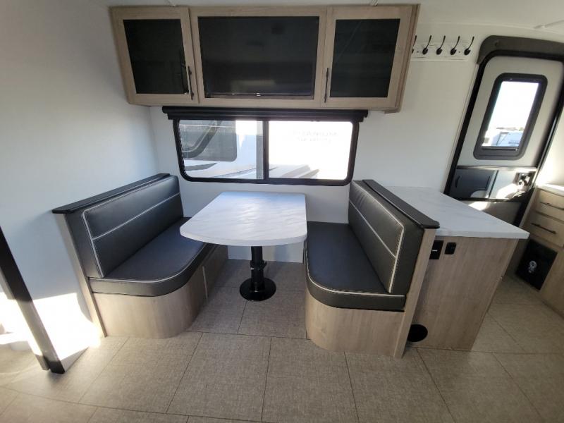 Treat yourself to a weekend of fun in this Imagine XLS travel trailer! Whether it's just you and your spouse, or you've chosen to bring along a group of friends, this trailer will meet the need. The front bedroom can sleep two people on the walk-around queen-size bed. The bedroom is quite functional because it not only contains the second exterior entry door, but it also has a private entrance into the walk-through bathroom since it is located on the other side of the bathroom. The booth dinette is functional too because it can transform from a dining location into a sleeping location, and the theater seating is directly across from the LED TV for easy viewing.