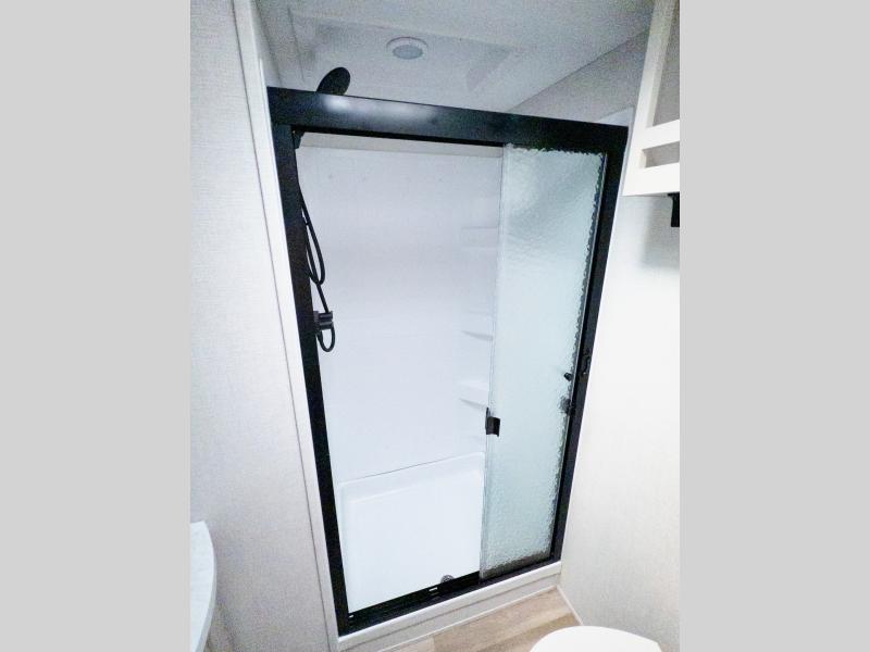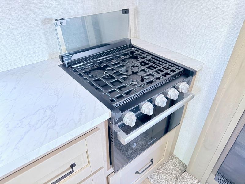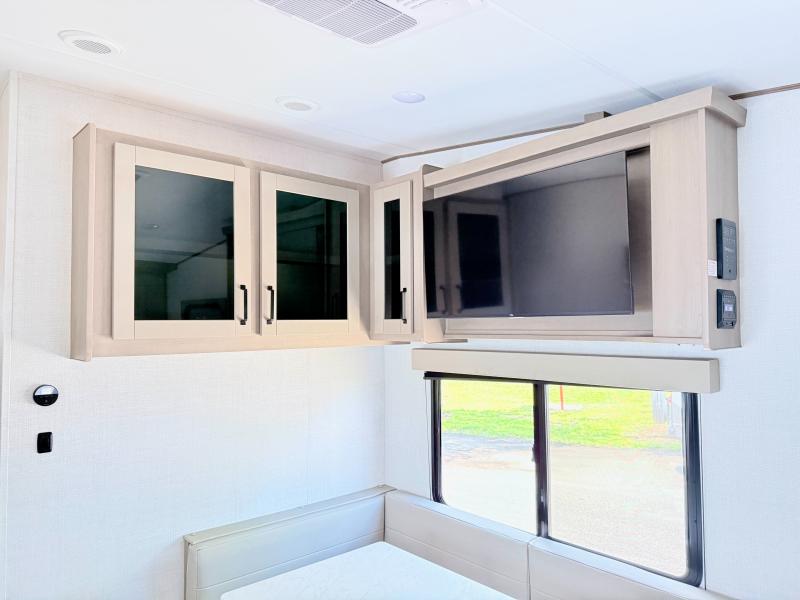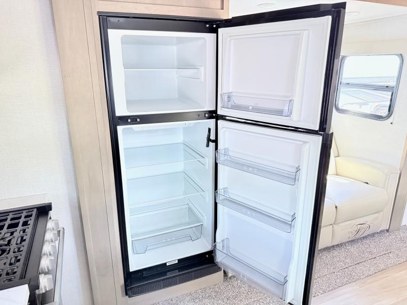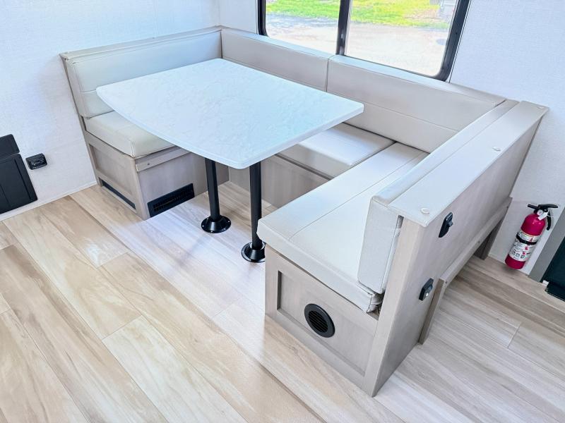 This rear kitchen fifth wheel is sure to meet all of your camping needs! Since the exterior length is only 26' 11", you can easily maneuver in and out of campgrounds. The rear kitchen includes ample counter space to prep meals, a three burner cooktop, and overhead storage for all your necessities. There is a 10 cu. ft. 12V refrigerator within the slide out that also includes the theater seating, and the U-shaped dinette provides a place to dine or play a card game. You will appreciate having convenient storage by the entry door, along with pull-out pet bowls, a functional wardrobe closet in the bedroom and an exterior pass-thru for belongings and camping gear. When you're ready to turn in for the night, the queen bed is sure to bring a great night's rest, while your guests sleep on the booth dinette or optional tri-fold sofa if you replace the theater seating!
