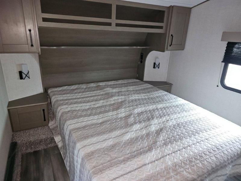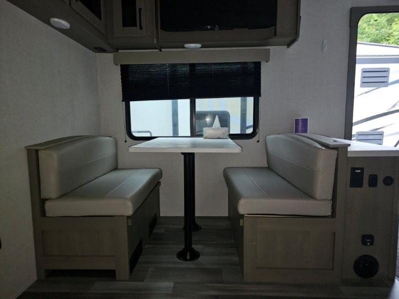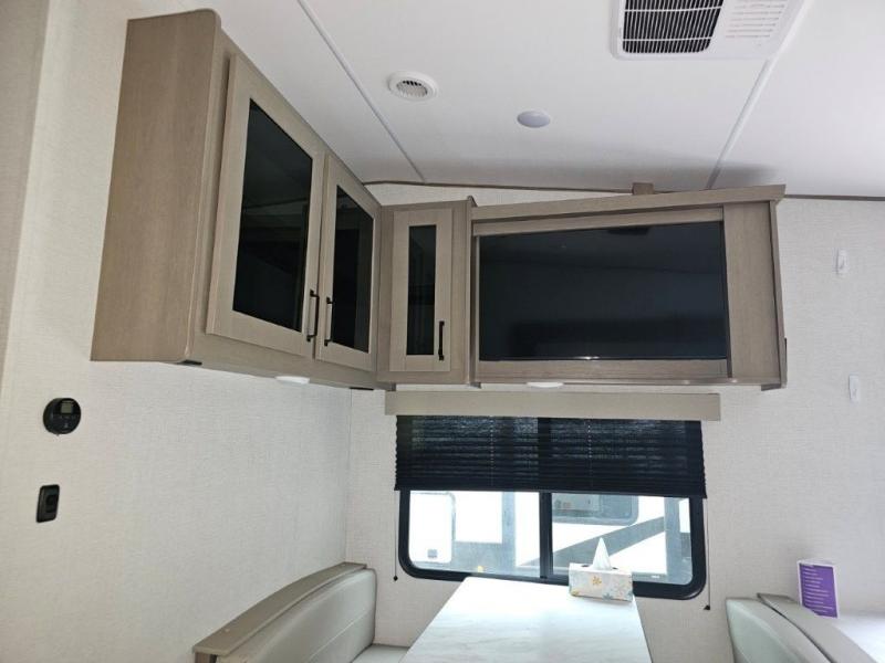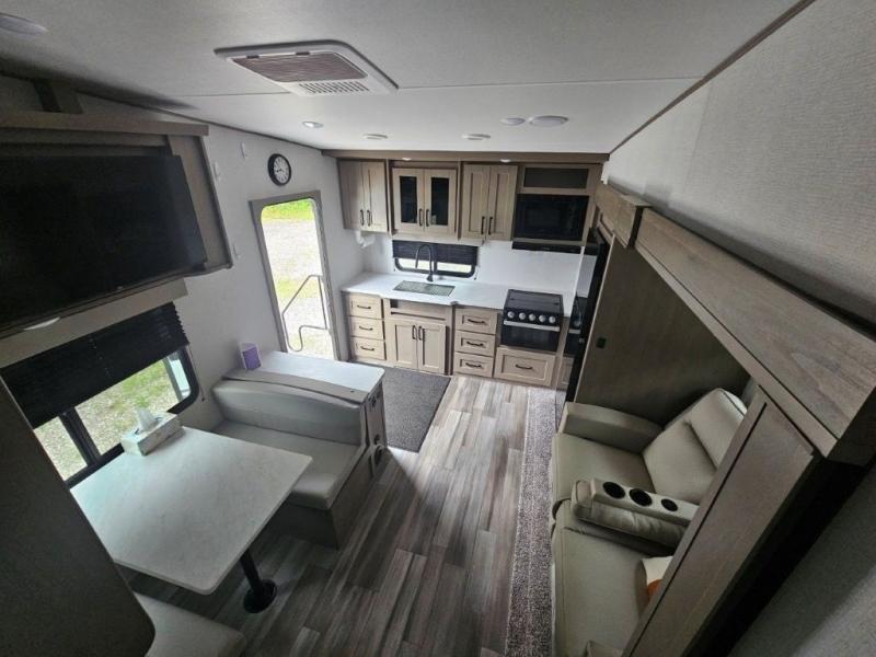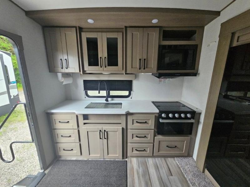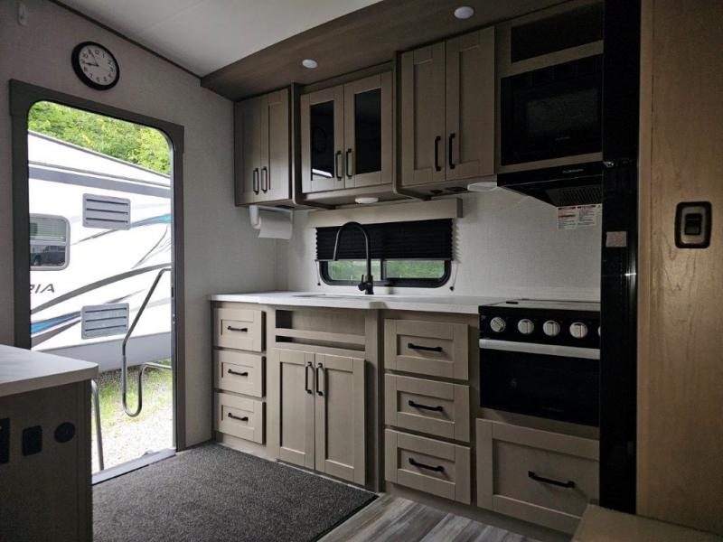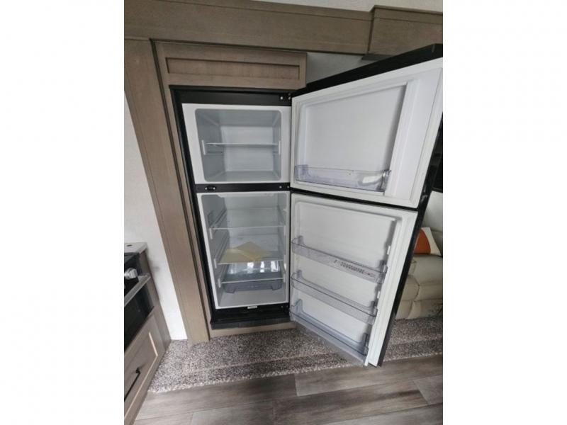 This rear kitchen fifth wheel is sure to meet all of your camping needs! Since the exterior length is only 26' 11", you can easily maneuver in and out of campgrounds. The rear kitchen includes ample counter space to prep meals, a three burner cooktop, and overhead storage for all your necessities. There is a 10 cu. ft. 12V refrigerator within the slide out that also includes the theater seating, and the U-shaped dinette provides a place to dine or play a card game. You will appreciate having convenient storage by the entry door, along with pull-out pet bowls, a functional wardrobe closet in the bedroom and an exterior pass-thru for belongings and camping gear. When you're ready to turn in for the night, the queen bed is sure to bring a great night's rest, while your guests sleep on the booth dinette or optional tri-fold sofa if you replace the theater seating!