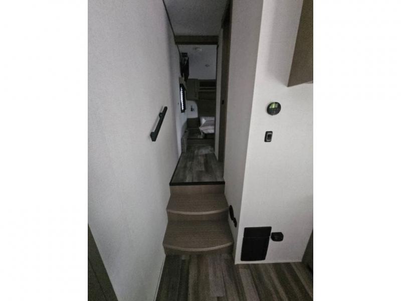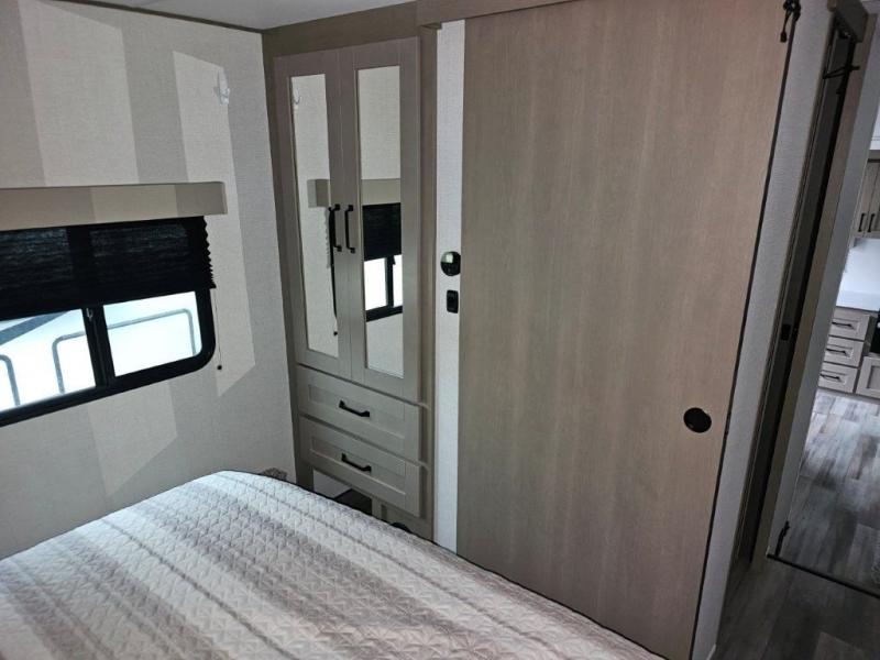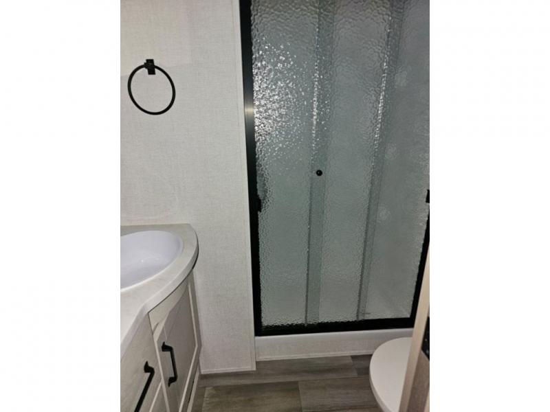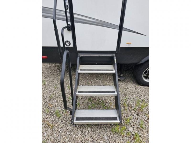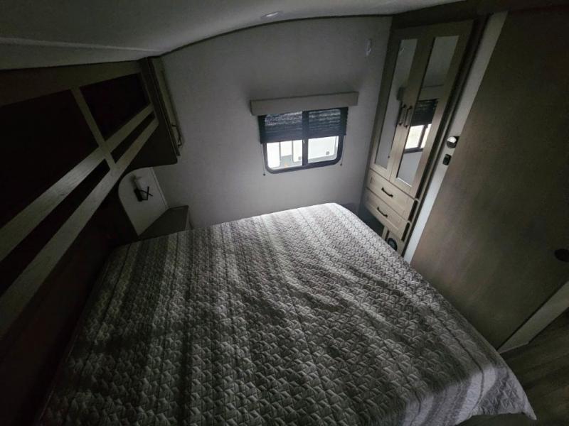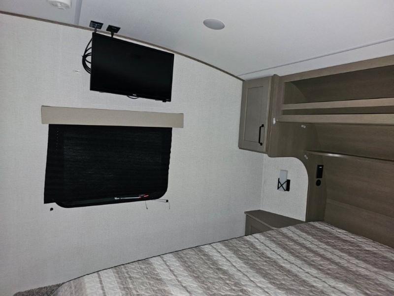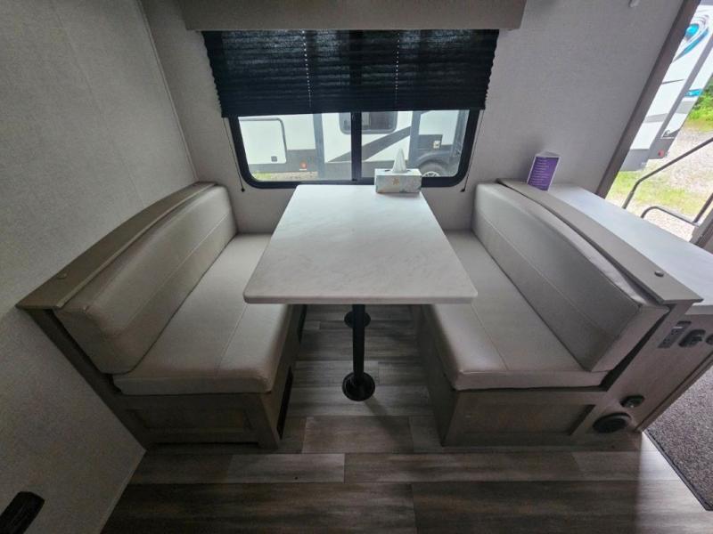 This rear kitchen fifth wheel is sure to meet all of your camping needs! Since the exterior length is only 26' 11", you can easily maneuver in and out of campgrounds. The rear kitchen includes ample counter space to prep meals, a three burner cooktop, and overhead storage for all your necessities. There is a 10 cu. ft. 12V refrigerator within the slide out that also includes the theater seating, and the U-shaped dinette provides a place to dine or play a card game. You will appreciate having convenient storage by the entry door, along with pull-out pet bowls, a functional wardrobe closet in the bedroom and an exterior pass-thru for belongings and camping gear. When you're ready to turn in for the night, the queen bed is sure to bring a great night's rest, while your guests sleep on the booth dinette or optional tri-fold sofa if you replace the theater seating!