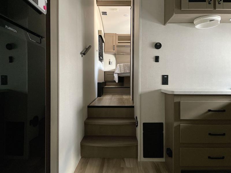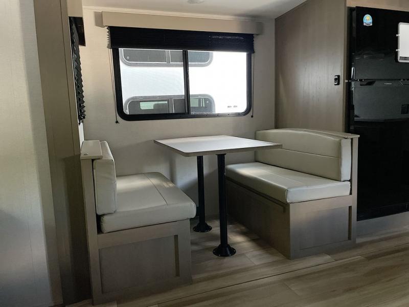 This is the perfect couple's trailer with a space for an overnight guest or two little ones on the booth dinette. You can switch out this dinette for an optional swivel dinette as well, and the standard theater seating can be replaced by an optional trundle bed if you need more sleeping space. A 40" HDTV will keep you entertained when the weather isn't cooperating, and you can whip up your best meals in the full kitchen. And a 19' power awning will provide shade if you choose to take your plate outdoors! The spacious full bath will let you clean up each day, and you'll feel right at home in the front private bedroom with a queen bed!