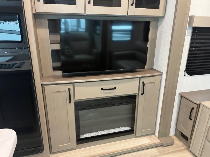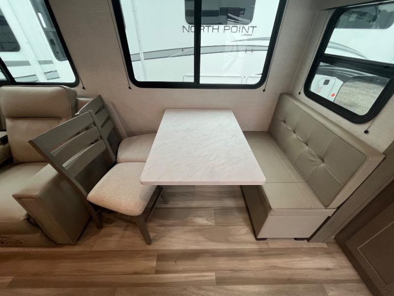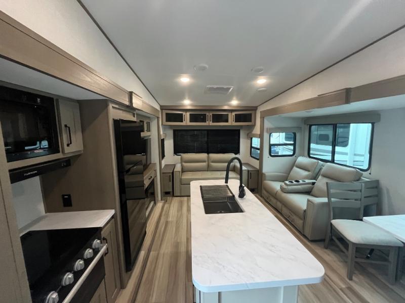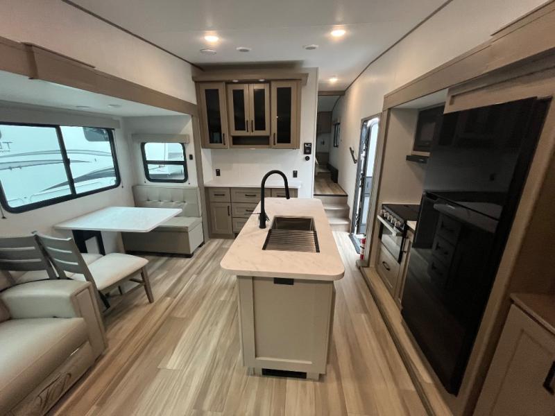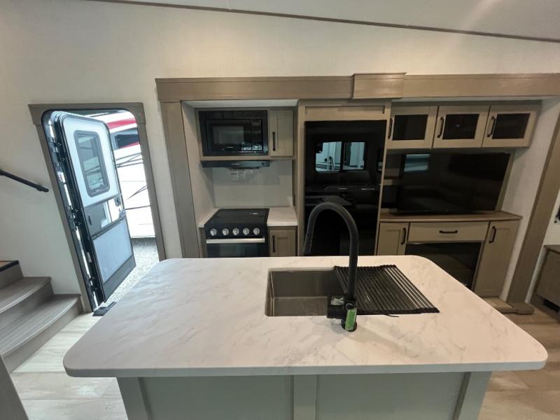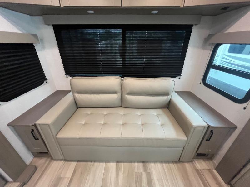 You'll love the amount of space you have in this fifth wheel thanks to the dual opposing slides in the rear living area/kitchen. Your friends and family can relax on the tri-fold sofa or theater seating across from the high-definition 40" LED TV. There is also a booth dinette or you can choose the optional swivel dinette if you prefer that seating. The chef of your group will appreciate having a kitchen island that will provide more counter space, plus there is a hutch with overhead cabinets for nice dishes. A full bath onboard lets you clean up each day and the front private bedroom includes a queen bed just like at home. You'll also love spending time outdoors under the electric awning, and there is an unobstructed pass-thru storage for fishing poles, hiking gear, and camp chairs!