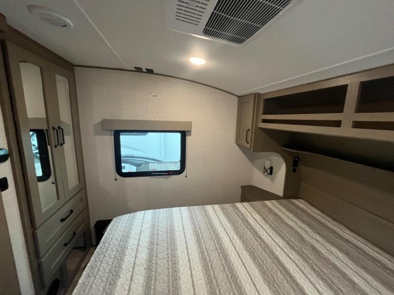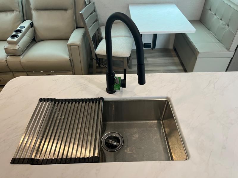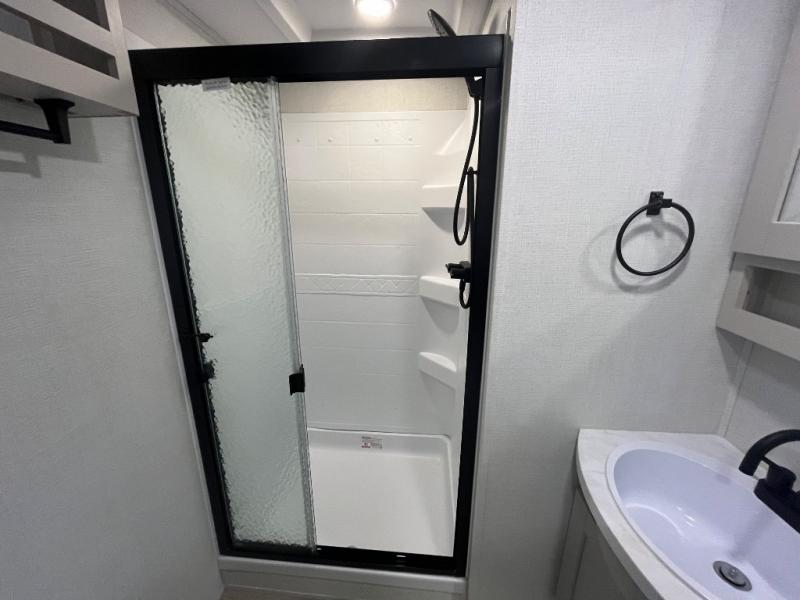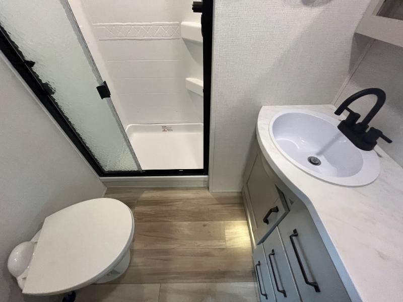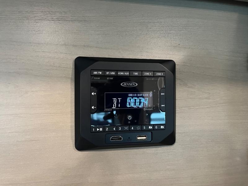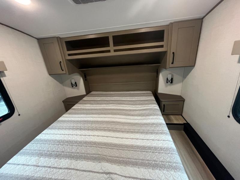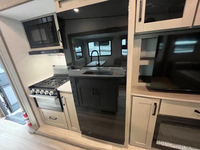 You'll love the amount of space you have in this fifth wheel thanks to the dual opposing slides in the rear living area/kitchen. Your friends and family can relax on the tri-fold sofa or theater seating across from the high-definition 40" LED TV. There is also a booth dinette or you can choose the optional swivel dinette if you prefer that seating. The chef of your group will appreciate having a kitchen island that will provide more counter space, plus there is a hutch with overhead cabinets for nice dishes. A full bath onboard lets you clean up each day and the front private bedroom includes a queen bed just like at home. You'll also love spending time outdoors under the electric awning, and there is an unobstructed pass-thru storage for fishing poles, hiking gear, and camp chairs!