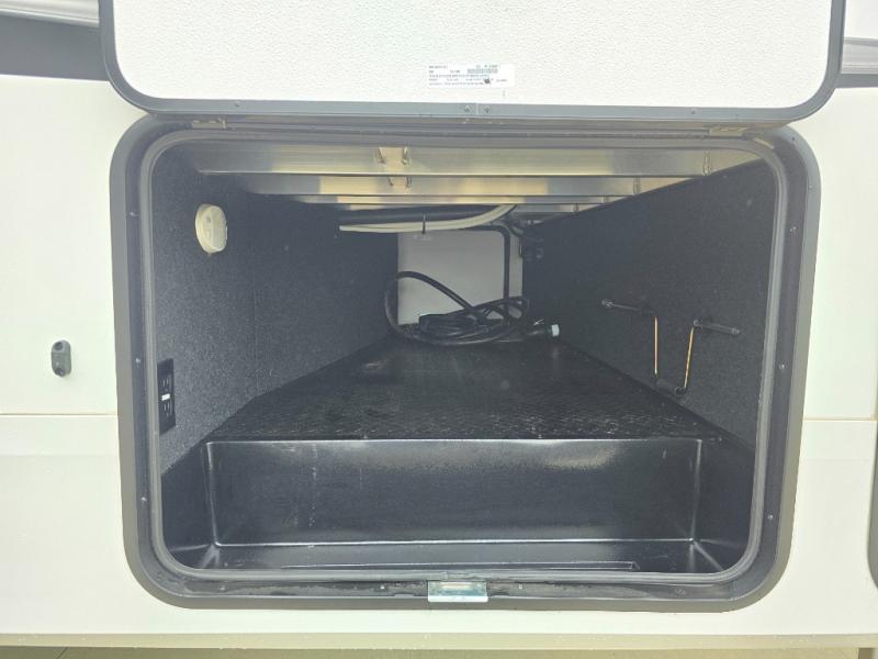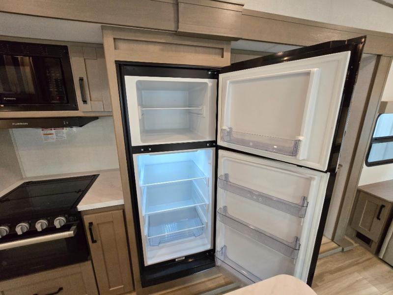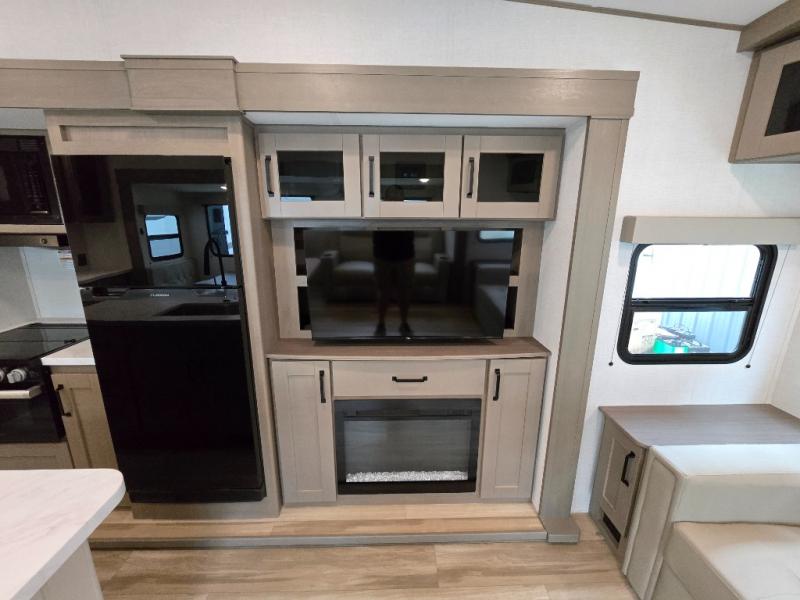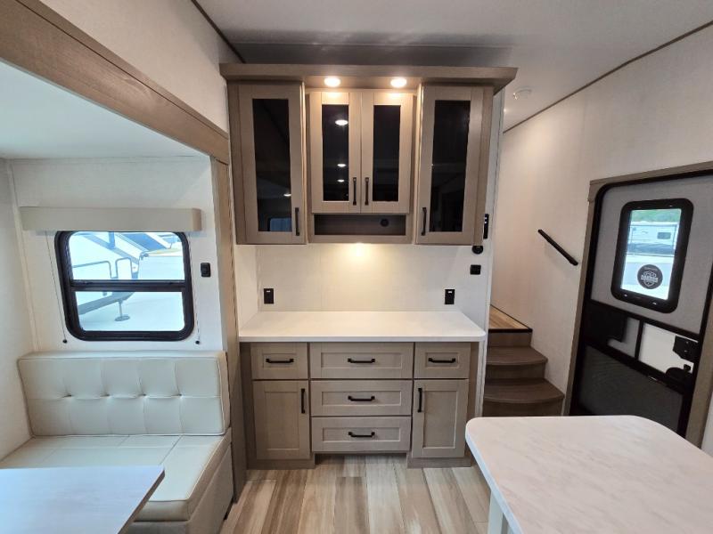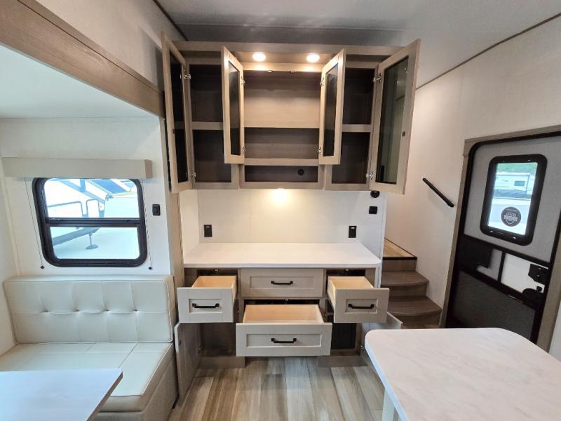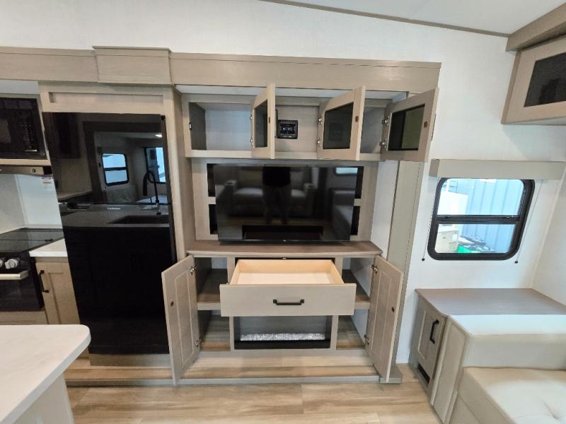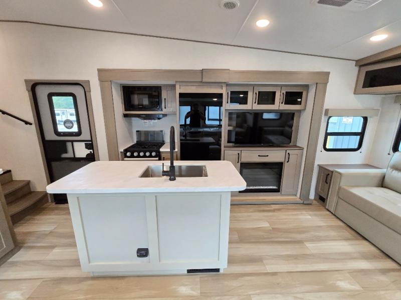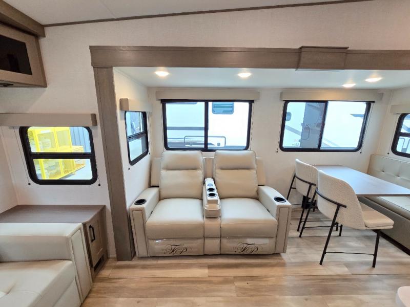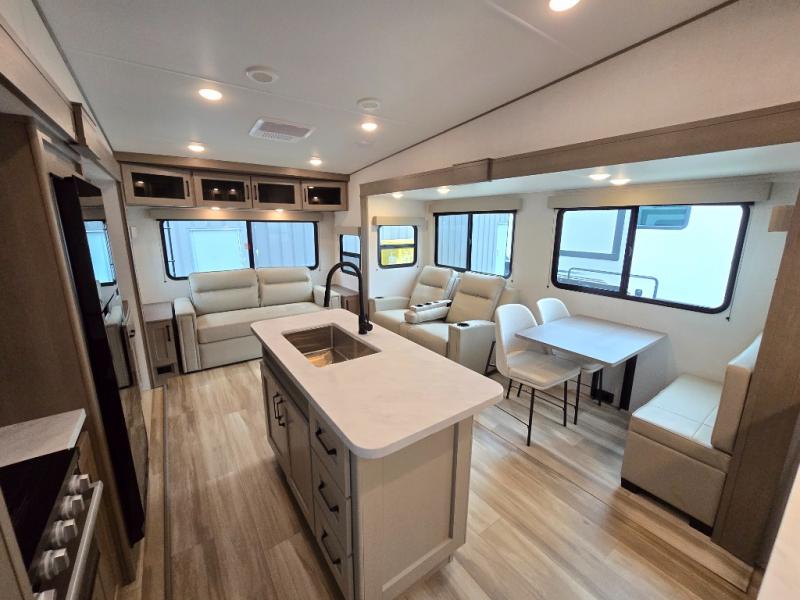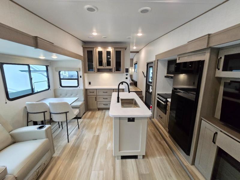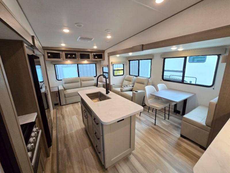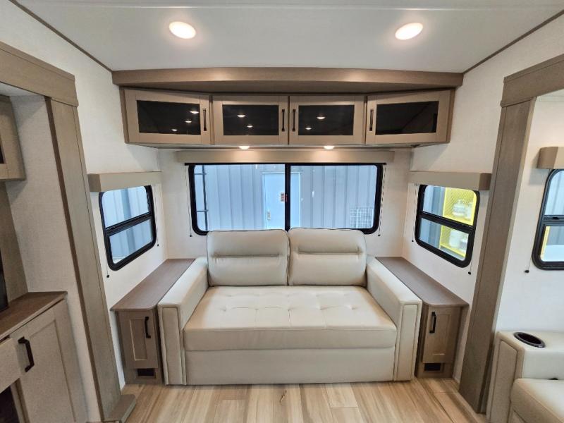 You'll love the amount of space you have in this fifth wheel thanks to the dual opposing slides in the rear living area/kitchen. Your friends and family can relax on the tri-fold sofa or theater seating across from the high-definition 40" LED TV. There is also a booth dinette or you can choose the optional swivel dinette if you prefer that seating. The chef of your group will appreciate having a kitchen island that will provide more counter space, plus there is a hutch with overhead cabinets for nice dishes. A full bath onboard lets you clean up each day and the front private bedroom includes a queen bed just like at home. You'll also love spending time outdoors under the electric awning, and there is an unobstructed pass-thru storage for fishing poles, hiking gear, and camp chairs!