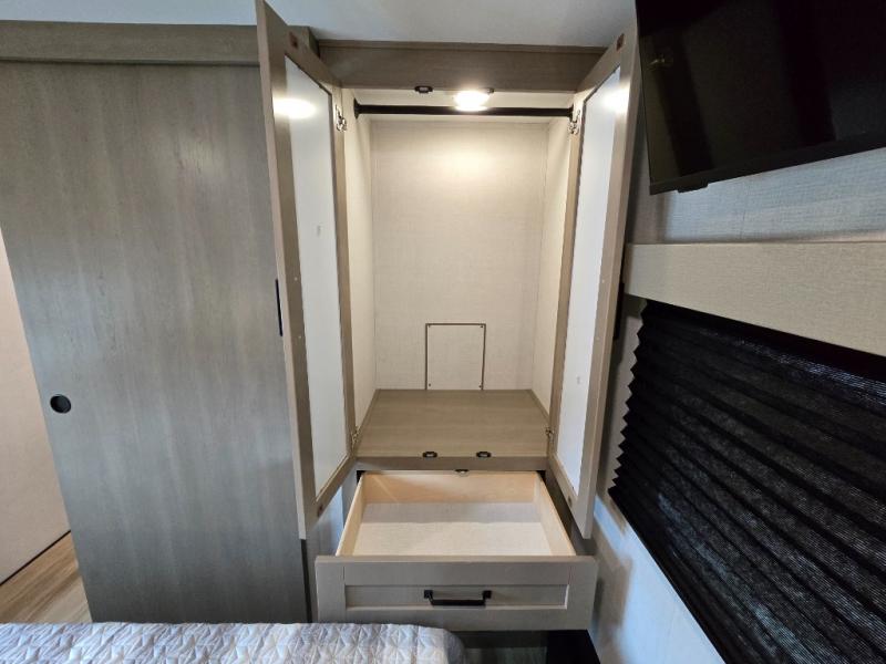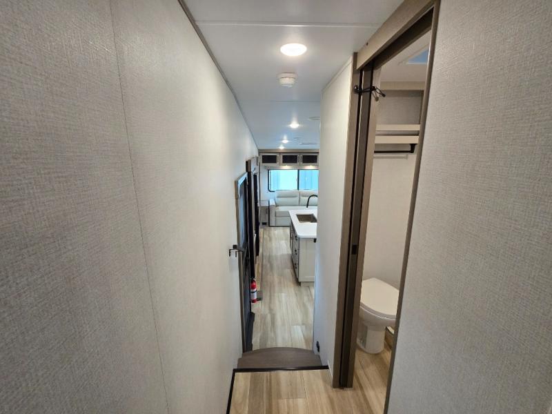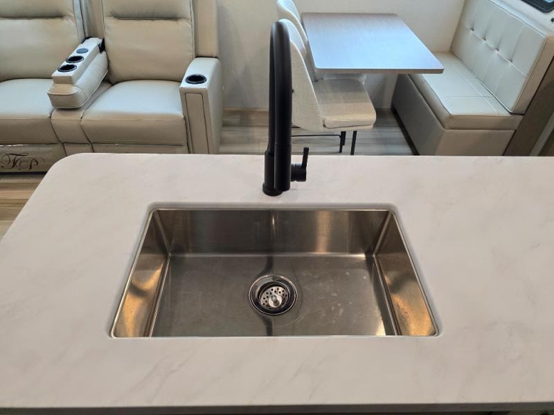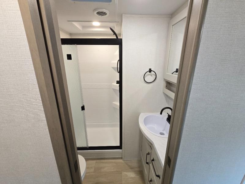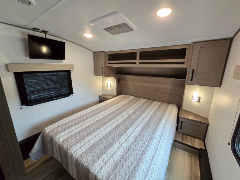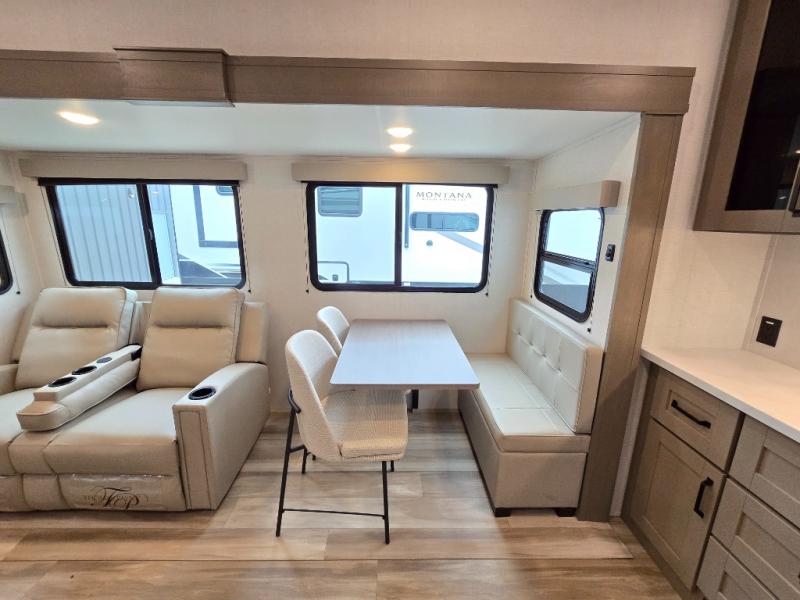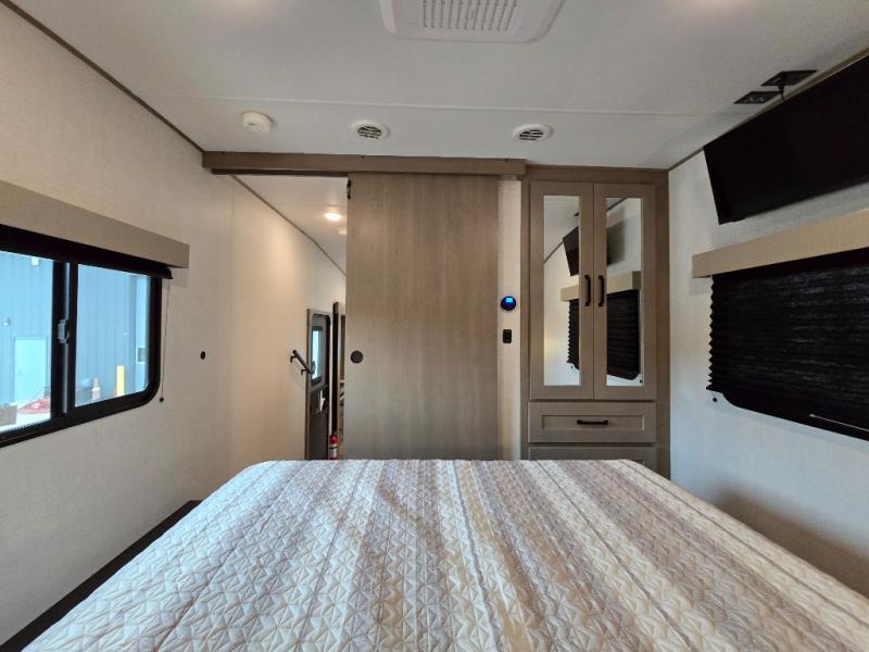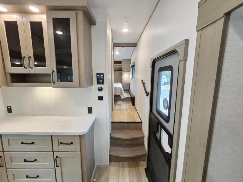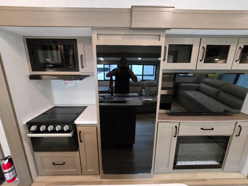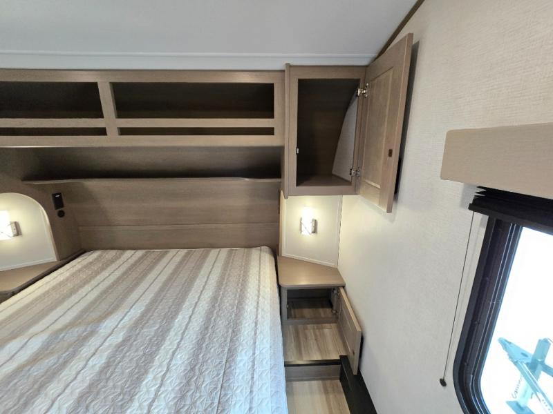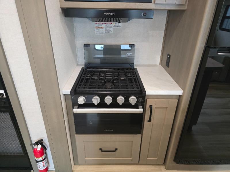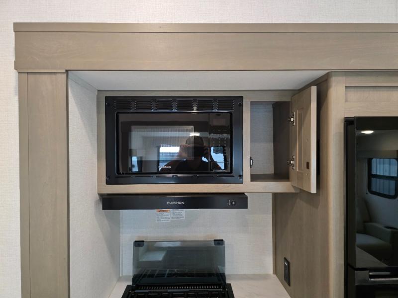 You'll love the amount of space you have in this fifth wheel thanks to the dual opposing slides in the rear living area/kitchen. Your friends and family can relax on the tri-fold sofa or theater seating across from the high-definition 40" LED TV. There is also a booth dinette or you can choose the optional swivel dinette if you prefer that seating. The chef of your group will appreciate having a kitchen island that will provide more counter space, plus there is a hutch with overhead cabinets for nice dishes. A full bath onboard lets you clean up each day and the front private bedroom includes a queen bed just like at home. You'll also love spending time outdoors under the electric awning, and there is an unobstructed pass-thru storage for fishing poles, hiking gear, and camp chairs!