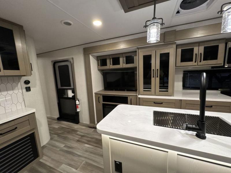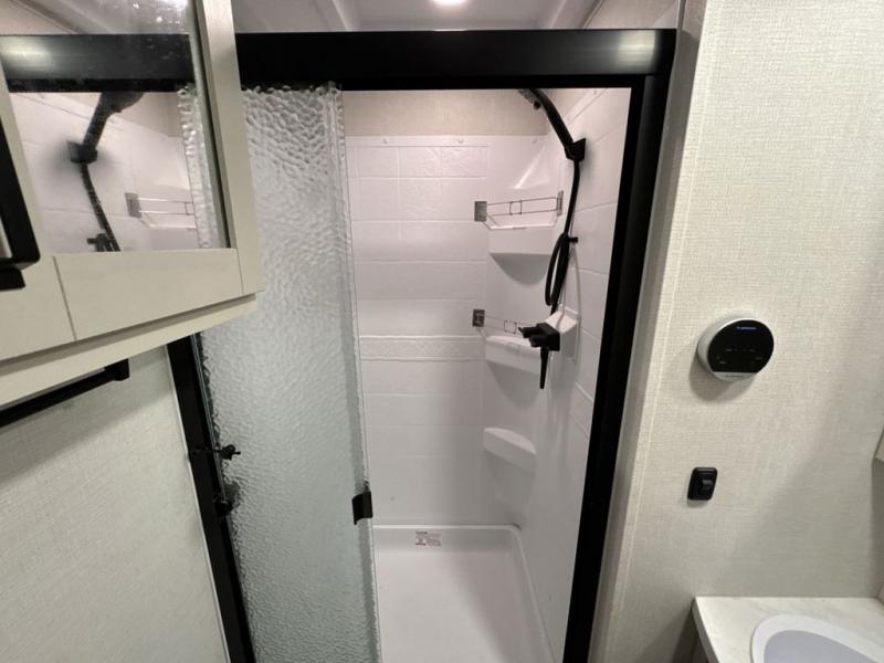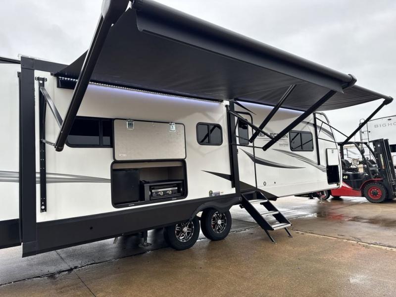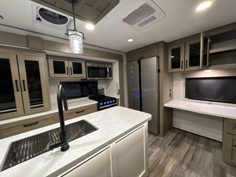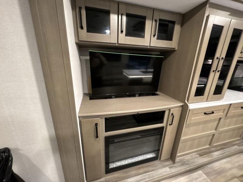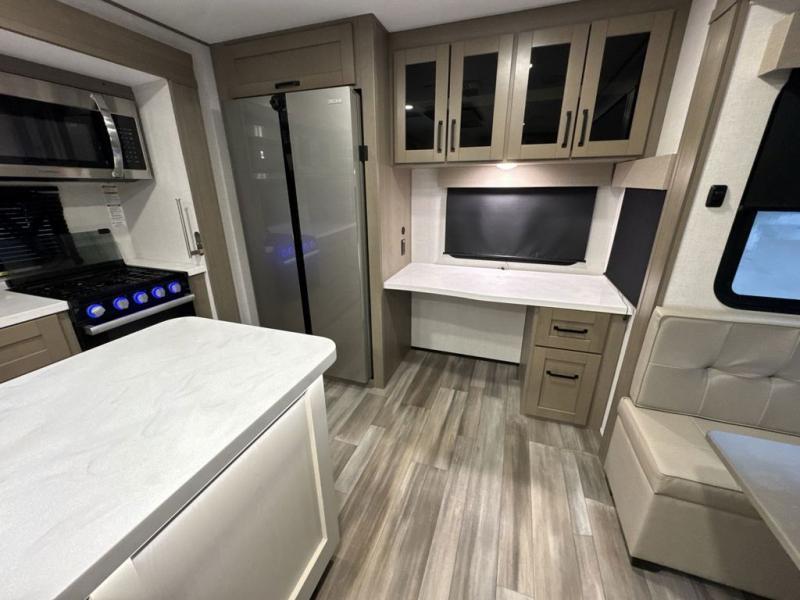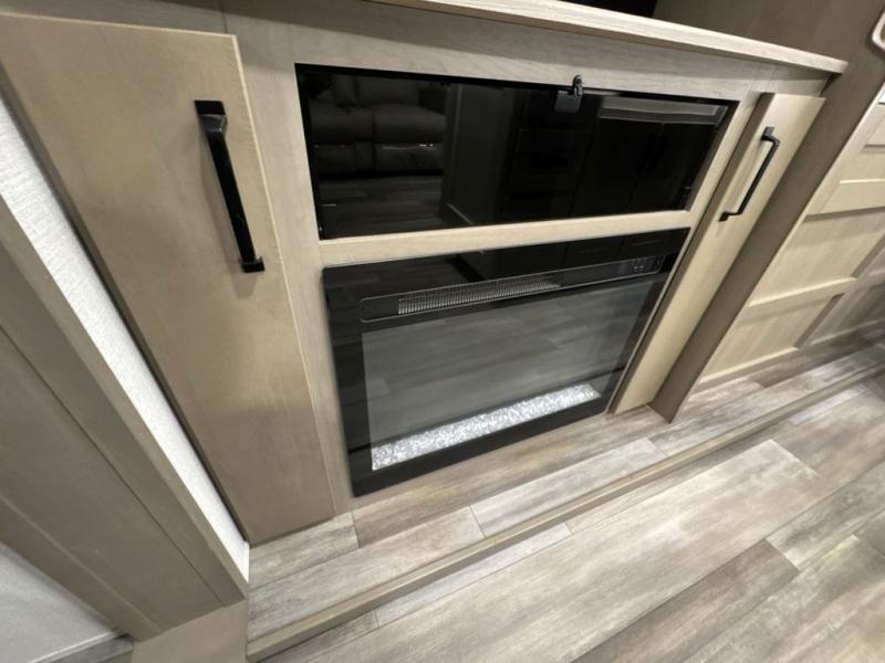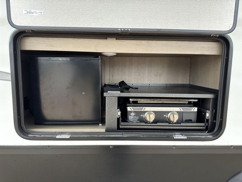 Enjoy a home away from home with this travel trailer! The chef will enjoy cooking either indoors in the rear kitchen with the kitchen island, hutch, and three burner cooktop, or outdoors with the outside griddle and outside 1.6 cu. ft. refrigerator to drink a cold beverage while grilling burgers. If mother nature rains on your parade then you can head indoors and either play games at the booth dinette or relax on the theater seating across from the entertainment center with a 40" TV and fireplace. Rinse the sand out of your hair in the full bathroom with the 30" x 36" shower then head to the front private bedroom and lay down on the queen bed slide which can be replace for an optional king bed.