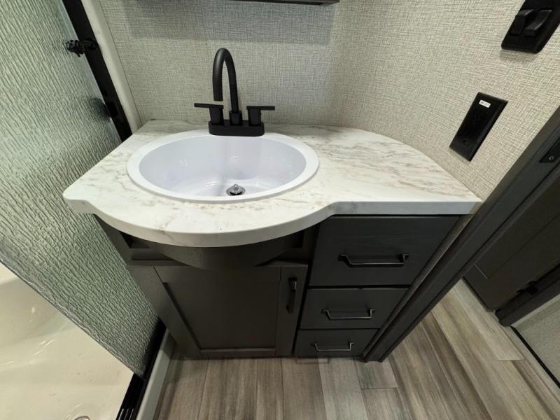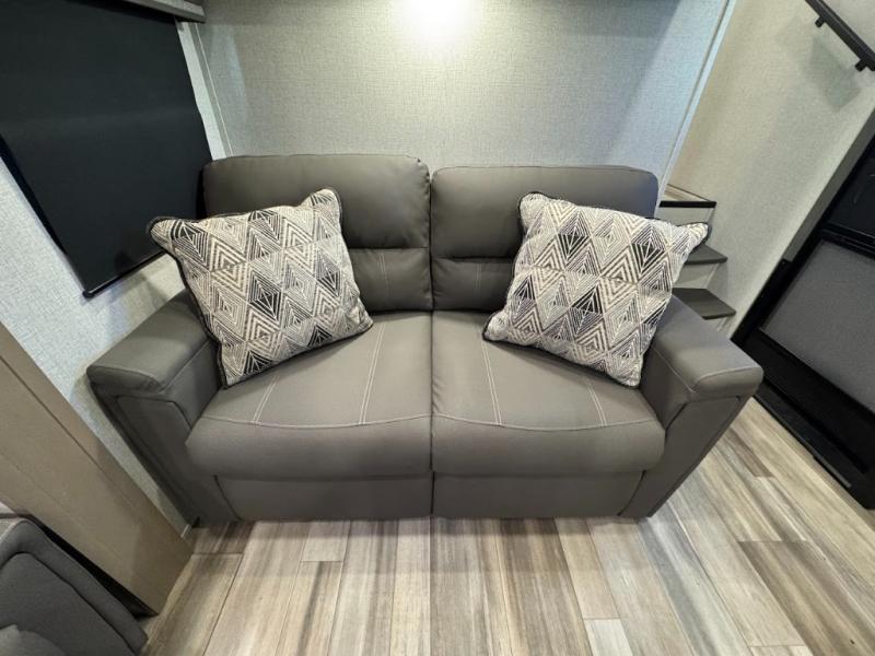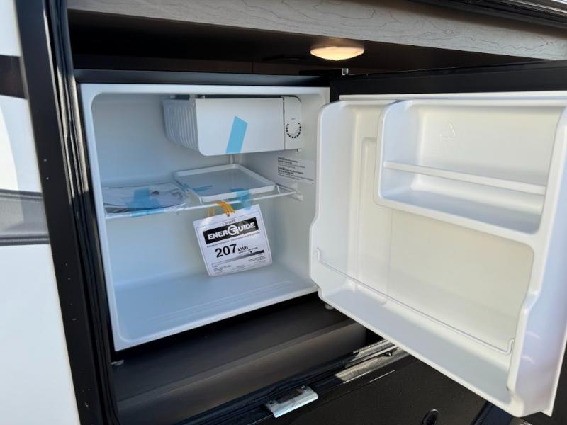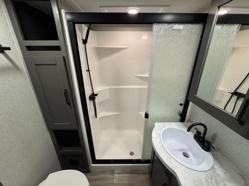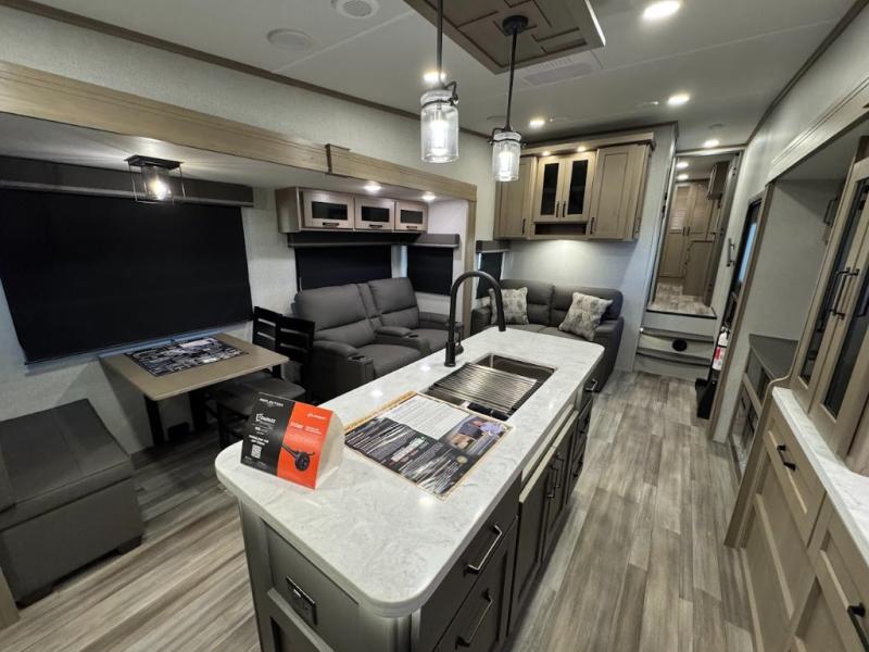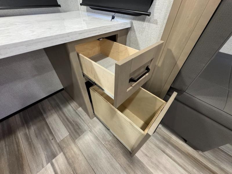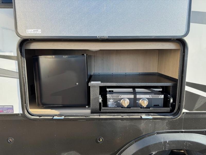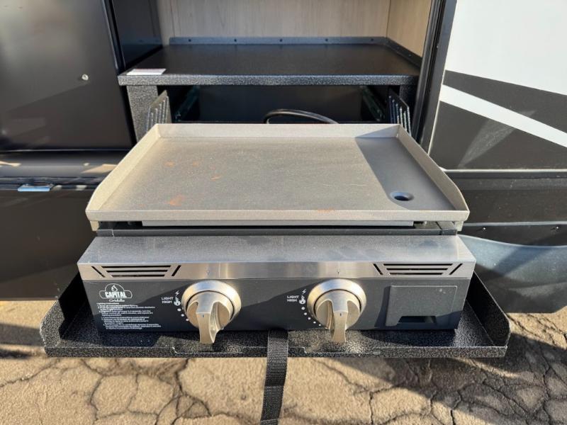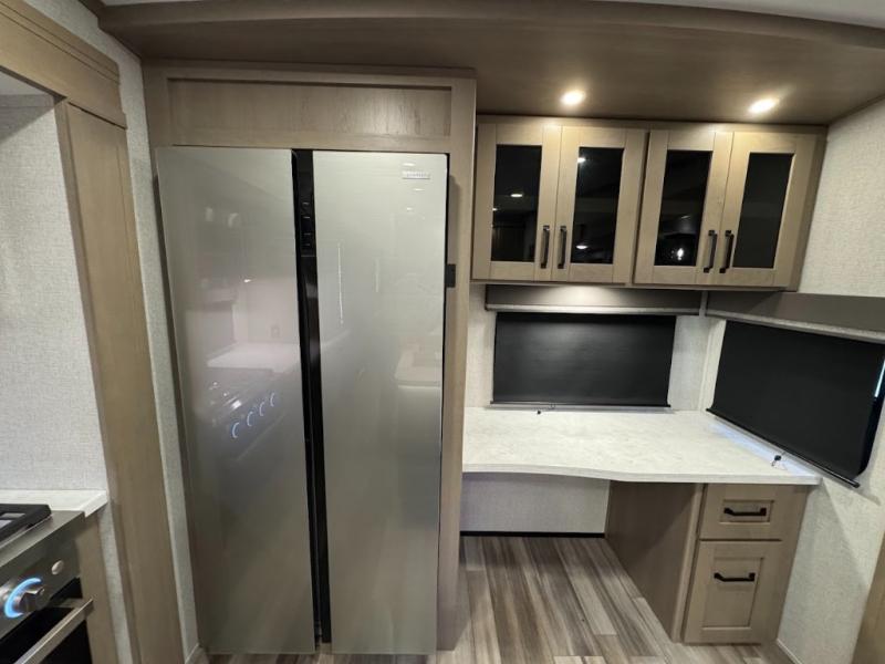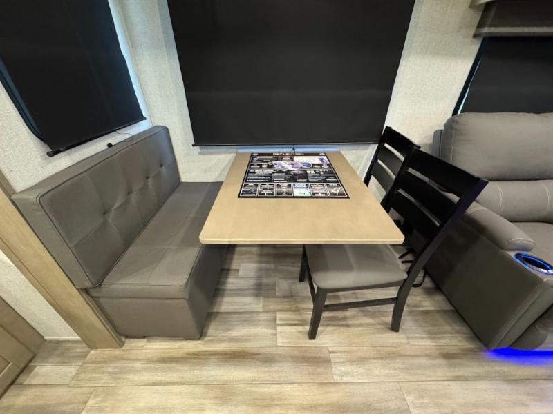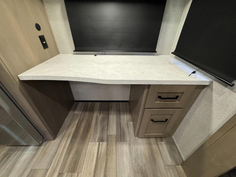 Comfortable accommodations are found throughout this fifth wheel so you can relax, unwind and enjoy your vacation be it for a weekend or a month and even when you have to work! Thanks to the rear desk with a chair and the bedroom with washer and dryer prep, you could stay in this RV as long as you like and keep all your clothes and linens clean. The front bedroom also provides a front wall wardrobe, a slide out queen bed and a dresser. The spacious shower has a glass door and there is linen storage in the full bathroom. The spacious main living and kitchen area has two slide outs with full kitchen amenities and seating with theater seats including cupholders, a booth dinette, and a tri-fold sofa. And the exterior offers an outside kitchen with a griddle, a 1.6 cu ft. refrigerator, and two power awnings!