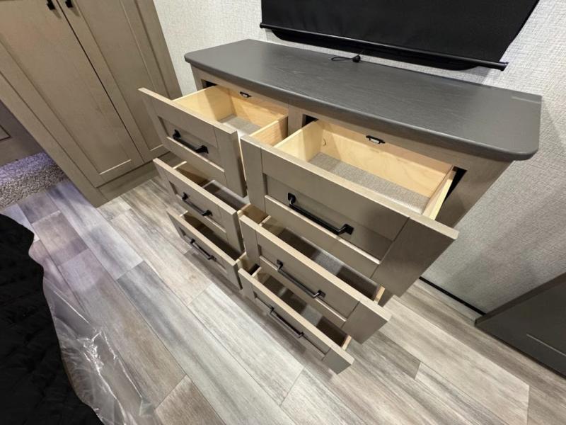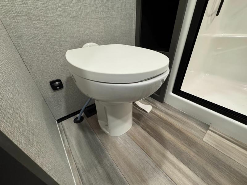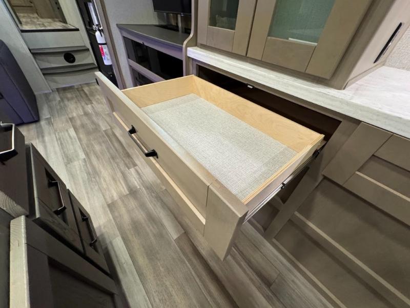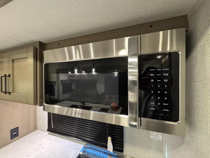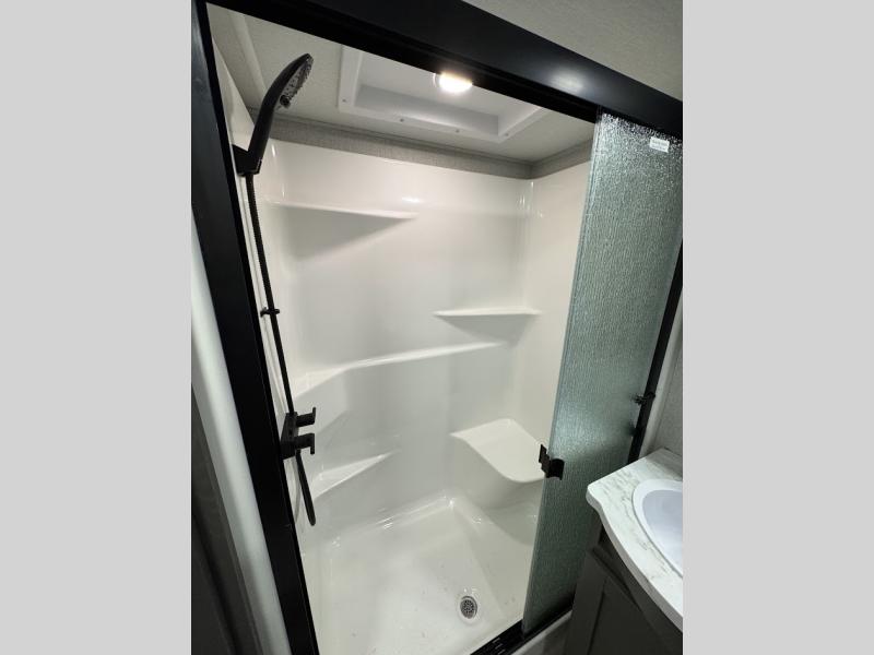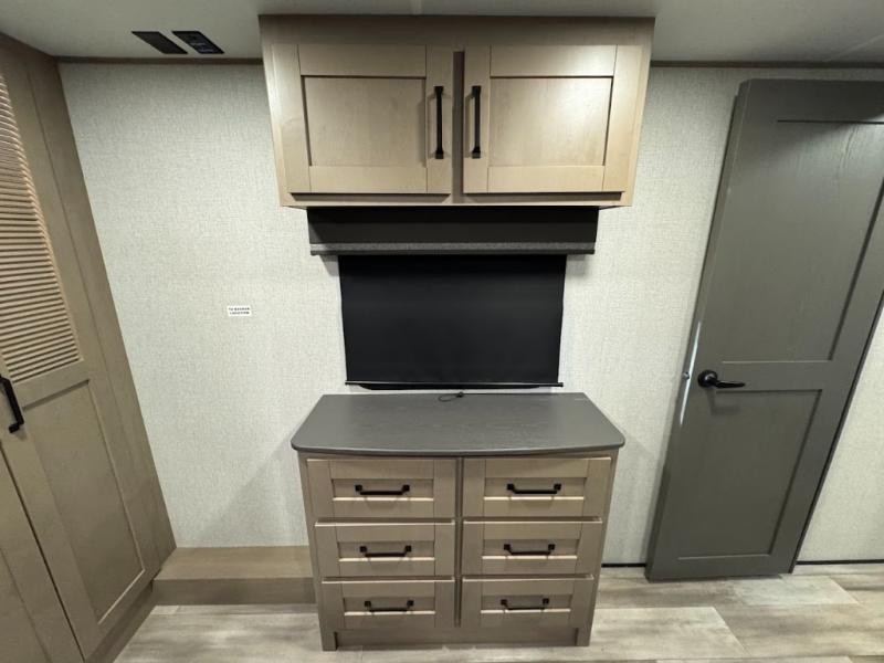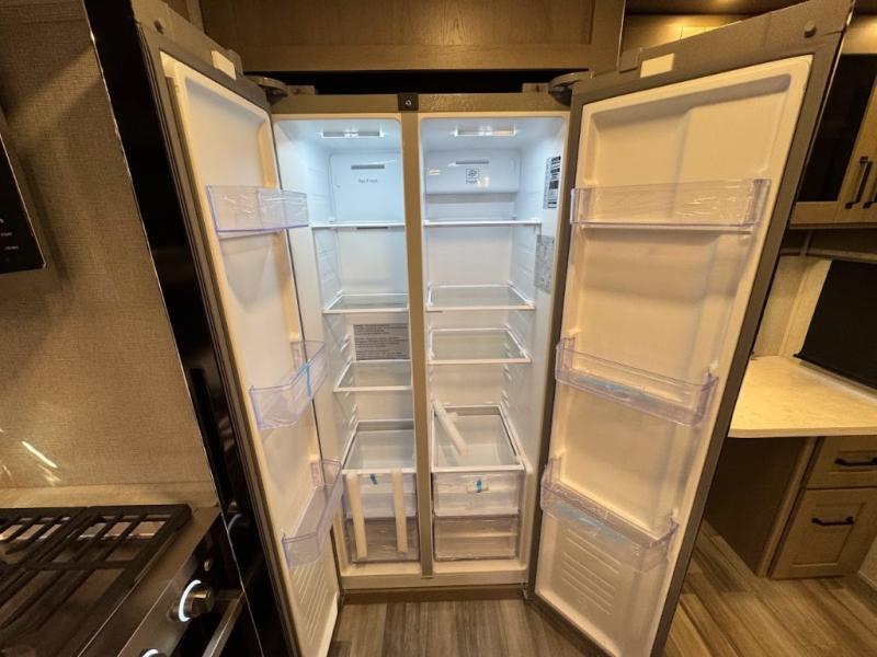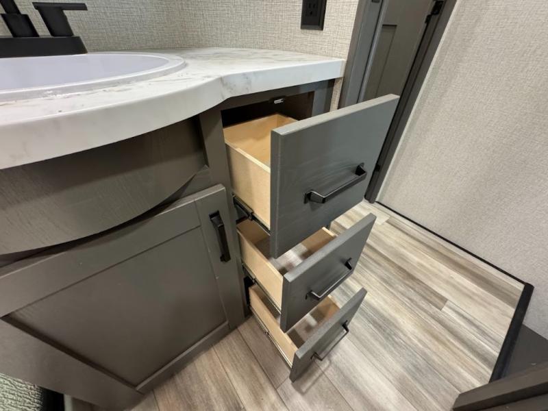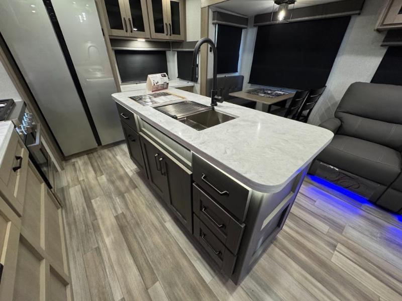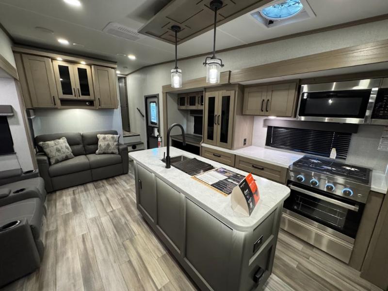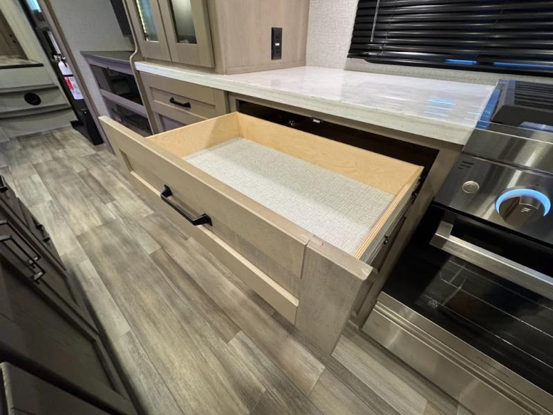 Comfortable accommodations are found throughout this fifth wheel so you can relax, unwind and enjoy your vacation be it for a weekend or a month and even when you have to work! Thanks to the rear desk with a chair and the bedroom with washer and dryer prep, you could stay in this RV as long as you like and keep all your clothes and linens clean. The front bedroom also provides a front wall wardrobe, a slide out queen bed and a dresser. The spacious shower has a glass door and there is linen storage in the full bathroom. The spacious main living and kitchen area has two slide outs with full kitchen amenities and seating with theater seats including cupholders, a booth dinette, and a tri-fold sofa. And the exterior offers an outside kitchen with a griddle, a 1.6 cu ft. refrigerator, and two power awnings!
