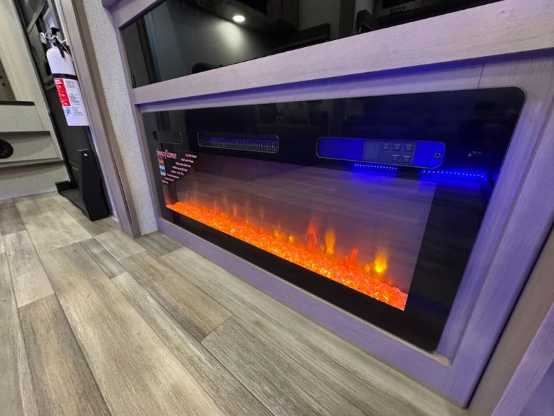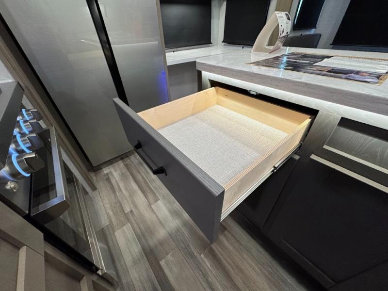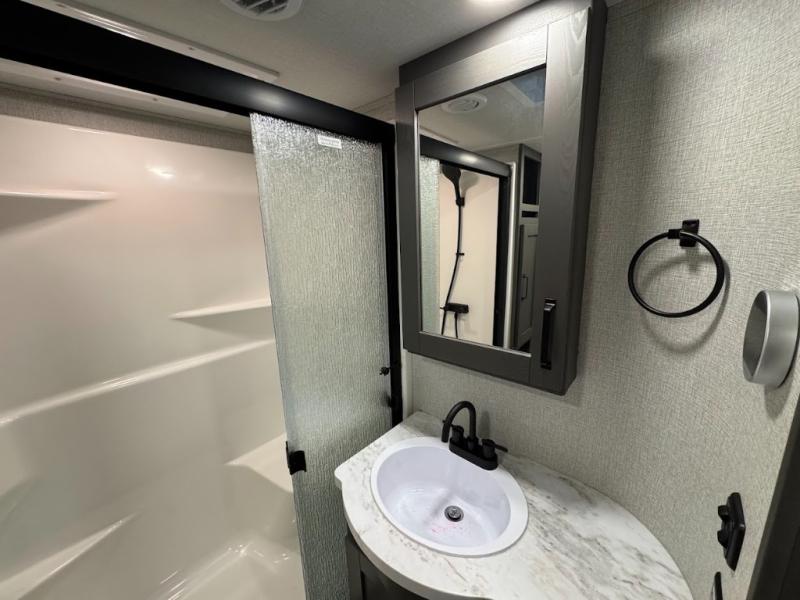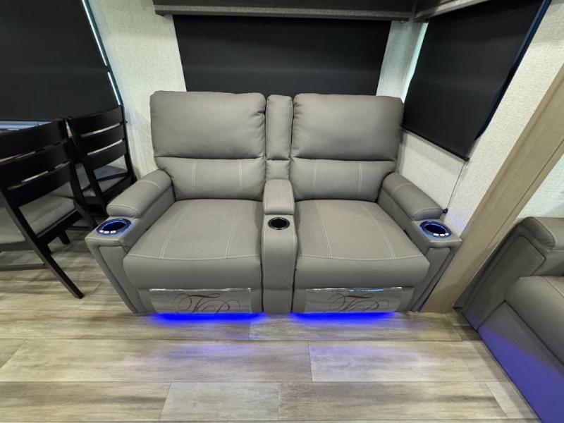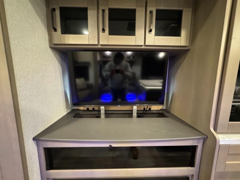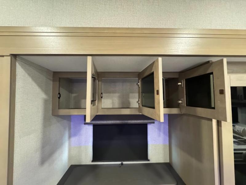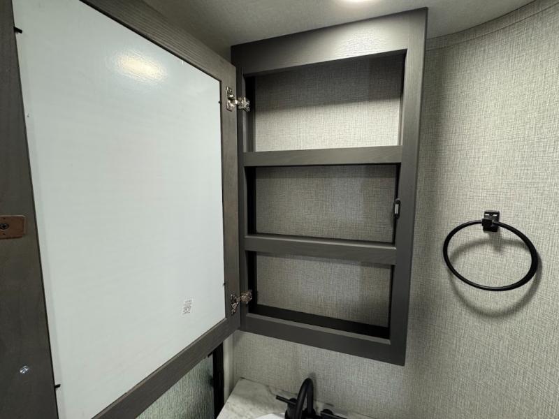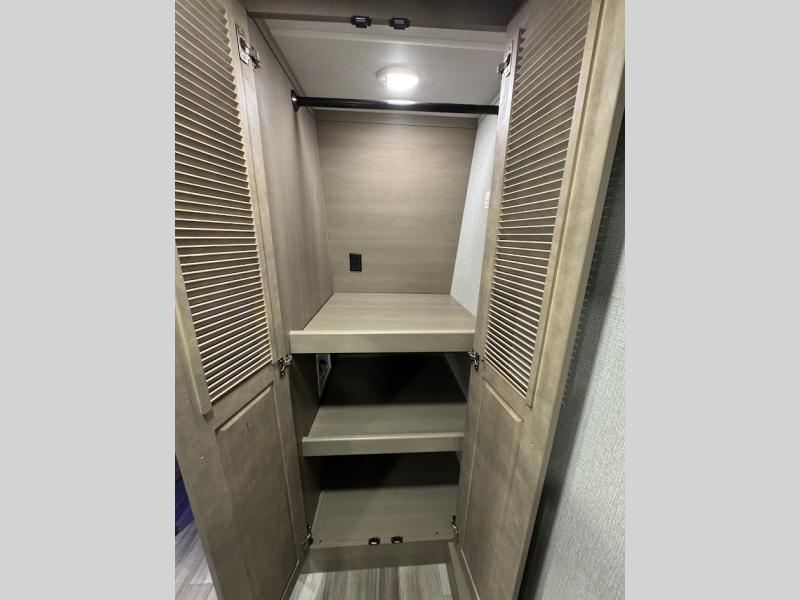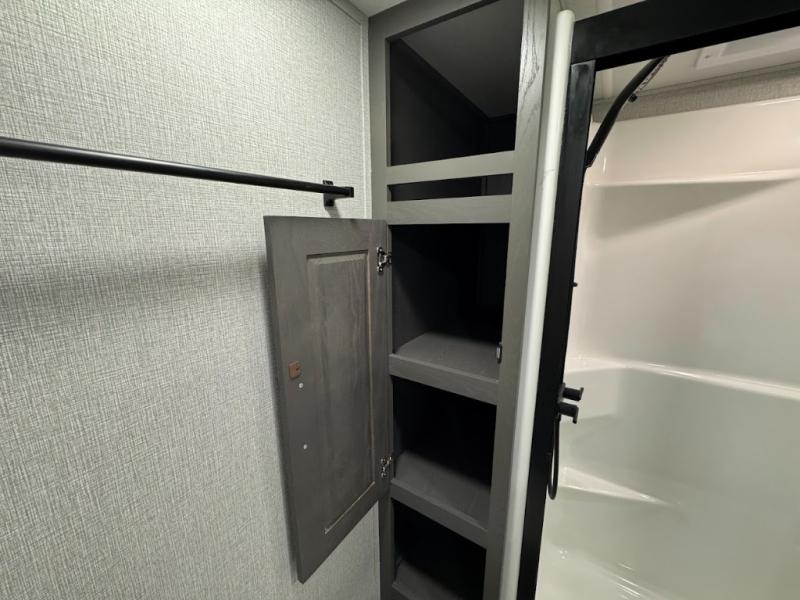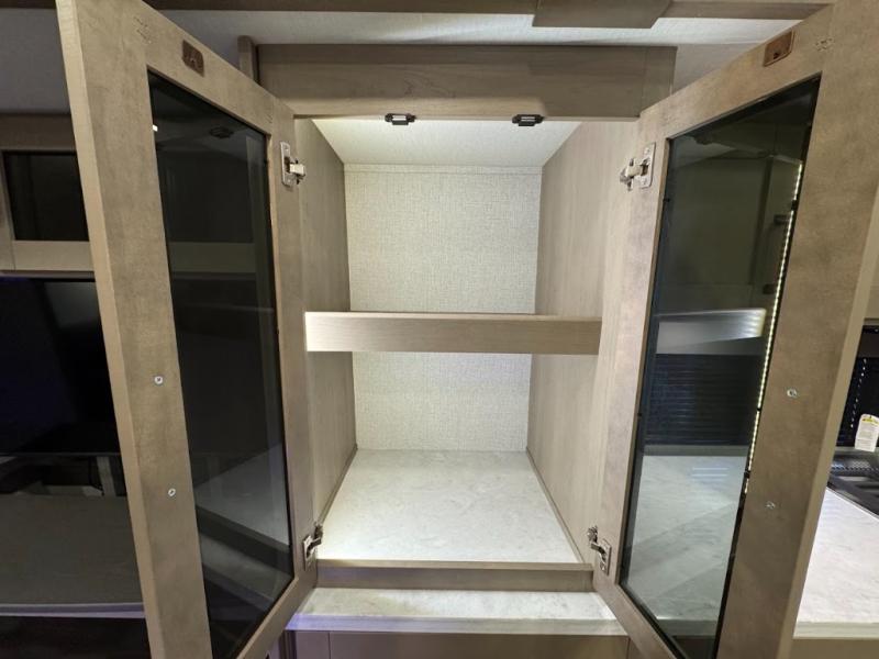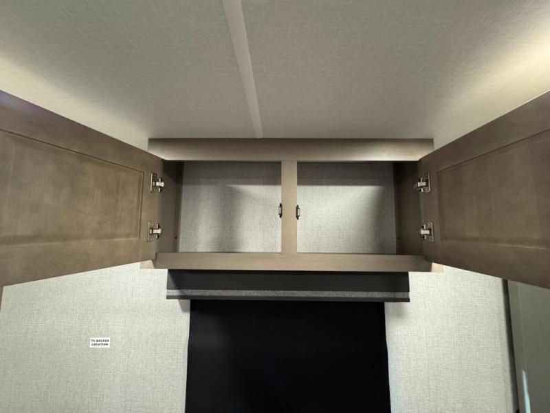 Comfortable accommodations are found throughout this fifth wheel so you can relax, unwind and enjoy your vacation be it for a weekend or a month and even when you have to work! Thanks to the rear desk with a chair and the bedroom with washer and dryer prep, you could stay in this RV as long as you like and keep all your clothes and linens clean. The front bedroom also provides a front wall wardrobe, a slide out queen bed and a dresser. The spacious shower has a glass door and there is linen storage in the full bathroom. The spacious main living and kitchen area has two slide outs with full kitchen amenities and seating with theater seats including cupholders, a booth dinette, and a tri-fold sofa. And the exterior offers an outside kitchen with a griddle, a 1.6 cu ft. refrigerator, and two power awnings!