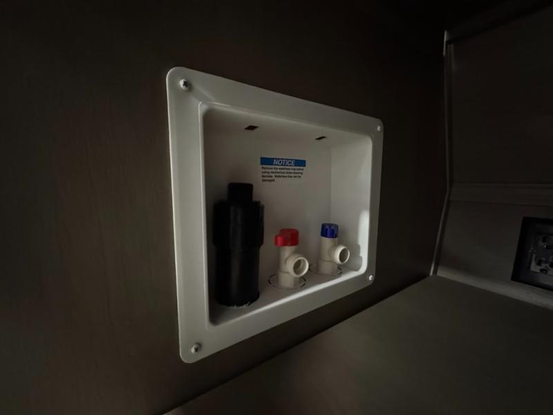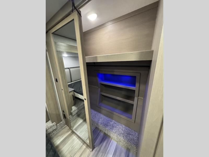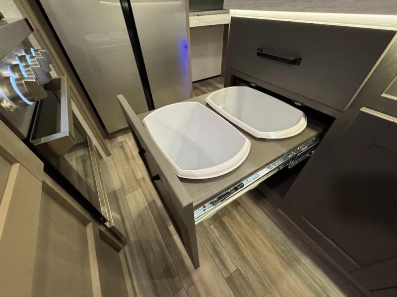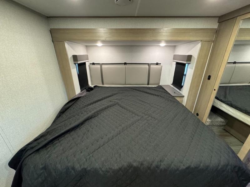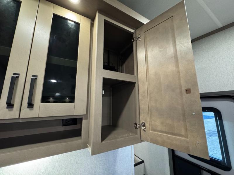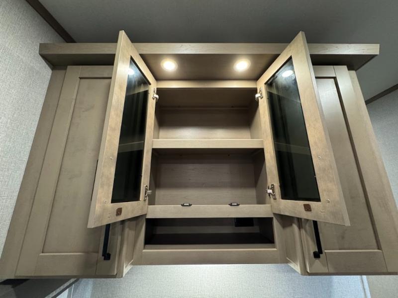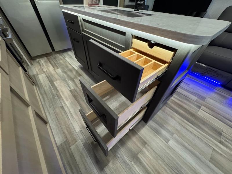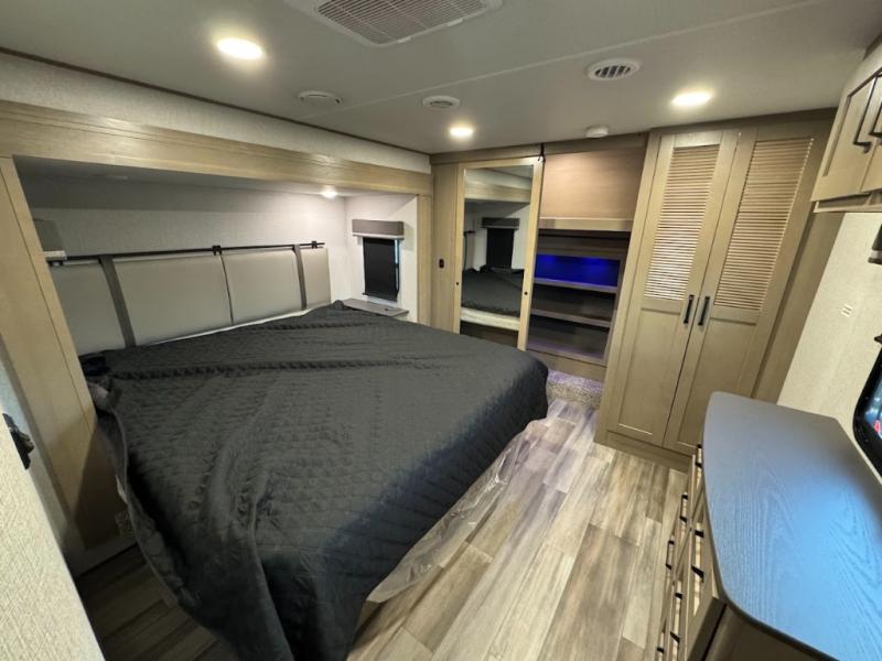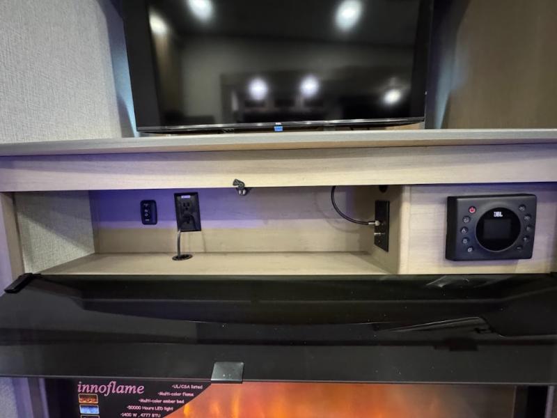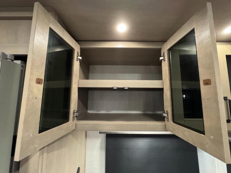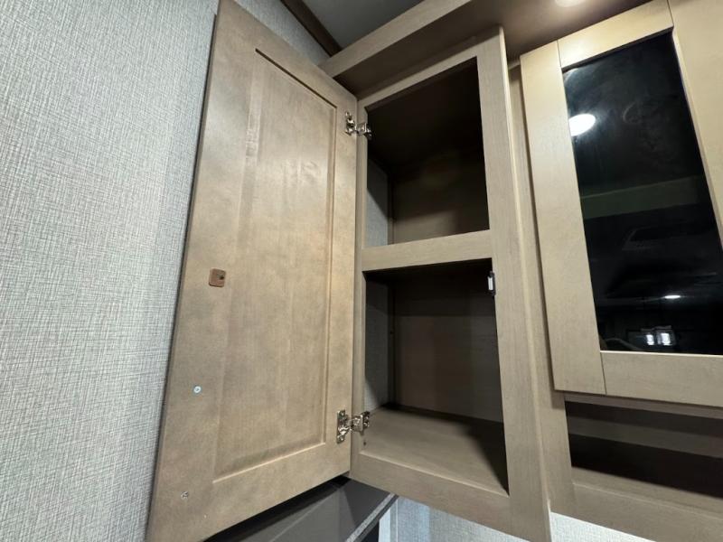 Comfortable accommodations are found throughout this fifth wheel so you can relax, unwind and enjoy your vacation be it for a weekend or a month and even when you have to work! Thanks to the rear desk with a chair and the bedroom with washer and dryer prep, you could stay in this RV as long as you like and keep all your clothes and linens clean. The front bedroom also provides a front wall wardrobe, a slide out queen bed and a dresser. The spacious shower has a glass door and there is linen storage in the full bathroom. The spacious main living and kitchen area has two slide outs with full kitchen amenities and seating with theater seats including cupholders, a booth dinette, and a tri-fold sofa. And the exterior offers an outside kitchen with a griddle, a 1.6 cu ft. refrigerator, and two power awnings!