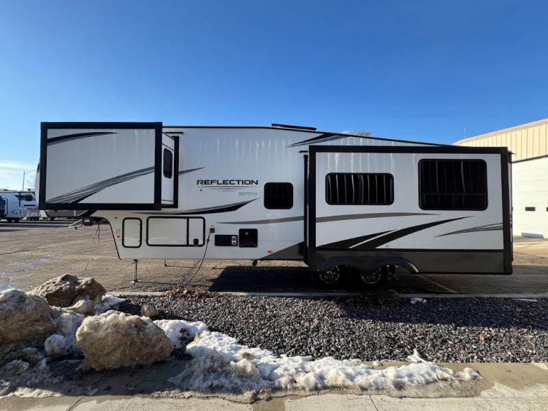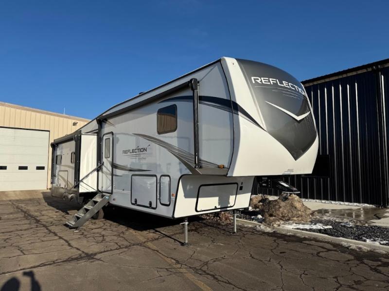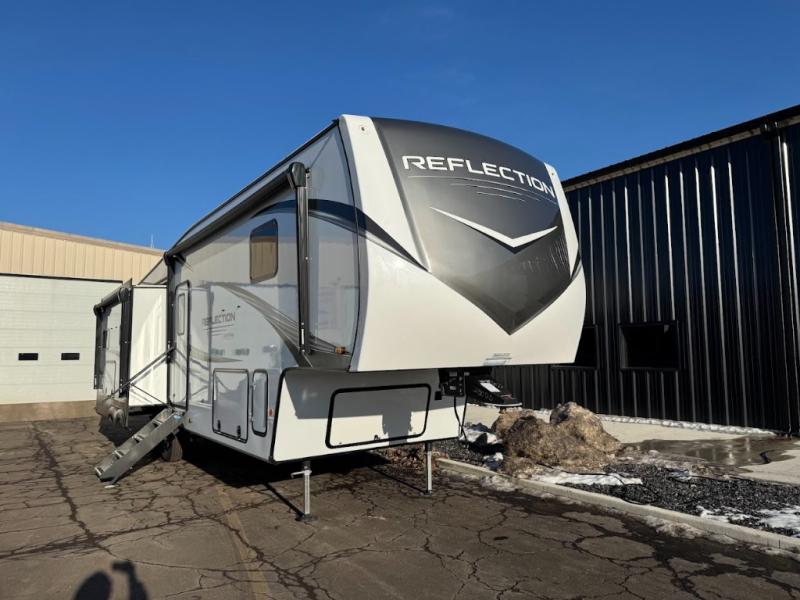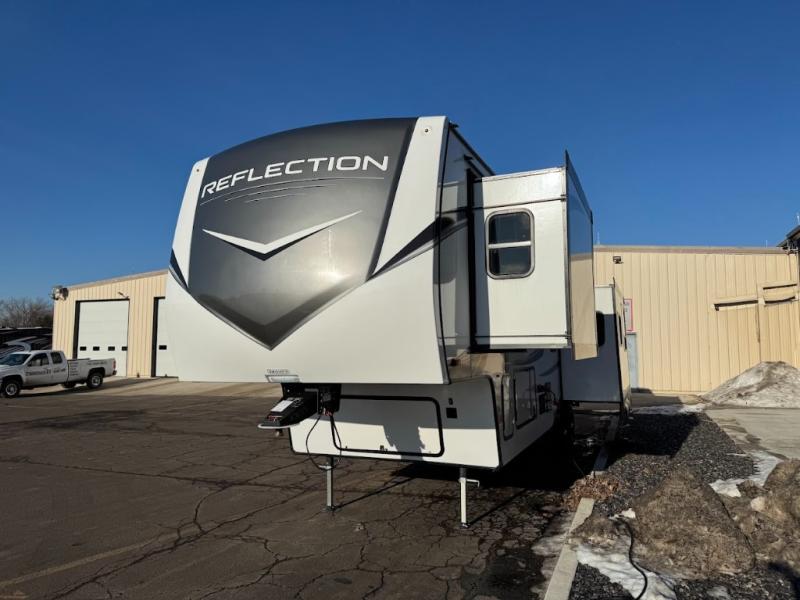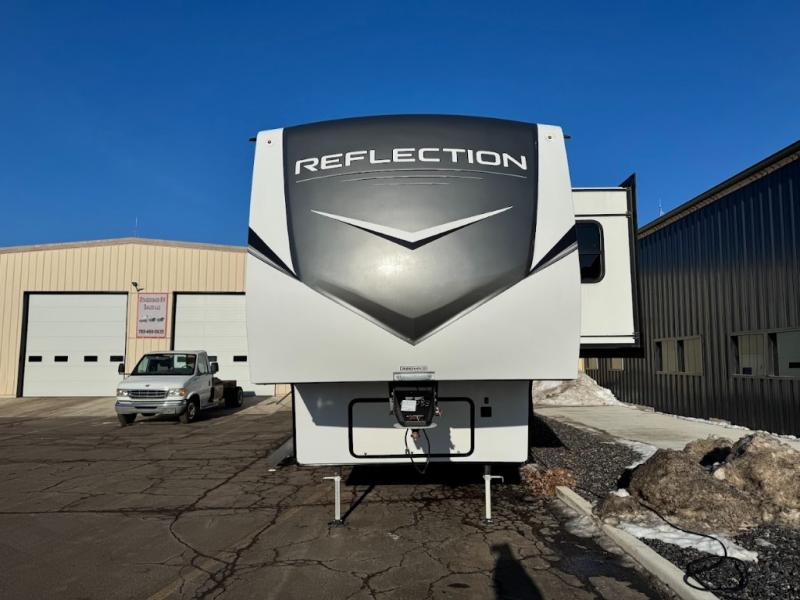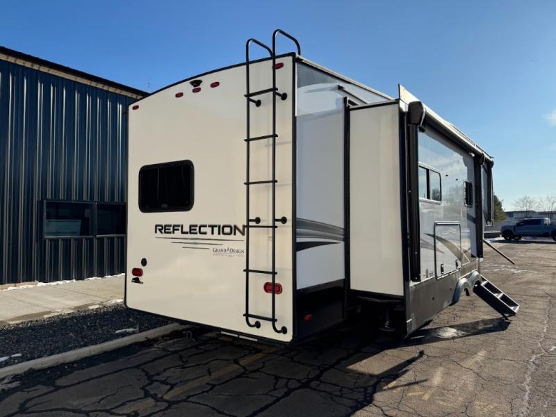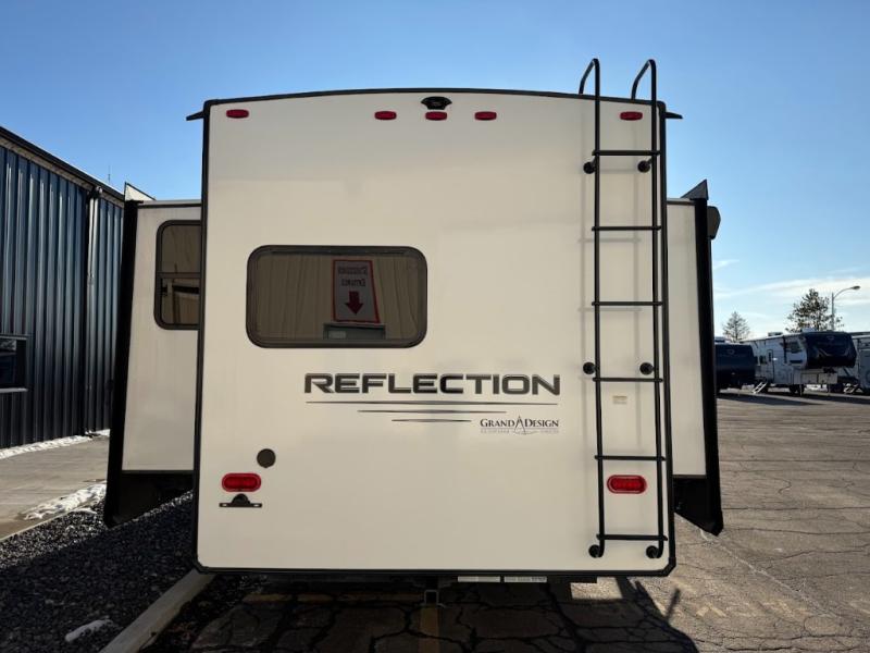 With any Reflection fifth wheel by Grand Design, you will have a solar panel for off-grid camping and a 60 amp charge controller and inverter prep, a Universal All-In-One docking station, unobstructed pass-through storage, and Goodyear Endurance tires. Each is constructed of gel coat exterior sidewalls, residential 5" truss rafters, walk-on roof decking, a fiberglass and radiant foil roof and front cap insulation plus laminated aluminum framed side walls, roof and end walls in slide rooms. Head inside to enjoy residential hardwood cabinet doors, premium Congoleum flooring, a spacious shower with a glass door, and many more comforts!