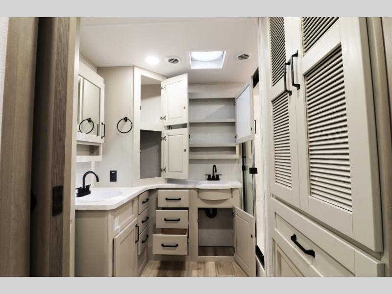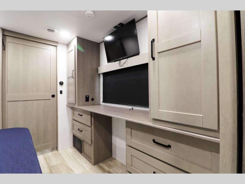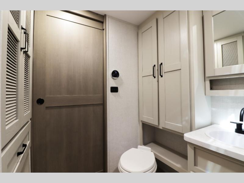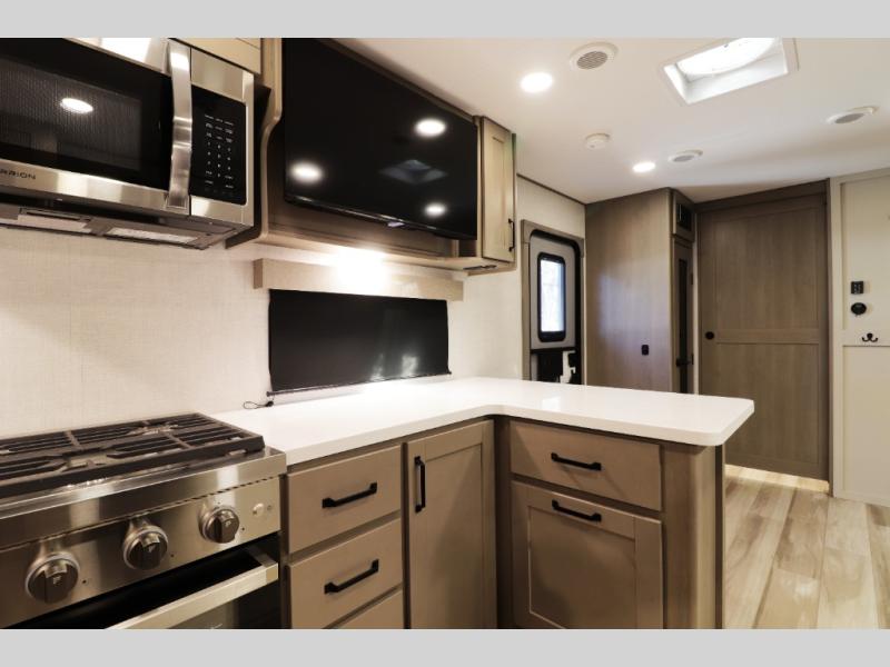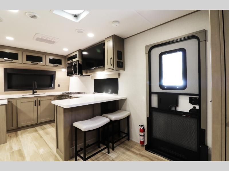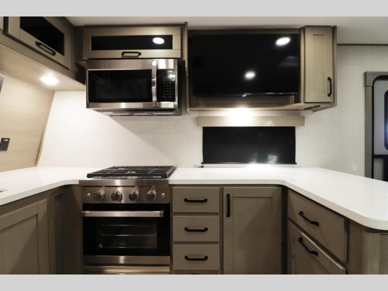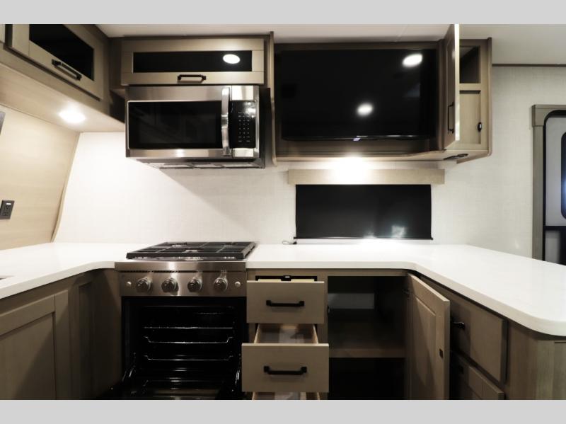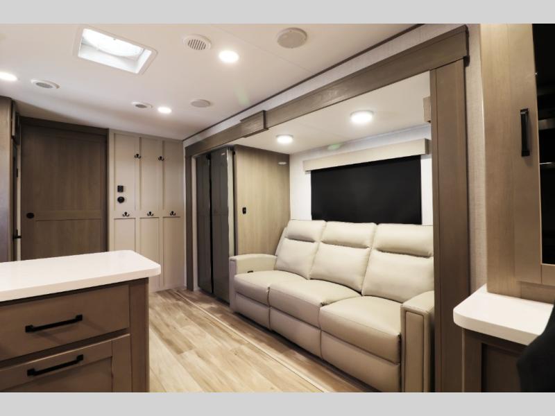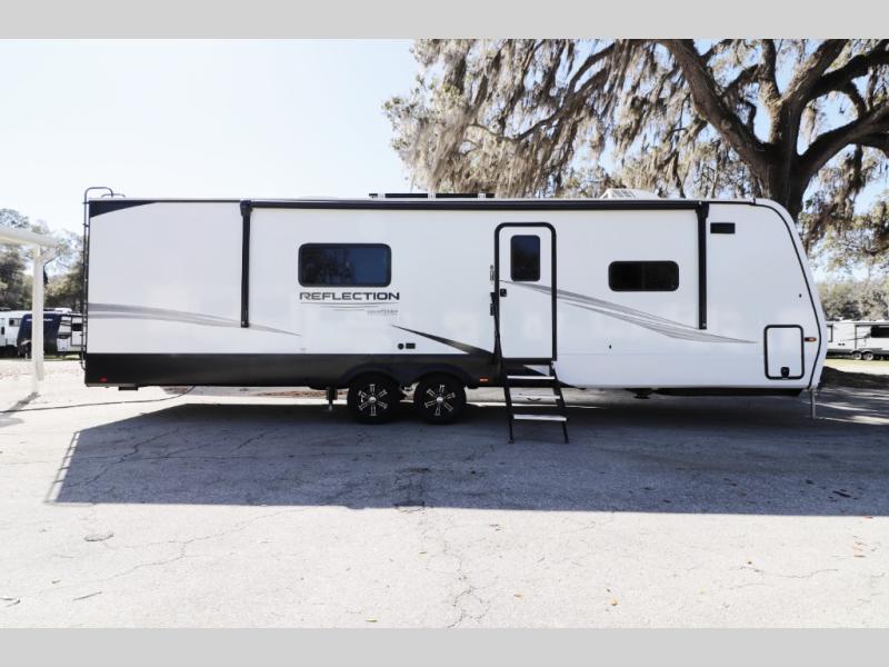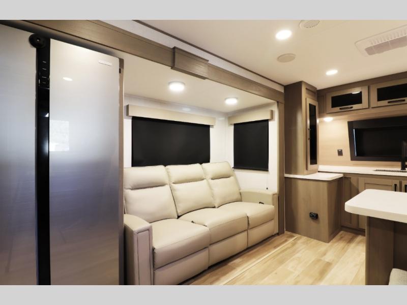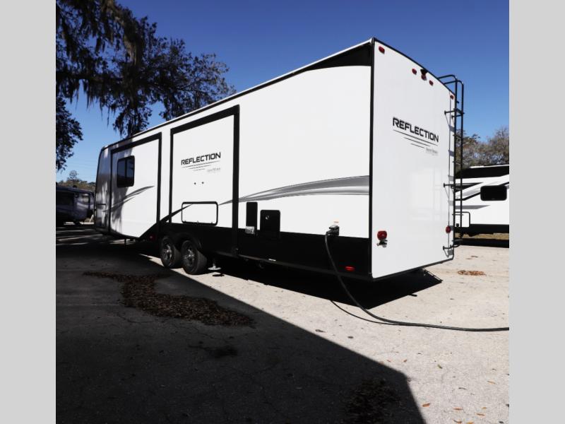 The Reflection 322FKTS stands out with its highly sought-after front kitchen layout, giving you abundant counter space, premium appliances, and residential functionality that makes cooking on the road feel like home. The open living area, theater seating, and entertainment space create a relaxing environment whether you're on a weekend getaway, seasonal site, or extended adventure. With room to sleep up to six depending on configuration and smart storage throughout, this RV offers the flexibility buyers are searching for in a high-end travel trailer.