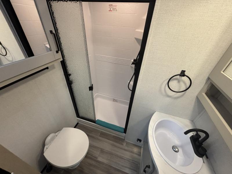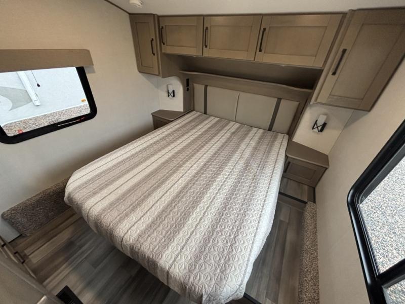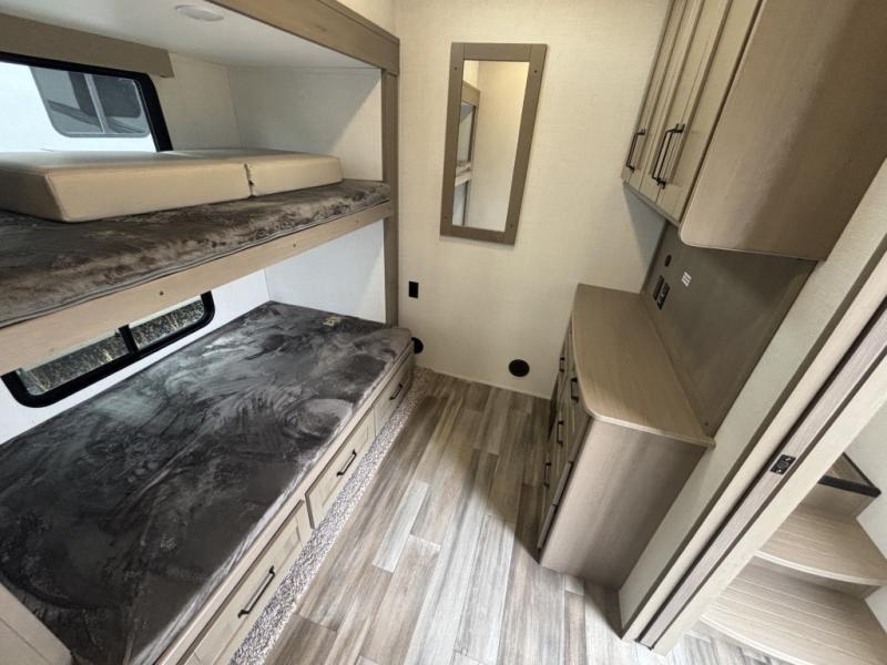 When you are looking for a versatile extra room for either a second bedroom or living area as well as an office, this middle bunkhouse might just work! There is a slide out with two bunks and drawers plus a dresser. You can sleep like a queen on the walk-around bed in the front private bedroom that offers more clothing storage and windows for views. The rear main living and kitchen area provides plenty of seating on the a 78" triple person theater seats, and on the 92" U-shaped lounge with table with windows within the slide for natural lighting and great views. The kitchen island gives the cook more space to make and serve meals, and the gourmet kitchen includes a 16 cu. ft. refrigerator, plus a pantry for dry goods. There is an exterior outside kitchen with a griddle and a 1.6 cu. ft. refrigerator for beverages and such, plus you will find an LP quick connect, Coax TV hookup, and a spray port to wash off your dirty shoes.