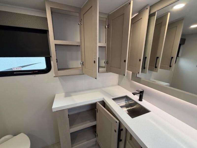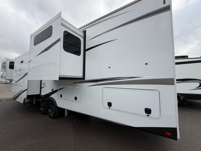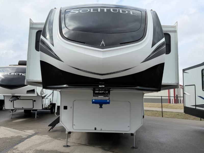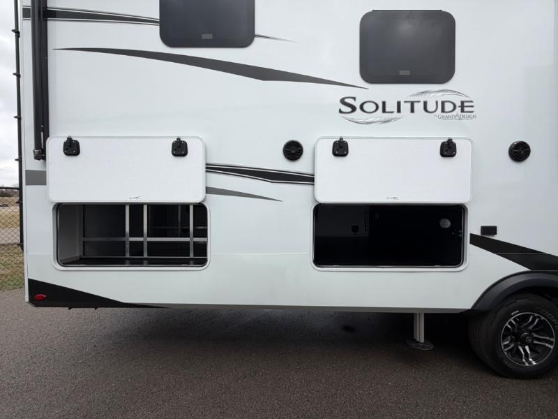 Each Solitude fifth wheel by Grand Design features a 101" wide-body construction, heavy duty 8,000 lb. axles, frameless tinted windows, and high-gloss gel coat sidewalls. You can camp year around thanks to the Weather-Tek Package that includes a 35K BTU high-capacity furnace, an all-in-one enclosed and heated utility center, and a fully enclosed underbelly with heated tanks and storage. Inside, you'll love the premium roller shades, hardwood cabinet doors, solid surface countertops, plus residential finishes throughout to make you truly feel at home. Each model also includes a MORryde CRE3000 suspension system, self adjusting brakes, and a MORryde pin box that will provide smooth towing from home to campground. Affordable luxury is possible with the Solitude fifth wheels; choose yours today!