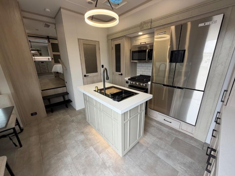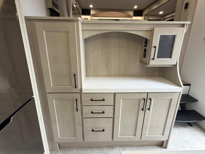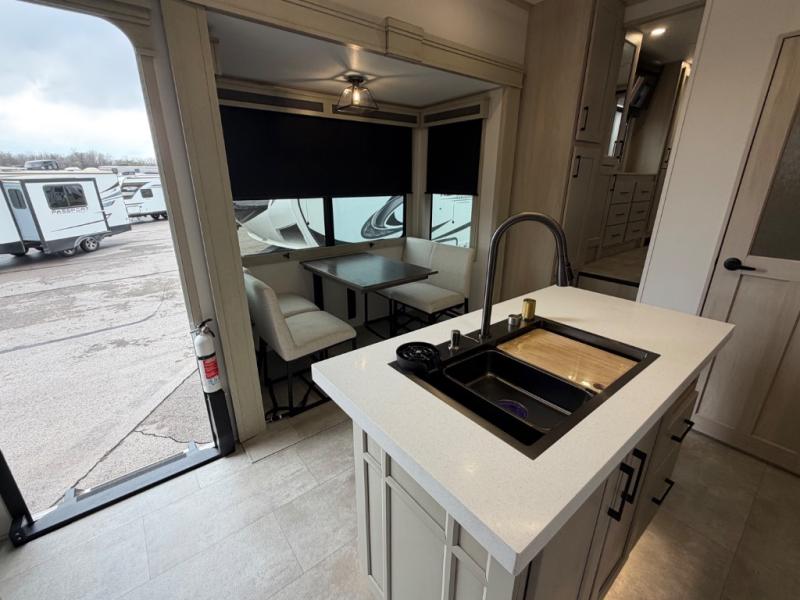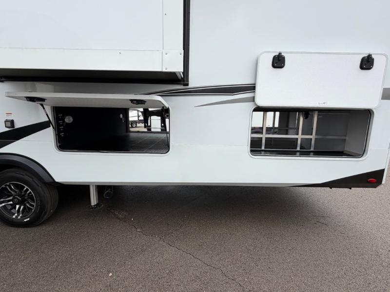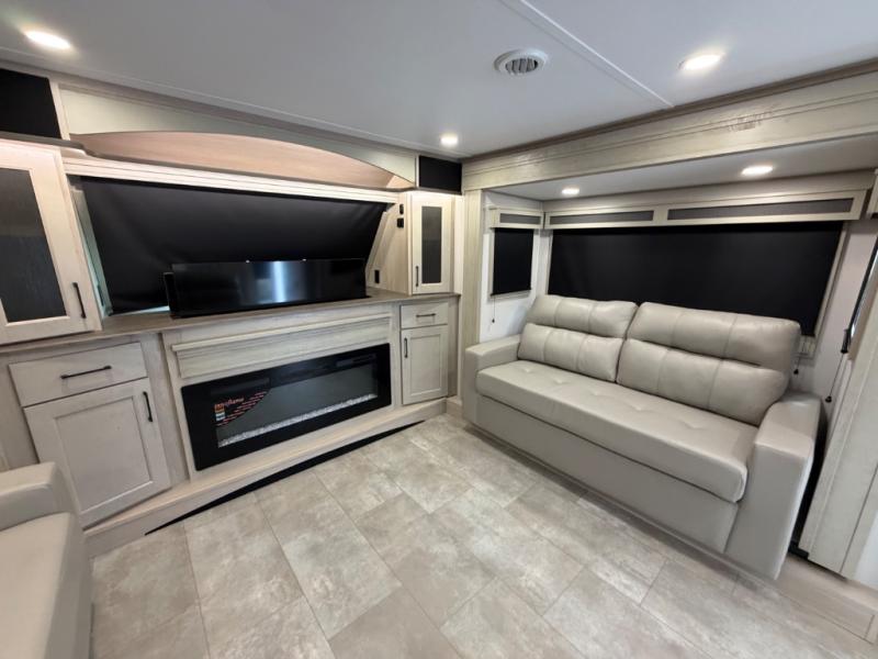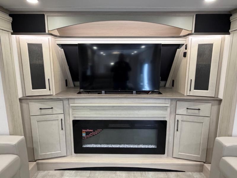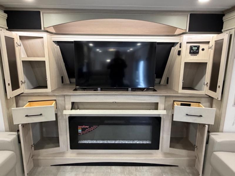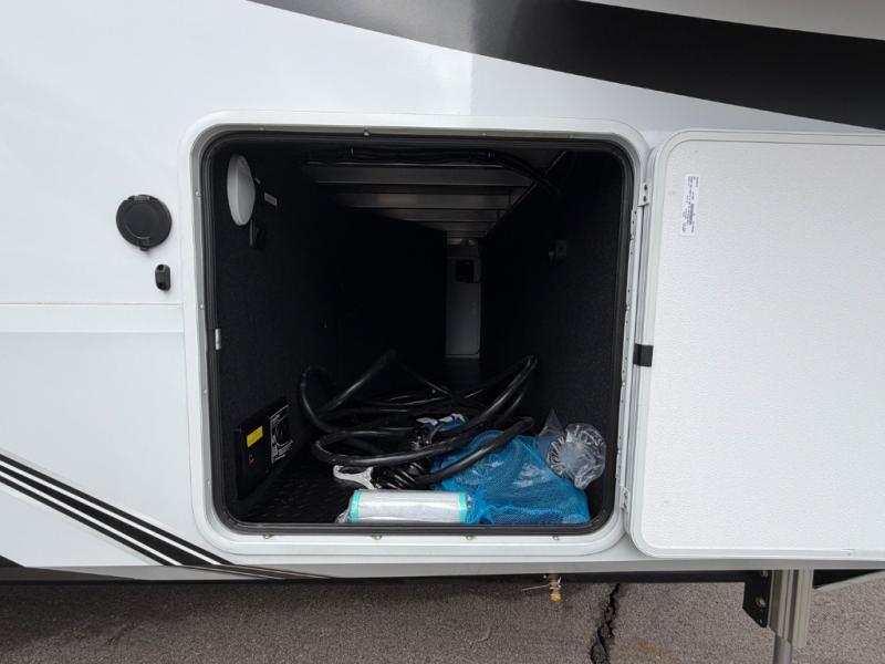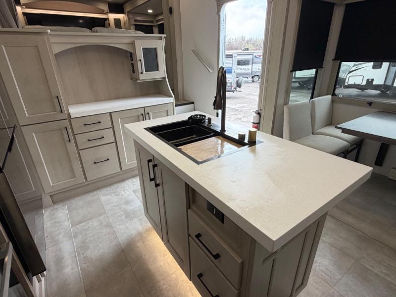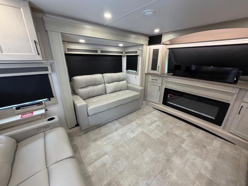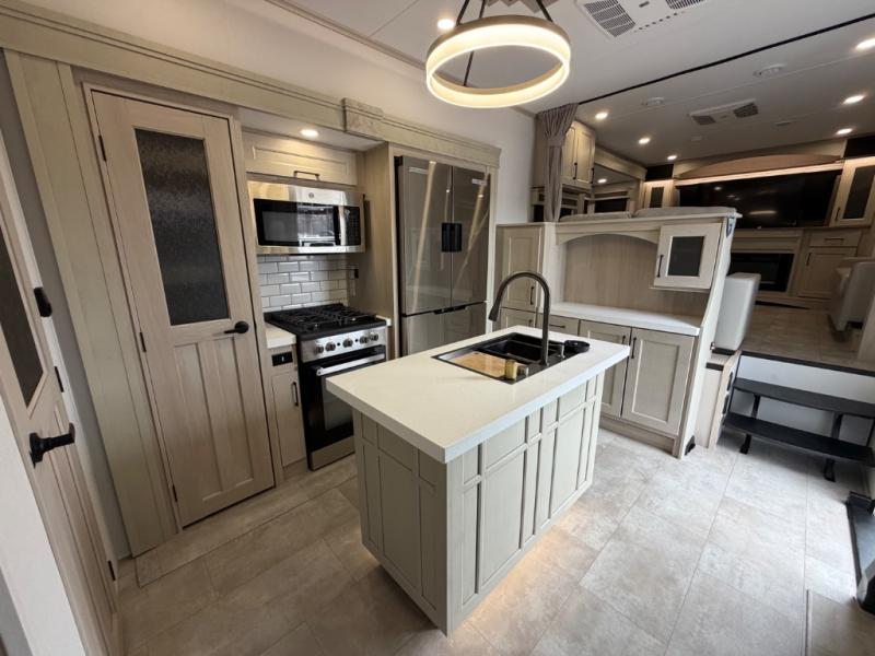 Five slide outs, a full bathroom with dual sinks, a half bath off of the kitchen, and a separate front living room and entertainment area are a few reasons you will enjoy your time spent in this fifth wheel! The separate kitchen is a dream with stainless steel appliances including a built-in oven, a pantry and hutch with counter space, a kitchen island plus a free-standing dinette slide with windows for great views. The entertainment center offers an LED Smart TV with a fireplace below and storage, and the dual opposing tri-fold sofas provide added sleeping space at night. The master bedroom includes a queen bed plus space savings sliding doors that lead you to the rear full bathroom with dual sinks, linen storage, and washer/dryer prep. The exterior has several storage choices as well including a pass-through compartment for fishing poles and such, plus the unique sliding tray in the rear allows you to bring along larger items such as camping tables, portable grills, golf clubs, totes and more.