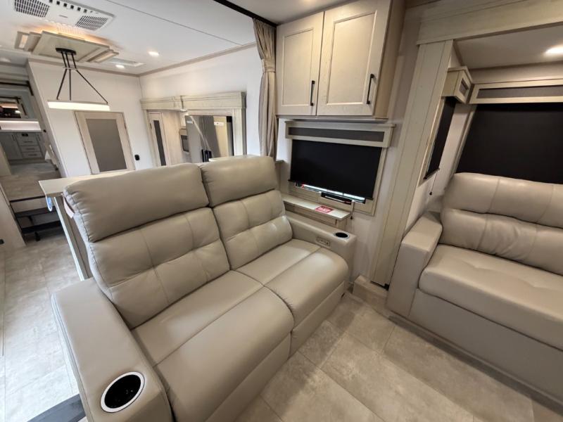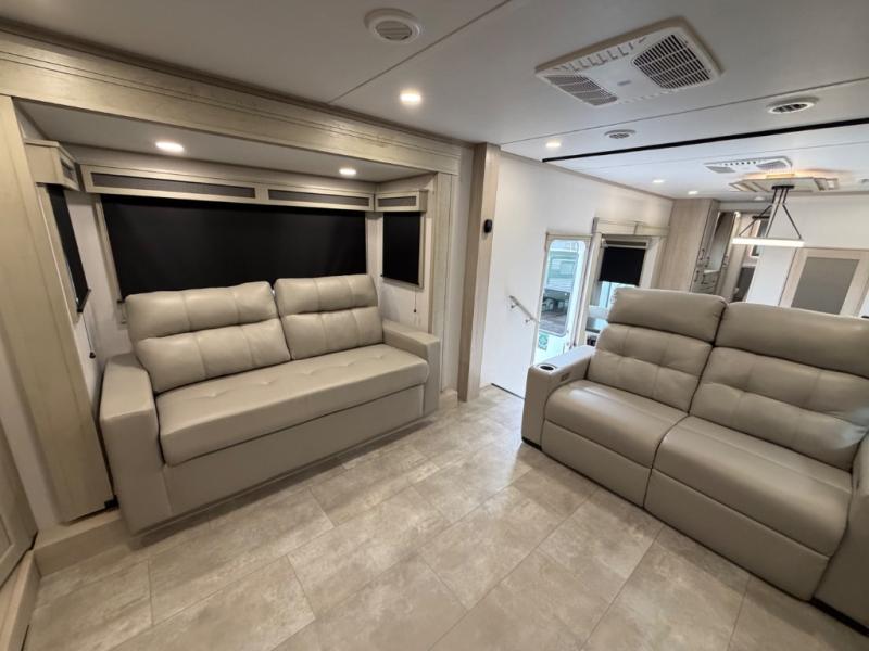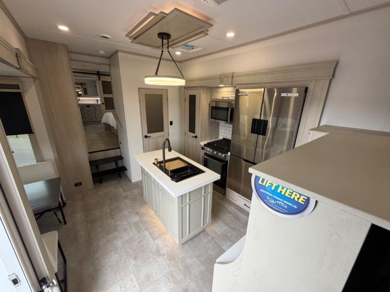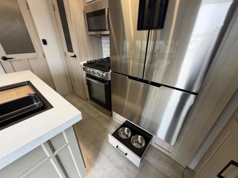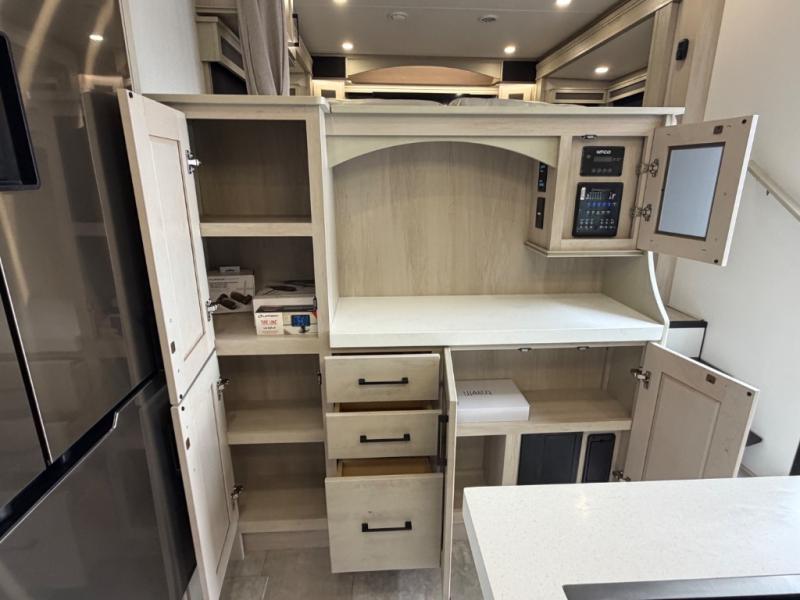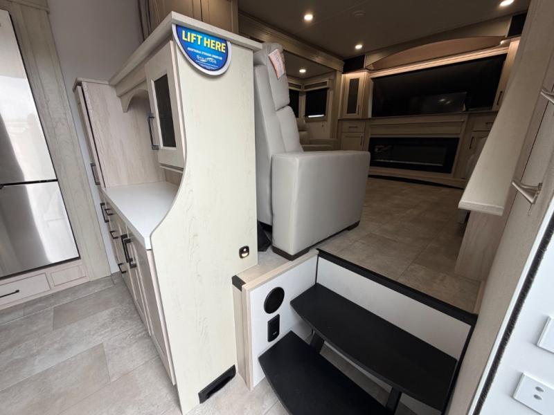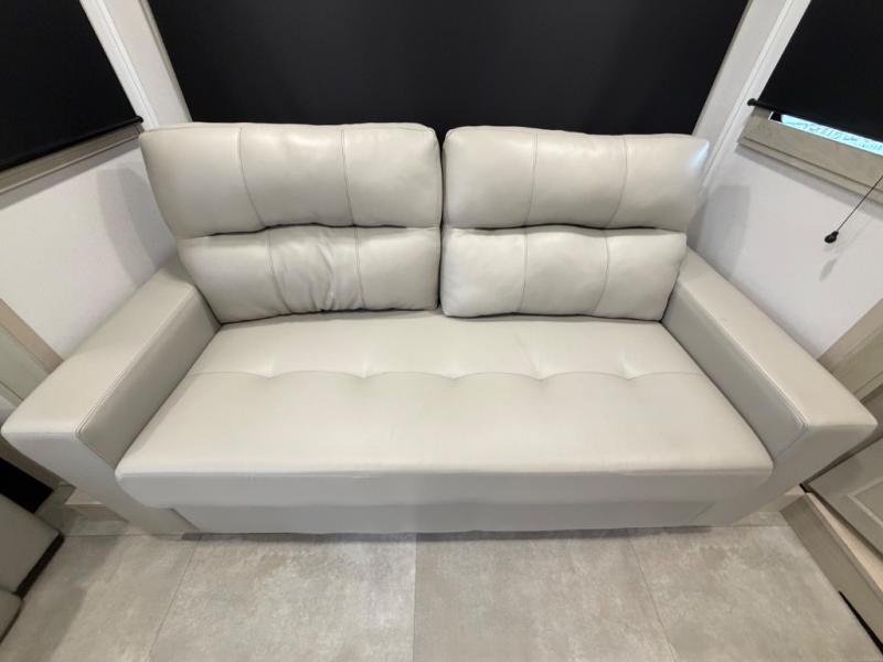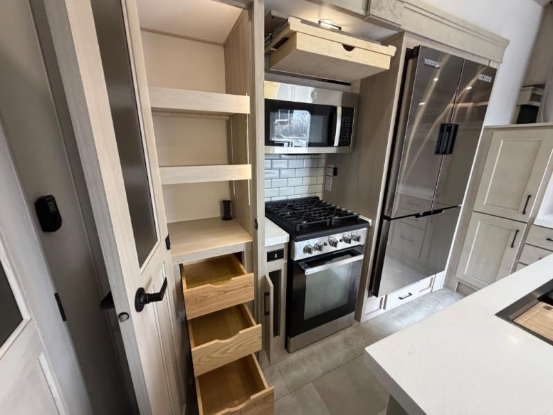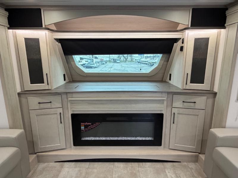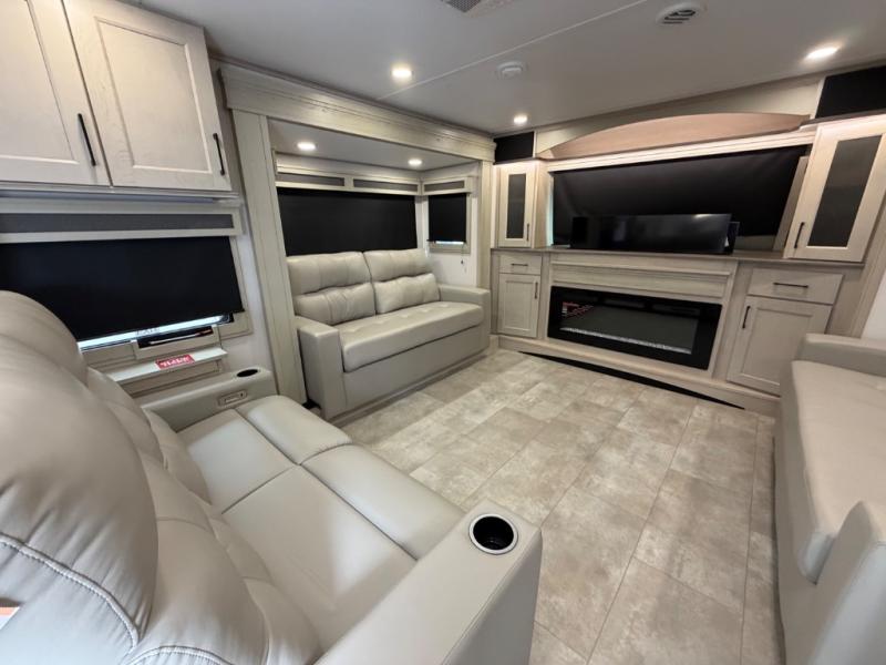 Five slide outs, a full bathroom with dual sinks, a half bath off of the kitchen, and a separate front living room and entertainment area are a few reasons you will enjoy your time spent in this fifth wheel! The separate kitchen is a dream with stainless steel appliances including a built-in oven, a pantry and hutch with counter space, a kitchen island plus a free-standing dinette slide with windows for great views. The entertainment center offers an LED Smart TV with a fireplace below and storage, and the dual opposing tri-fold sofas provide added sleeping space at night. The master bedroom includes a queen bed plus space savings sliding doors that lead you to the rear full bathroom with dual sinks, linen storage, and washer/dryer prep. The exterior has several storage choices as well including a pass-through compartment for fishing poles and such, plus the unique sliding tray in the rear allows you to bring along larger items such as camping tables, portable grills, golf clubs, totes and more.