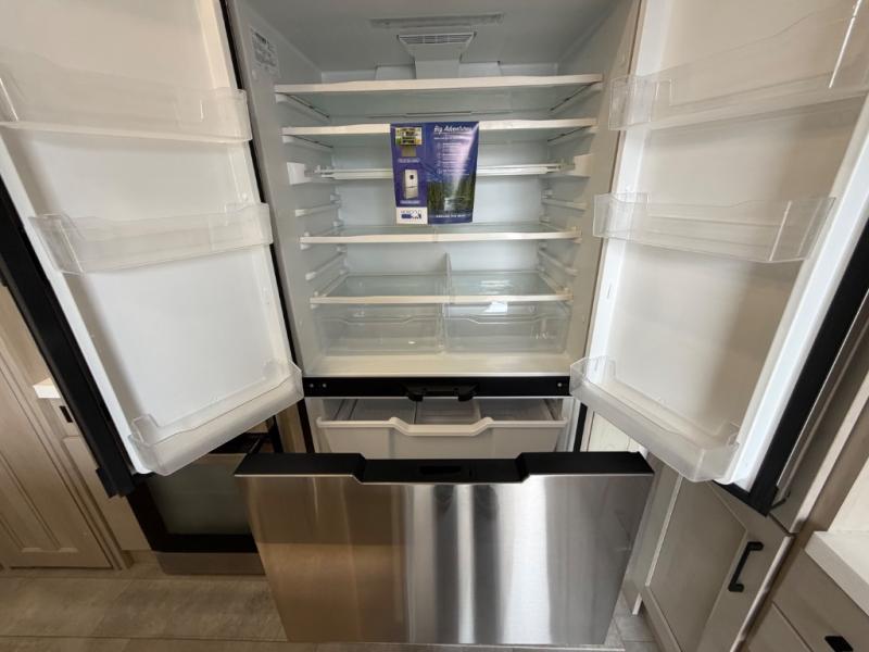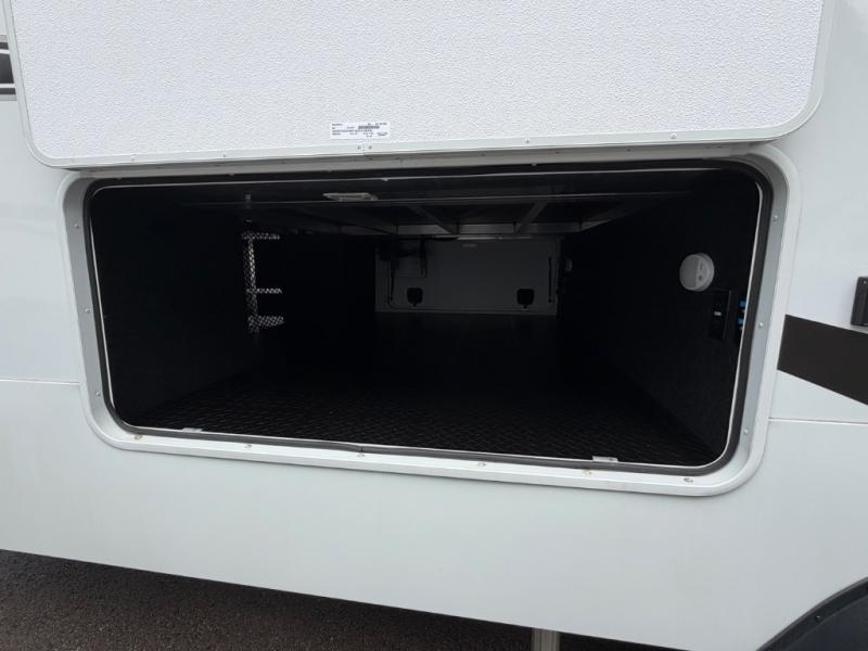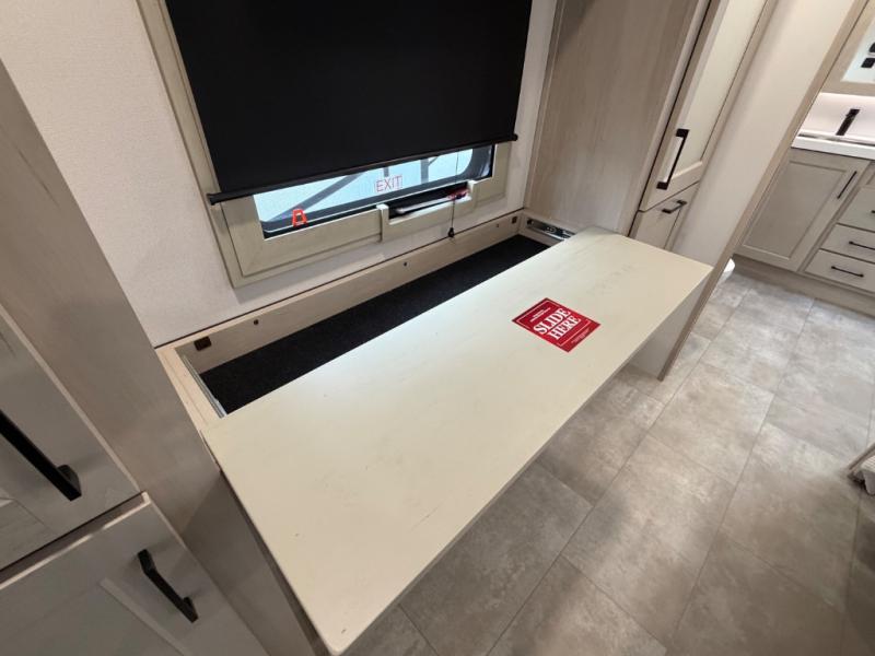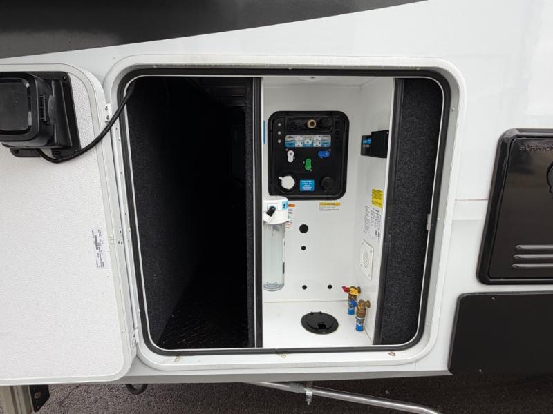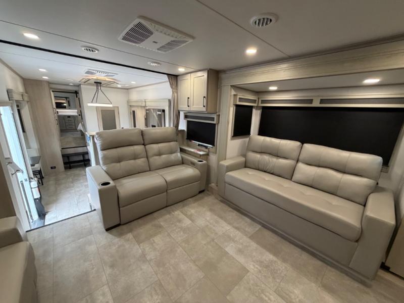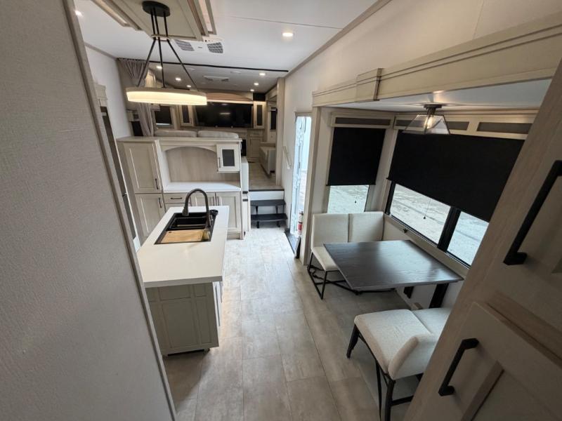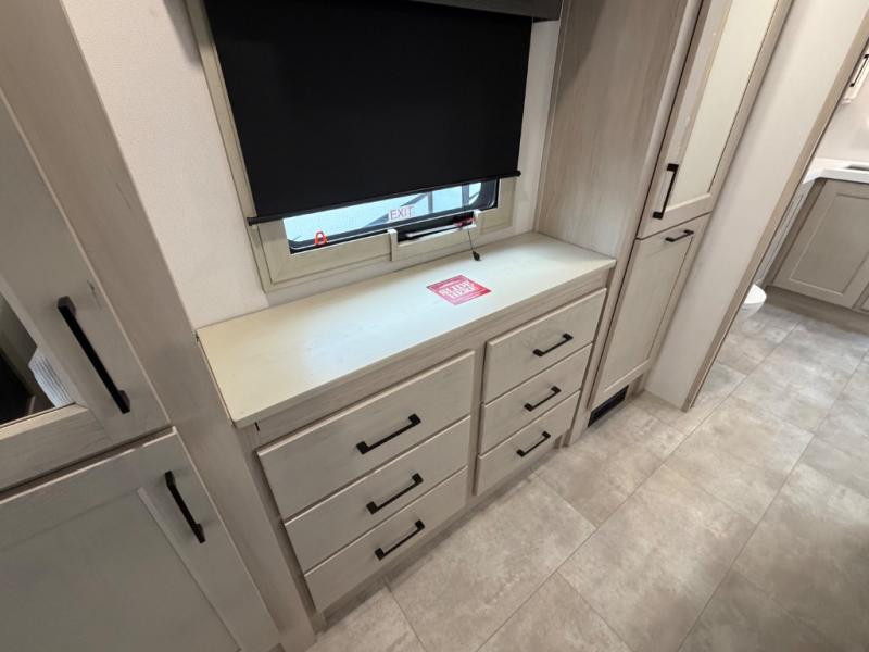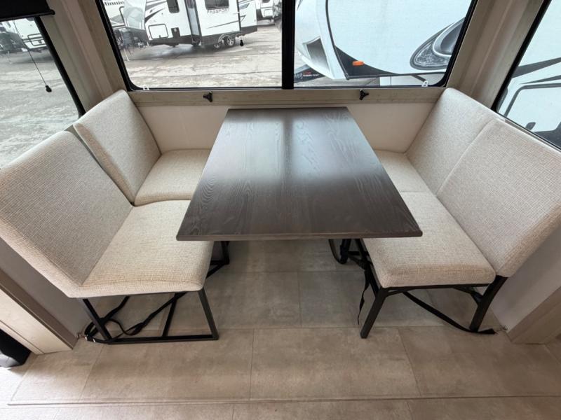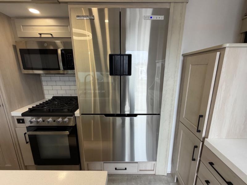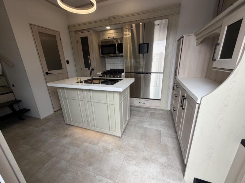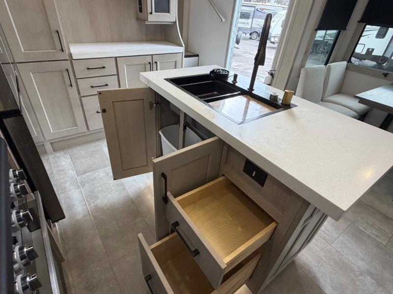 Five slide outs, a full bathroom with dual sinks, a half bath off of the kitchen, and a separate front living room and entertainment area are a few reasons you will enjoy your time spent in this fifth wheel! The separate kitchen is a dream with stainless steel appliances including a built-in oven, a pantry and hutch with counter space, a kitchen island plus a free-standing dinette slide with windows for great views. The entertainment center offers an LED Smart TV with a fireplace below and storage, and the dual opposing tri-fold sofas provide added sleeping space at night. The master bedroom includes a queen bed plus space savings sliding doors that lead you to the rear full bathroom with dual sinks, linen storage, and washer/dryer prep. The exterior has several storage choices as well including a pass-through compartment for fishing poles and such, plus the unique sliding tray in the rear allows you to bring along larger items such as camping tables, portable grills, golf clubs, totes and more.