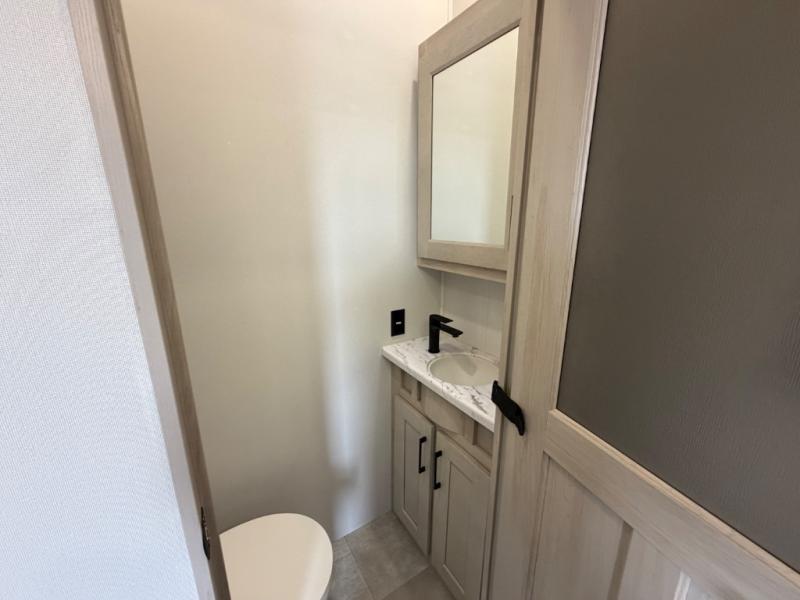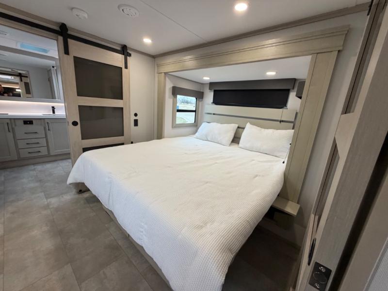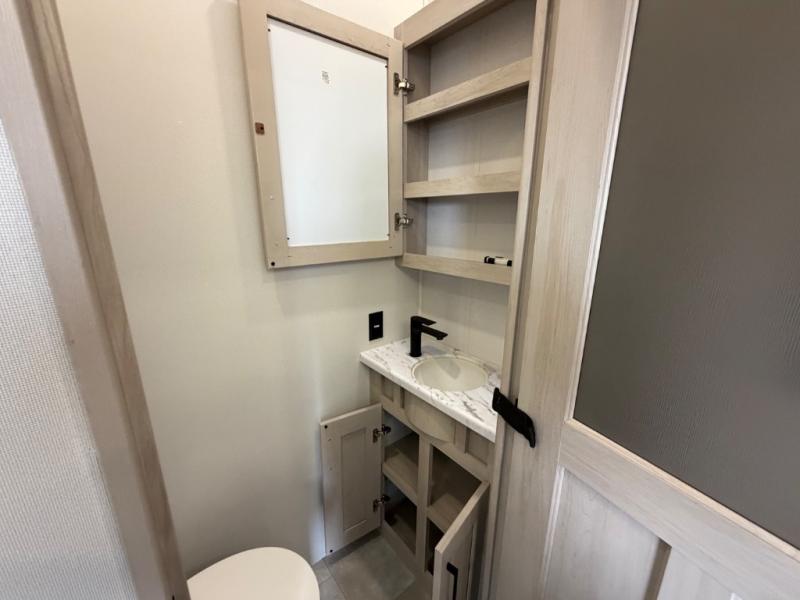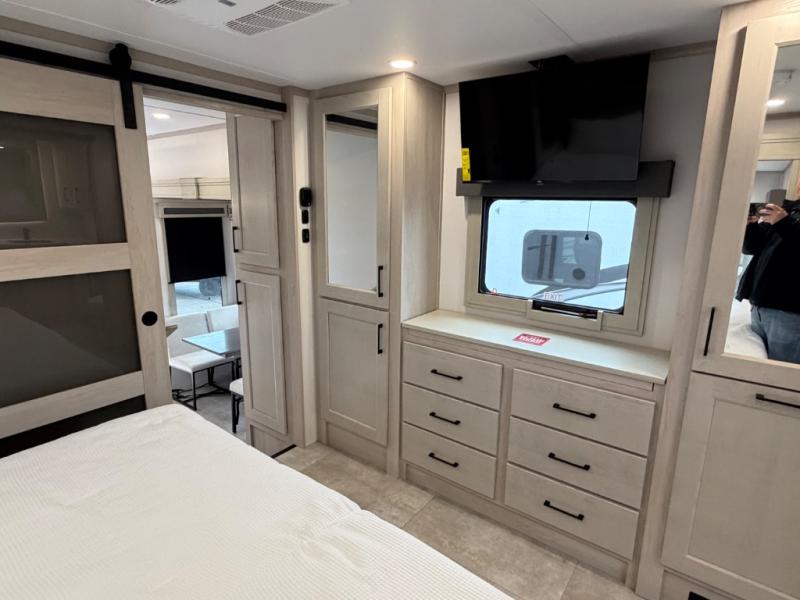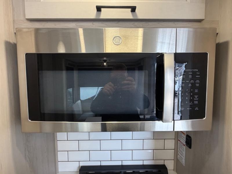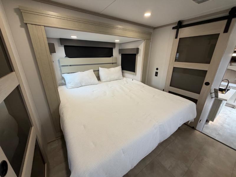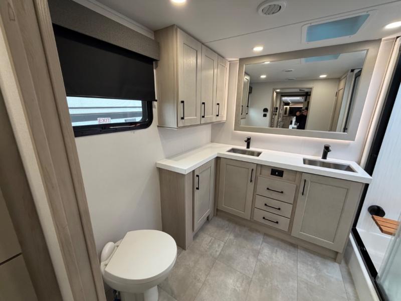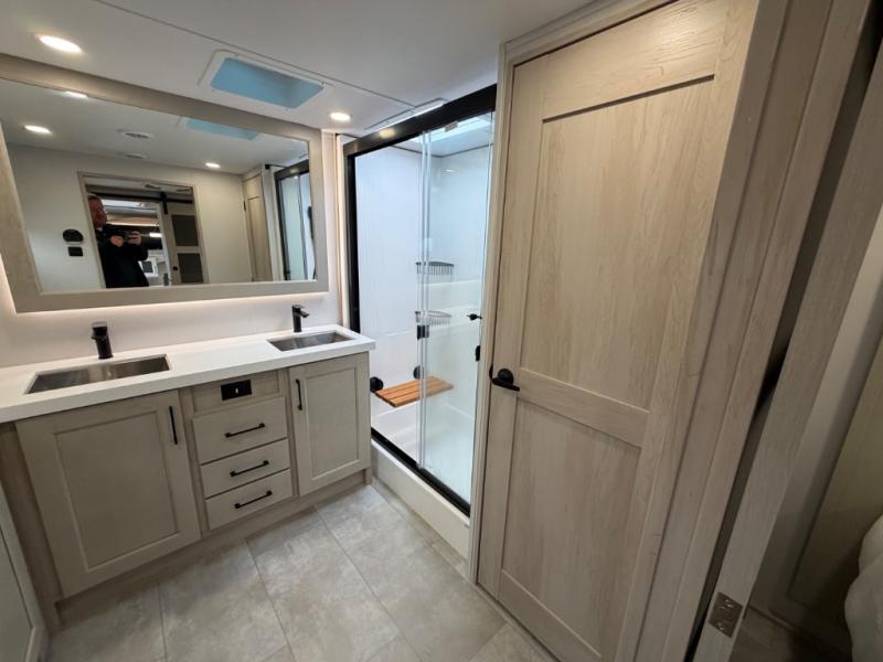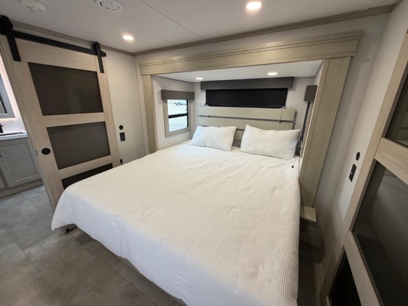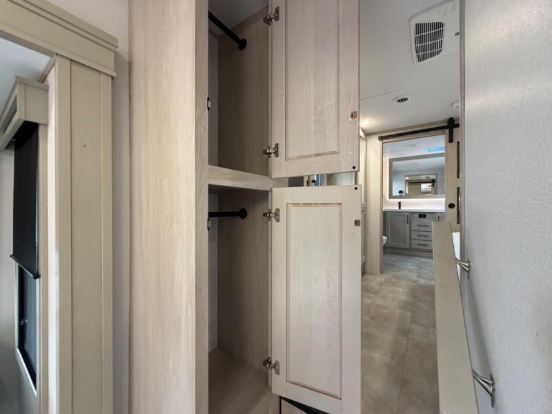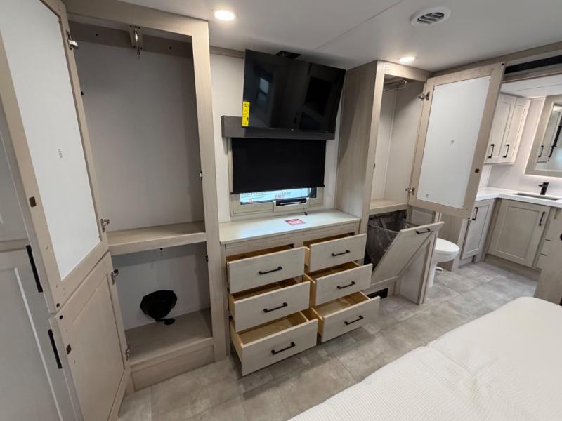 Five slide outs, a full bathroom with dual sinks, a half bath off of the kitchen, and a separate front living room and entertainment area are a few reasons you will enjoy your time spent in this fifth wheel! The separate kitchen is a dream with stainless steel appliances including a built-in oven, a pantry and hutch with counter space, a kitchen island plus a free-standing dinette slide with windows for great views. The entertainment center offers an LED Smart TV with a fireplace below and storage, and the dual opposing tri-fold sofas provide added sleeping space at night. The master bedroom includes a queen bed plus space savings sliding doors that lead you to the rear full bathroom with dual sinks, linen storage, and washer/dryer prep. The exterior has several storage choices as well including a pass-through compartment for fishing poles and such, plus the unique sliding tray in the rear allows you to bring along larger items such as camping tables, portable grills, golf clubs, totes and more.