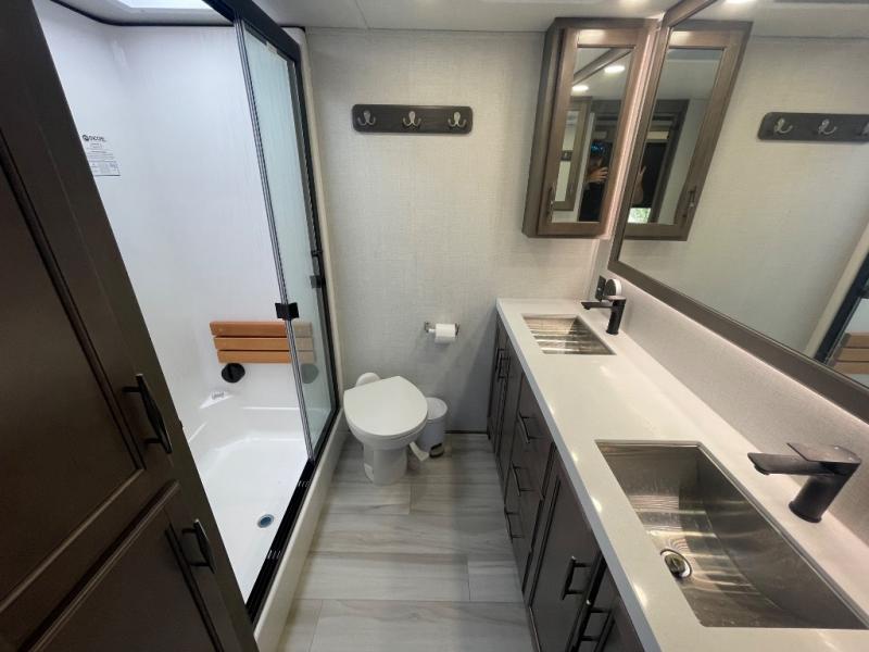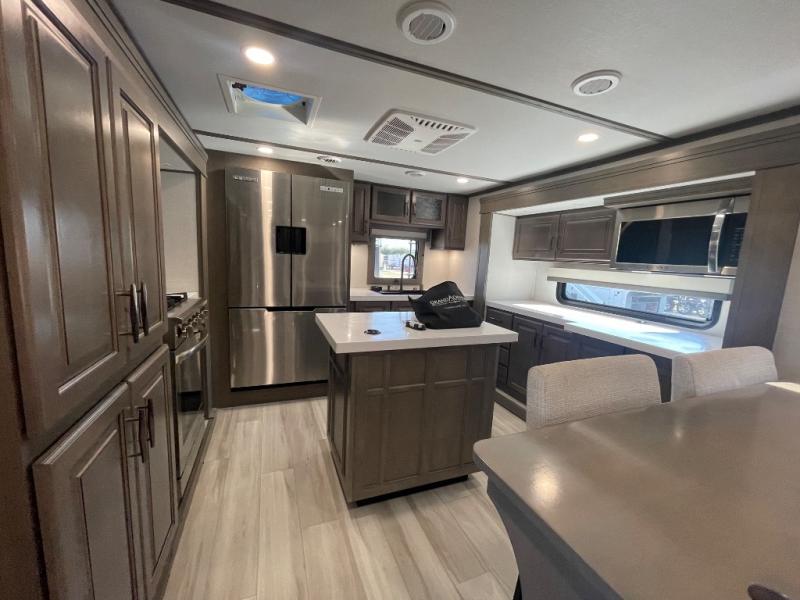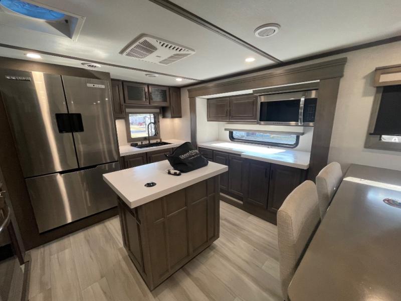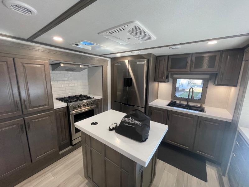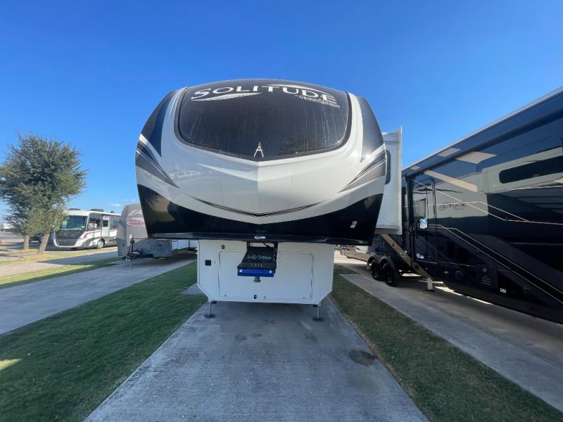 Each Solitude fifth wheel by Grand Design features a 101" wide-body construction, heavy duty 8,000 lb. axles, frameless tinted windows, and high-gloss gel coat sidewalls. You can camp year around thanks to the Weather-Tek Package that includes a 35K BTU high-capacity furnace, an all-in-one enclosed and heated utility center, and a fully enclosed underbelly with heated tanks and storage. Inside, you'll love the premium roller shades, hardwood cabinet doors, solid surface countertops, plus residential finishes throughout to make you truly feel at home. Each model also includes a MORryde CRE3000 suspension system, self adjusting brakes, and a MORryde pin box that will provide smooth towing from home to campground. Affordable luxury is possible with the Solitude fifth wheels; choose yours today!