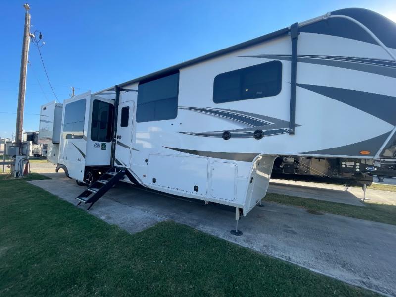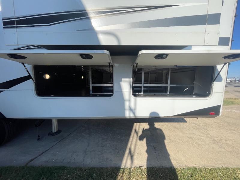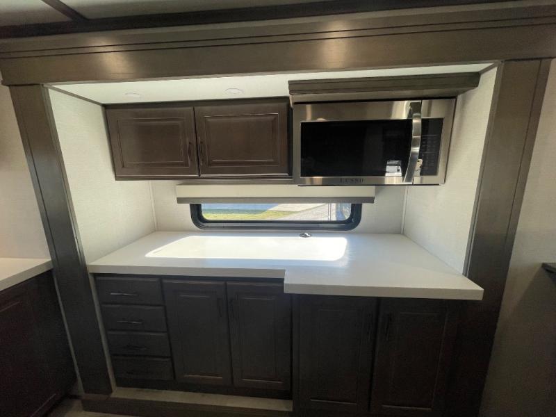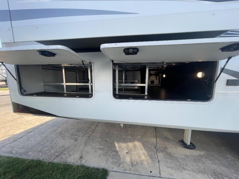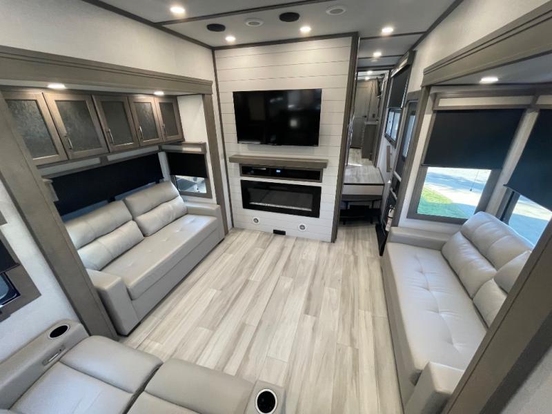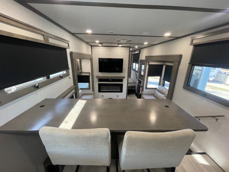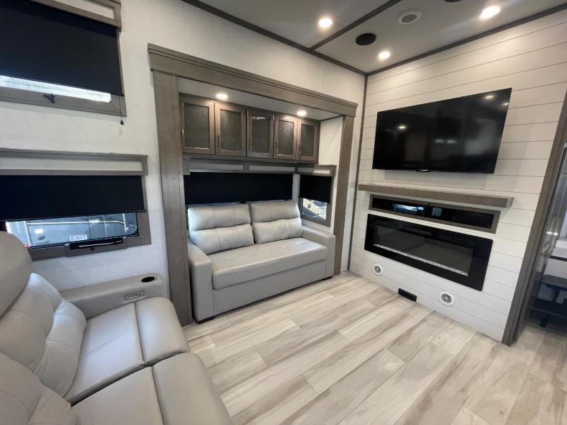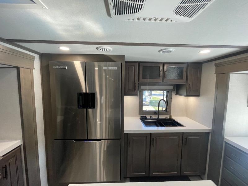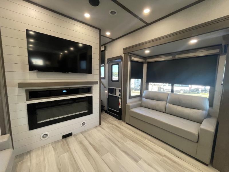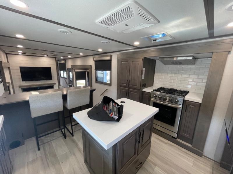 Enjoy each and every vacation, month-long trips, or even extended stays at an RV park in this spacious fifth wheel! The raised rear kitchen gives the cook plenty of room to whip up any type of meal using the stainless steel appliances including a built-in oven, an oversized pantry, and the raised bar top will provide you even more counter space on top of dining with two chairs that overlook the middle living area. Relaxing is made easy thanks to two tri-fold sofas and theatre seating while watching the big game on the LED Smart TV and enjoying the fireplace below. At night, retire to your own queen bed which slides out to provide more floor space, and you can store your clothes in the slide top dresser and front closet with washer and dryer prep.