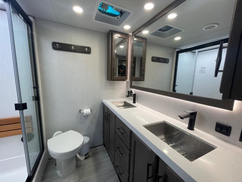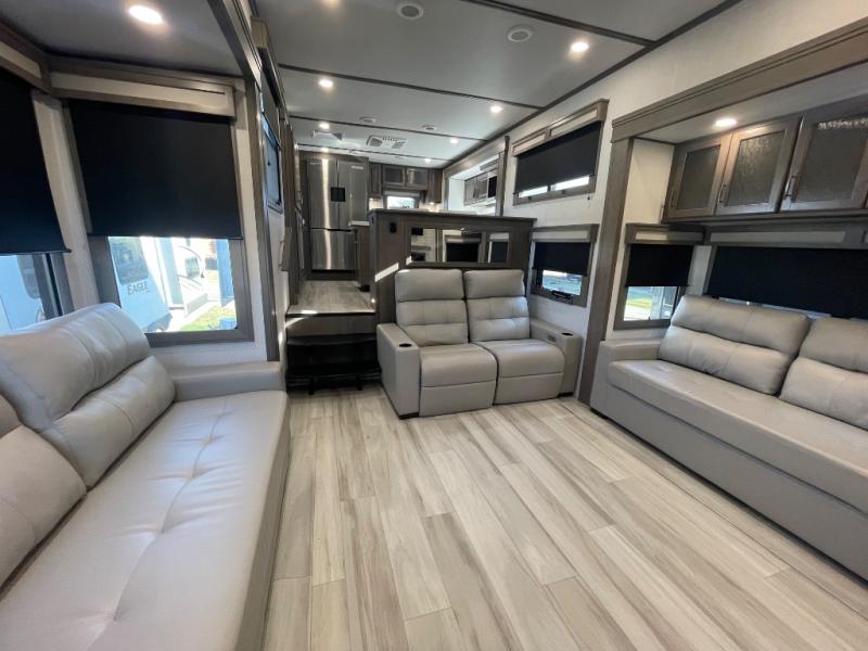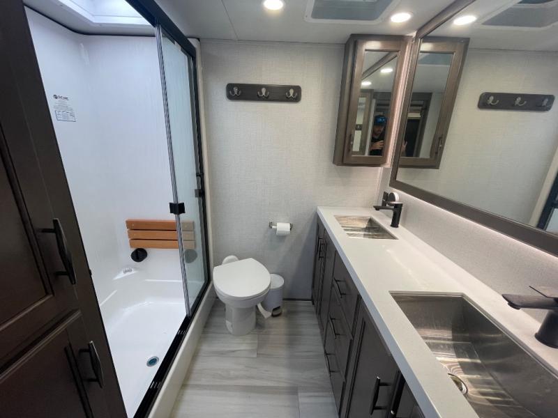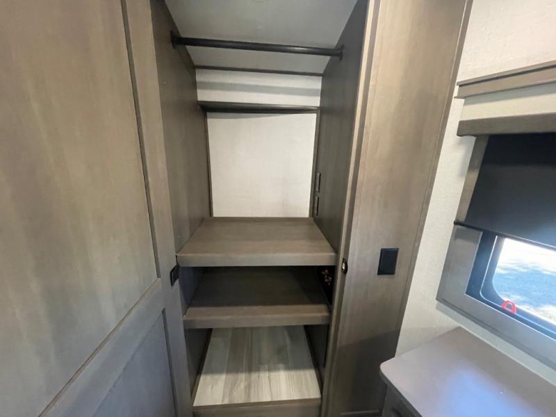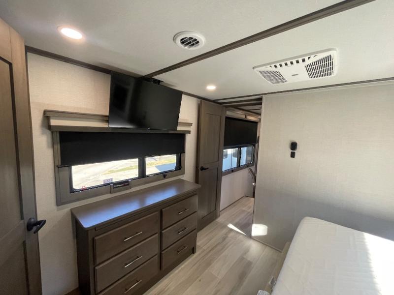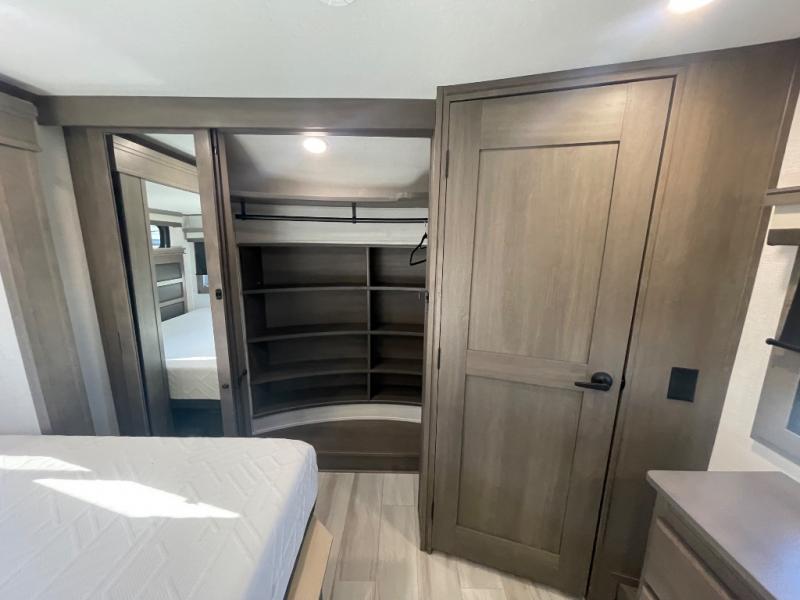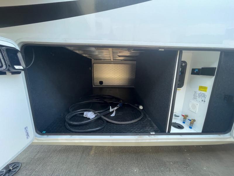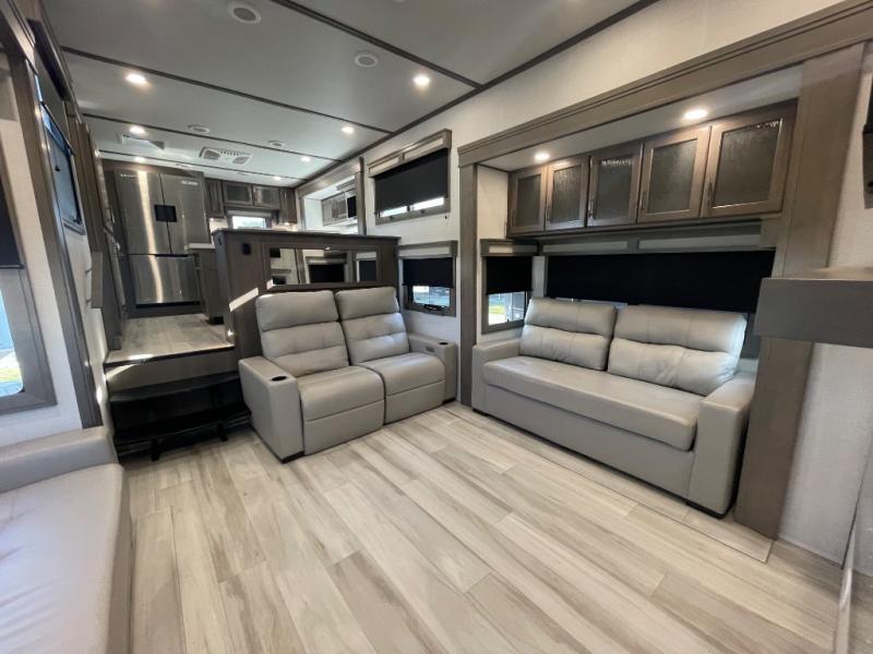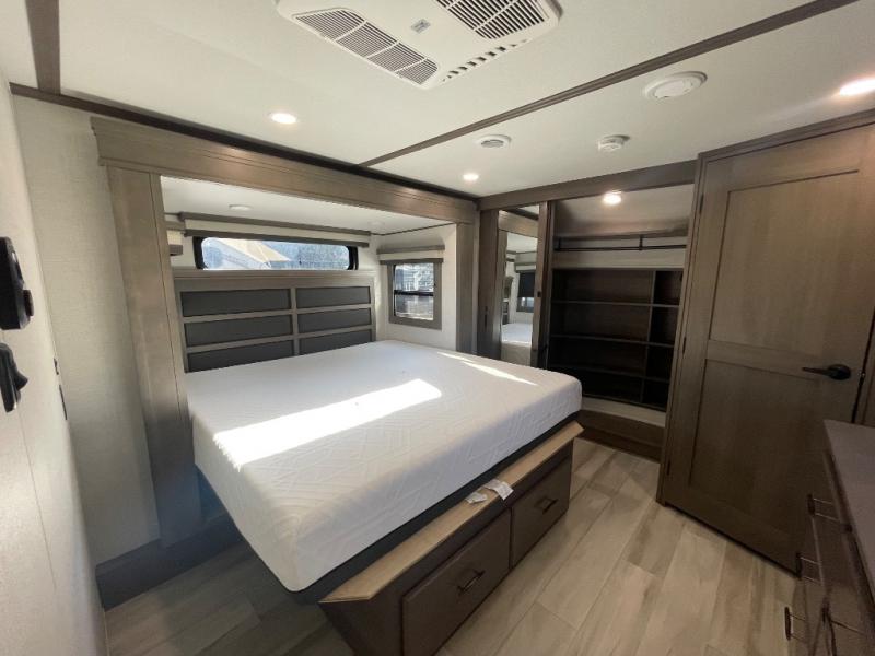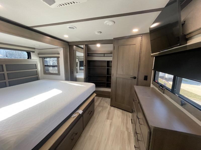 Enjoy each and every vacation, month-long trips, or even extended stays at an RV park in this spacious fifth wheel! The raised rear kitchen gives the cook plenty of room to whip up any type of meal using the stainless steel appliances including a built-in oven, an oversized pantry, and the raised bar top will provide you even more counter space on top of dining with two chairs that overlook the middle living area. Relaxing is made easy thanks to two tri-fold sofas and theatre seating while watching the big game on the LED Smart TV and enjoying the fireplace below. At night, retire to your own queen bed which slides out to provide more floor space, and you can store your clothes in the slide top dresser and front closet with washer and dryer prep.