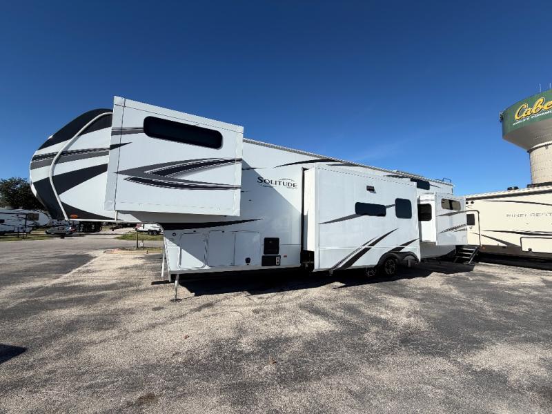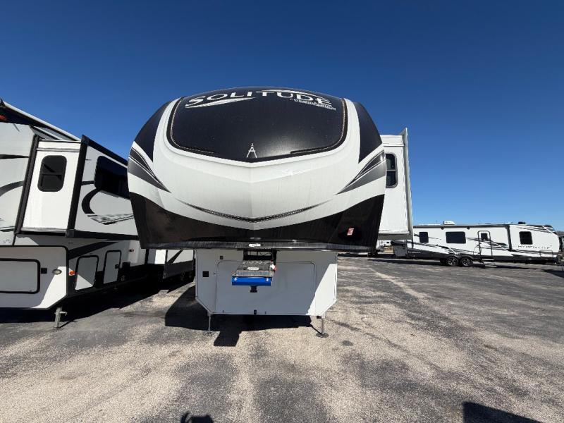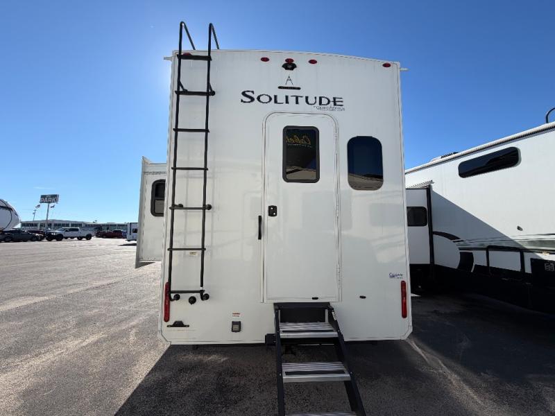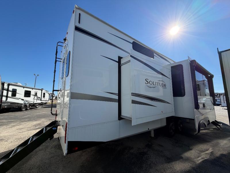 Each Solitude fifth wheel by Grand Design features a 101" wide-body construction, heavy duty 8,000 lb. axles, frameless tinted windows, and high-gloss gel coat sidewalls. You can camp year around thanks to the Weather-Tek Package that includes a 35K BTU high-capacity furnace, an all-in-one enclosed and heated utility center, and a fully enclosed underbelly with heated tanks and storage. Inside, you'll love the premium roller shades, hardwood cabinet doors, solid surface countertops, plus residential finishes throughout to make you truly feel at home. Each model also includes a MORryde CRE3000 suspension system, self adjusting brakes, and a MORryde pin box that will provide smooth towing from home to campground. Affordable luxury is possible with the Solitude fifth wheels; choose yours today!