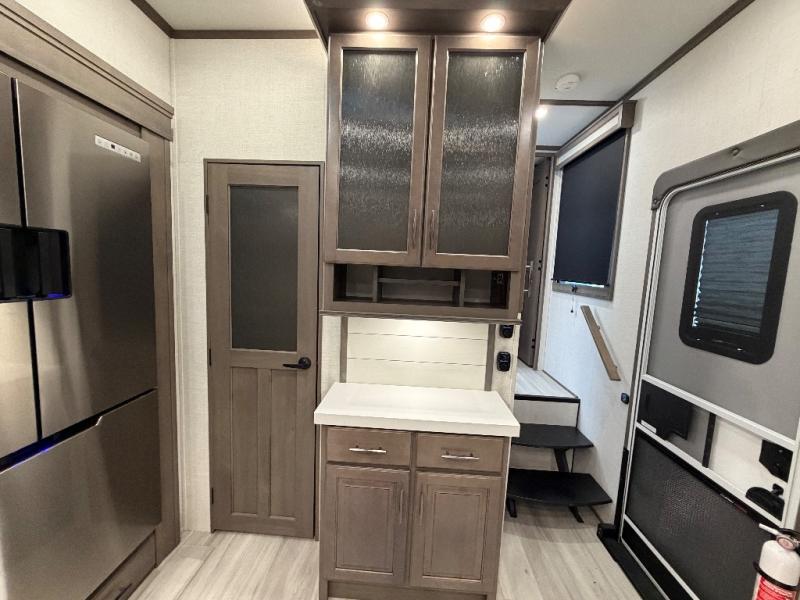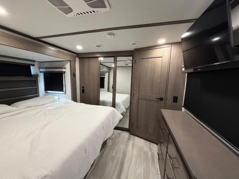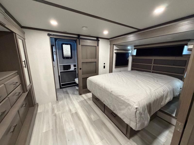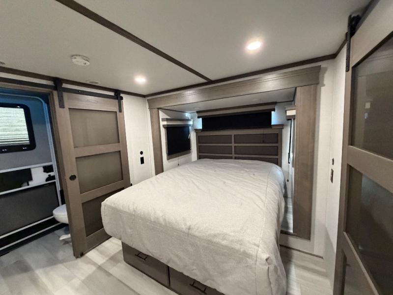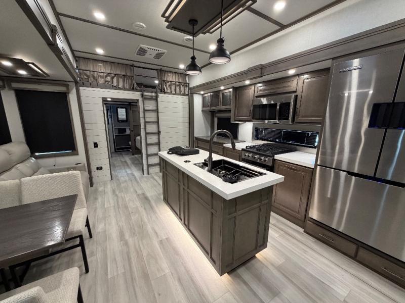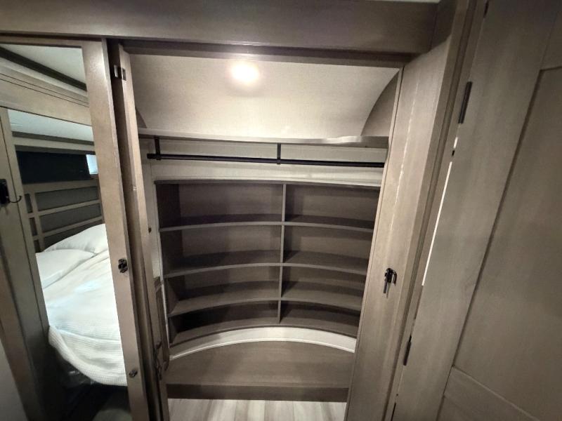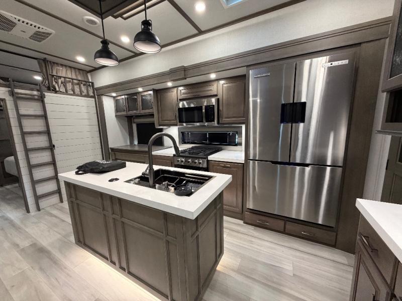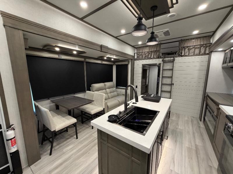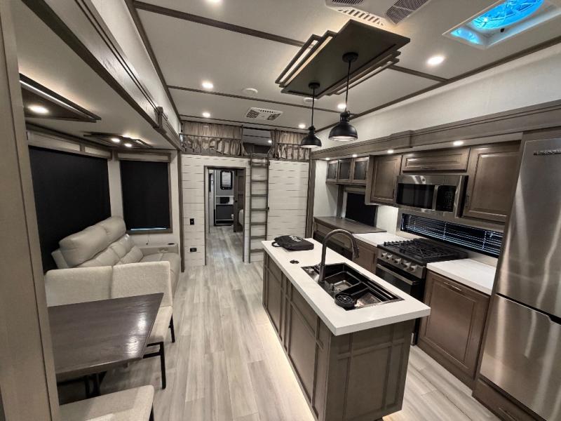 For an affordable luxury extended stay for your family, this Solitude is it! Two private bedrooms plus an overhead Sky Suite loft above the rear bedroom which also has it's own private rear entry/exit door is just the beginning of what is in store for your camping convenience. The upscale kitchen features an island with dishwasher prep, a smart sink, a 12V 20 cu. ft. refrigerator for your perishables, and a built-in oven. There is also a microwave, pantry, and hutch for your dishes, plus a free standing dinette! You can easily take along extra family and friends with the second private bedroom featuring it's own private bath and entry which is great for another couple, and there is even loft space above this rear private bedroom for added storage or sleeping for children. And, you will find ample storage for clothing and belongings throughout with nice size closets, overhead cabinets, plus loads of outside storage.