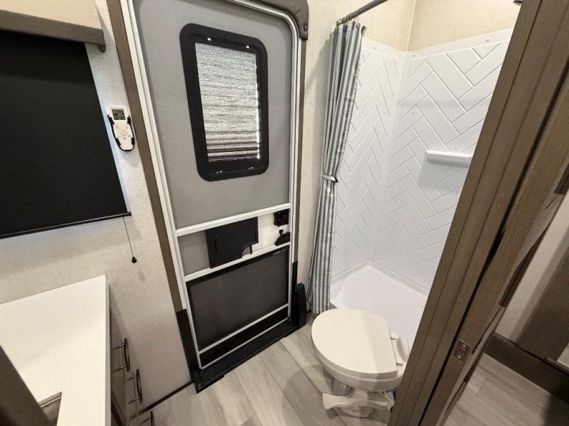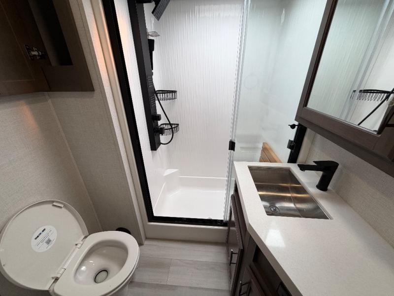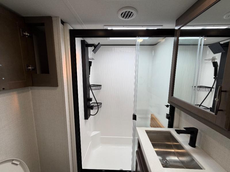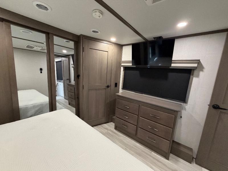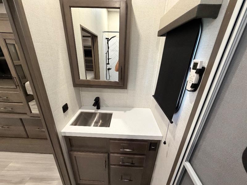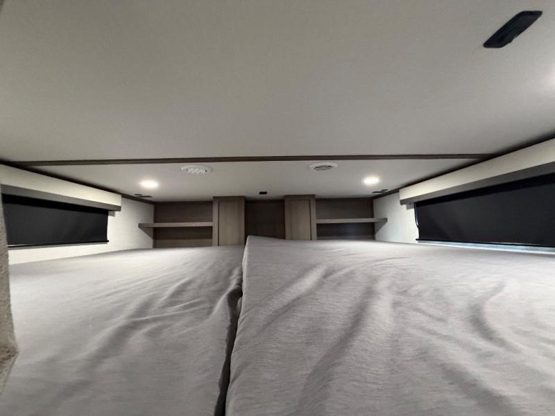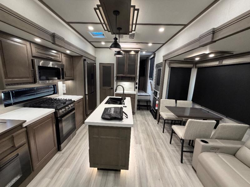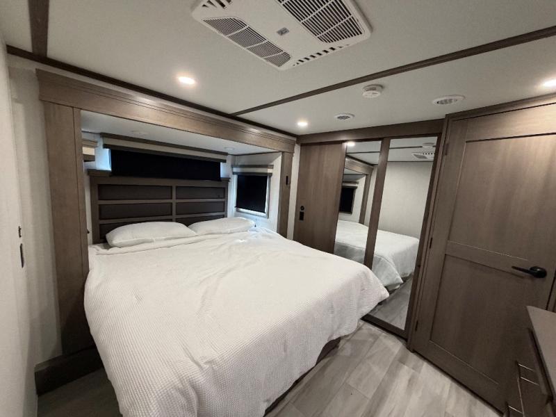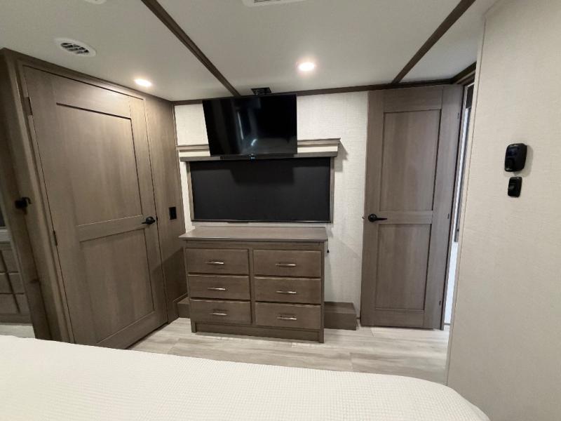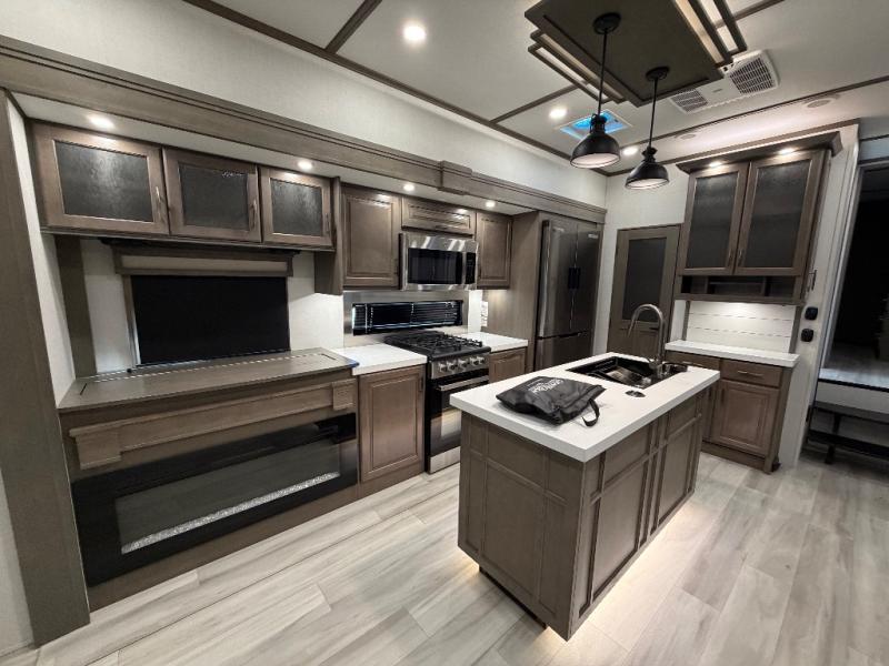 For an affordable luxury extended stay for your family, this Solitude is it! Two private bedrooms plus an overhead Sky Suite loft above the rear bedroom which also has it's own private rear entry/exit door is just the beginning of what is in store for your camping convenience. The upscale kitchen features an island with dishwasher prep, a smart sink, a 12V 20 cu. ft. refrigerator for your perishables, and a built-in oven. There is also a microwave, pantry, and hutch for your dishes, plus a free standing dinette! You can easily take along extra family and friends with the second private bedroom featuring it's own private bath and entry which is great for another couple, and there is even loft space above this rear private bedroom for added storage or sleeping for children. And, you will find ample storage for clothing and belongings throughout with nice size closets, overhead cabinets, plus loads of outside storage.