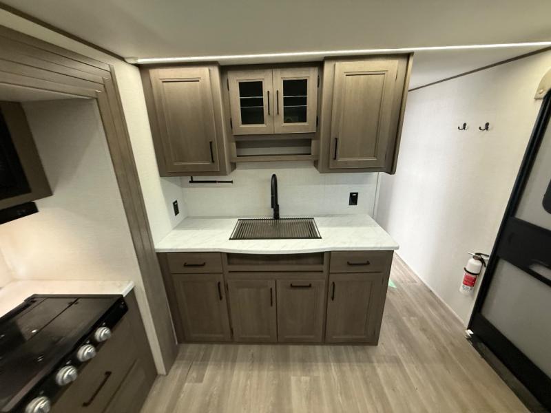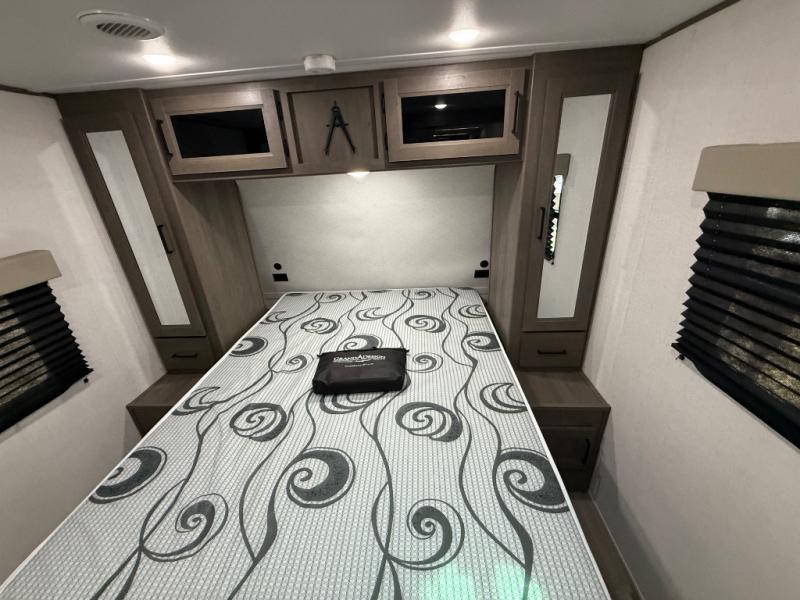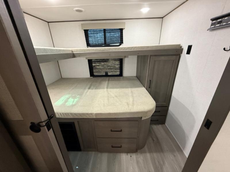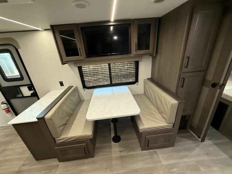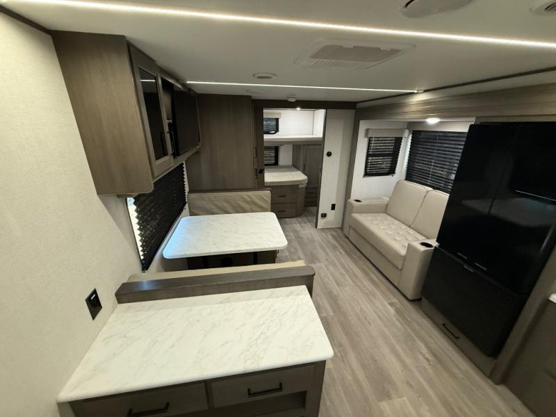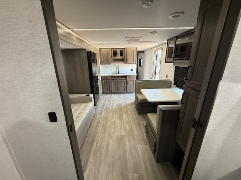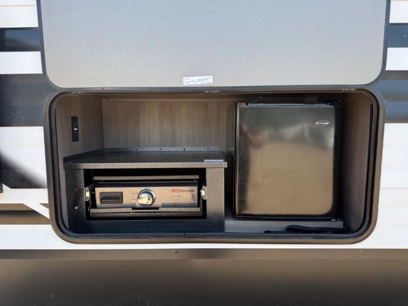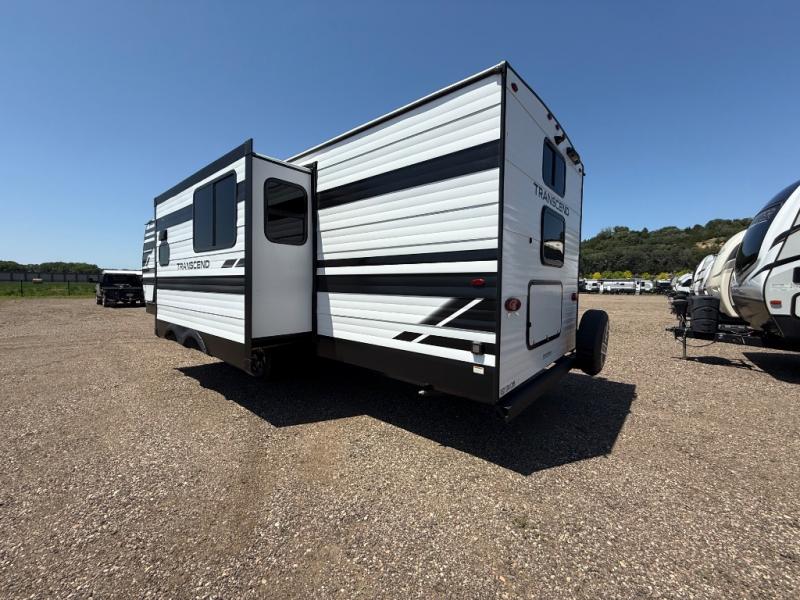 You're going to love every minute spent in this Transcend travel trailer! Your guests or the little ones will have the rear bunkhouse all to themselves that includes a residential full-size bed and two bunks, storage drawers, and TV prep if you want to add a television here. You'll enjoy your own space up front in the private bedroom with a queen bed, storage drawers, and TV prep here also. The combined kitchen and living area includes a sleeper sofa with an optional theater seating, a booth dinette where you can dine together, and a 32" TV for movie nights! The exterior is just as accommodating with its 20' awning, rear storage, plus exterior griddle and refrigerator!