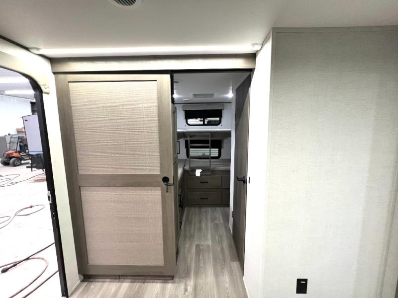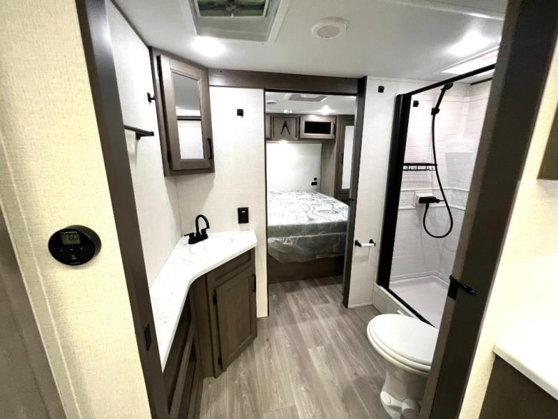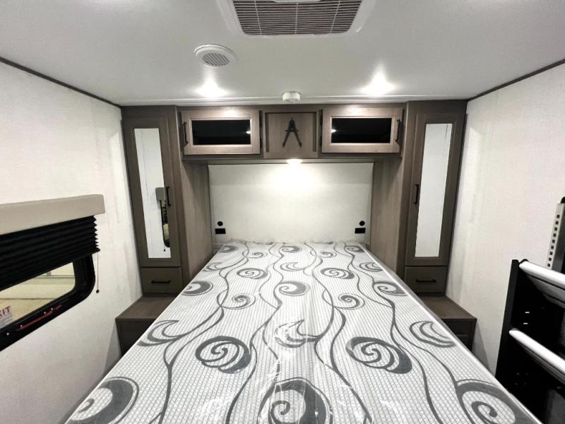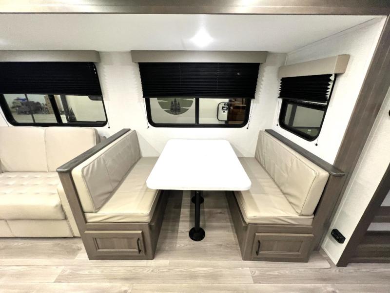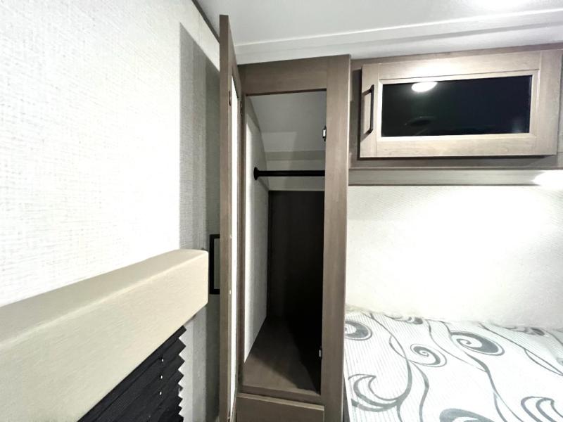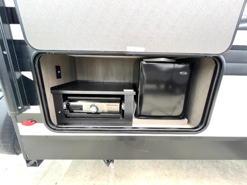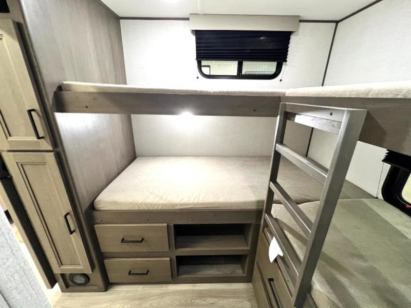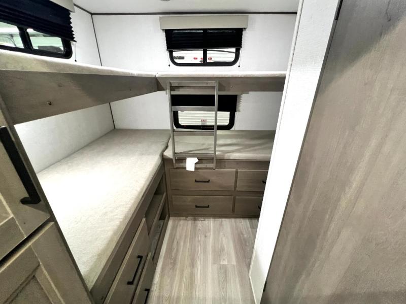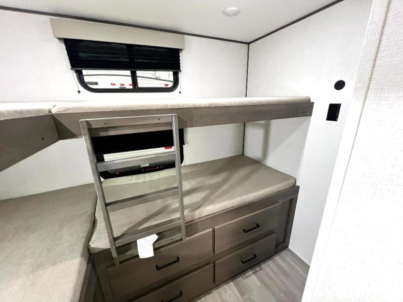 Your crew of nine will love camping in this spacious travel trailer! There are four bunks in the rear bunkhouse, along with storage drawers, and a convenient half bath! A full walk-thru bath will create a front master bedroom you are sure to love, especially with its queen bed, wardrobe storage, and private exterior entry door! The main living area will be a favorite place to hang out with its booth dinette, sleeper sofa and 32" TV. If the weather is nice, you may just find yourselves outdoors since there is an exterior griddle and 1.7 cu. ft. refrigerator!