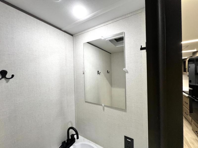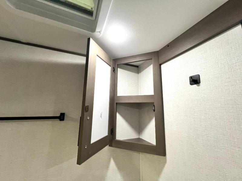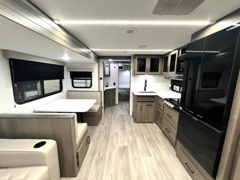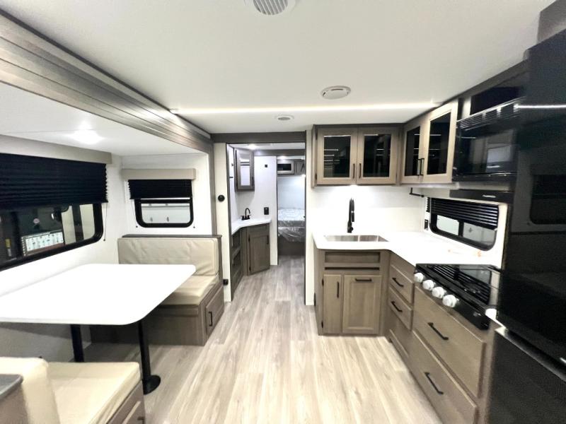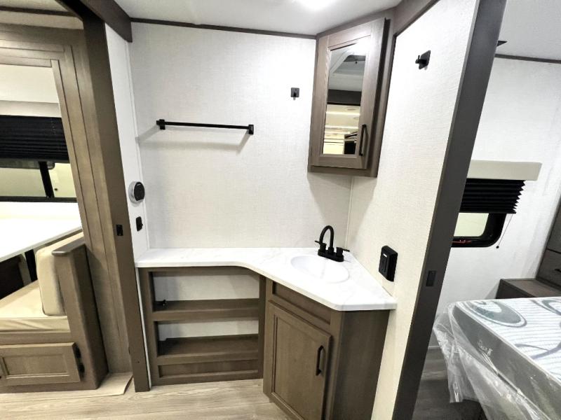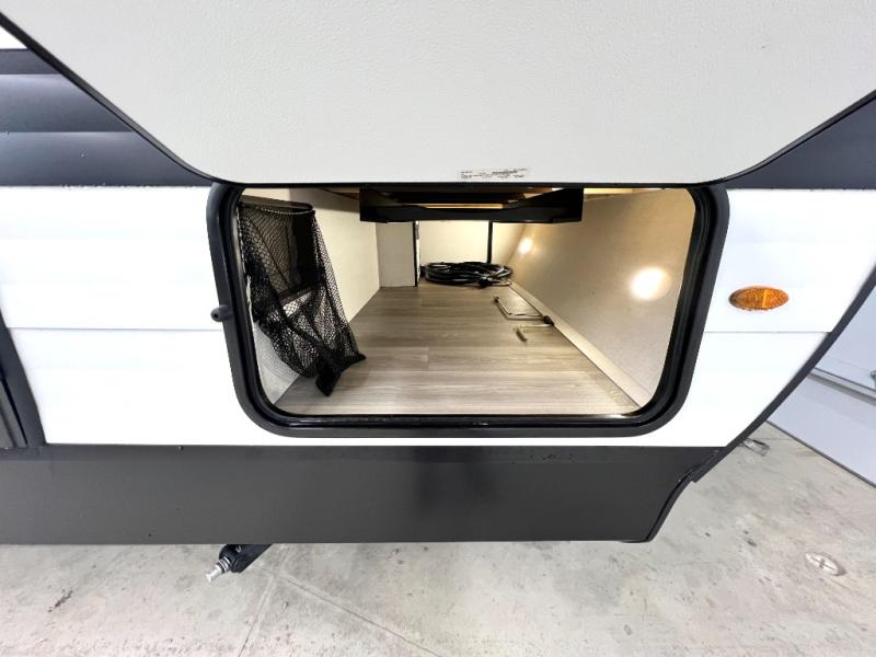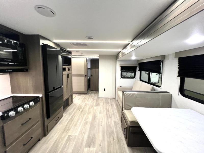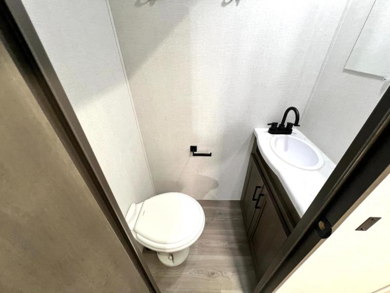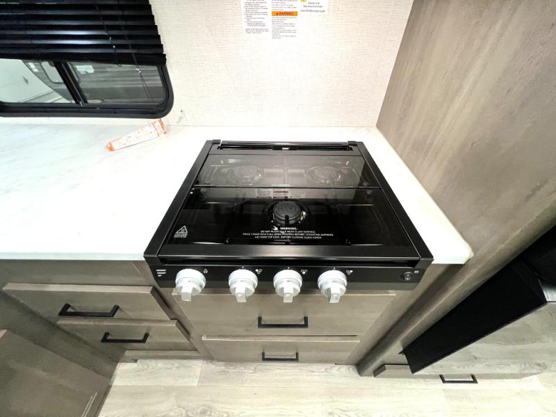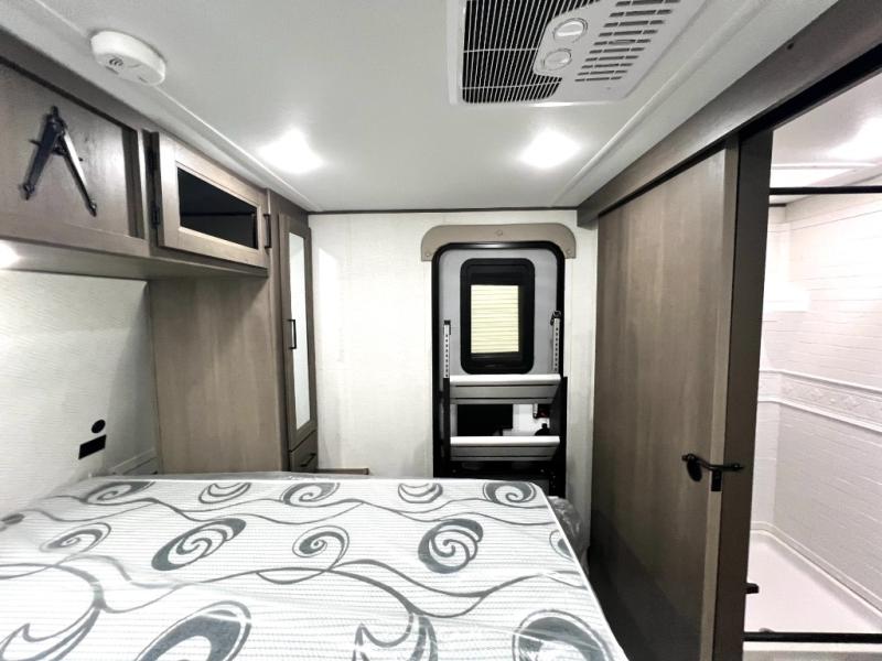 Your crew of nine will love camping in this spacious travel trailer! There are four bunks in the rear bunkhouse, along with storage drawers, and a convenient half bath! A full walk-thru bath will create a front master bedroom you are sure to love, especially with its queen bed, wardrobe storage, and private exterior entry door! The main living area will be a favorite place to hang out with its booth dinette, sleeper sofa and 32" TV. If the weather is nice, you may just find yourselves outdoors since there is an exterior griddle and 1.7 cu. ft. refrigerator!
