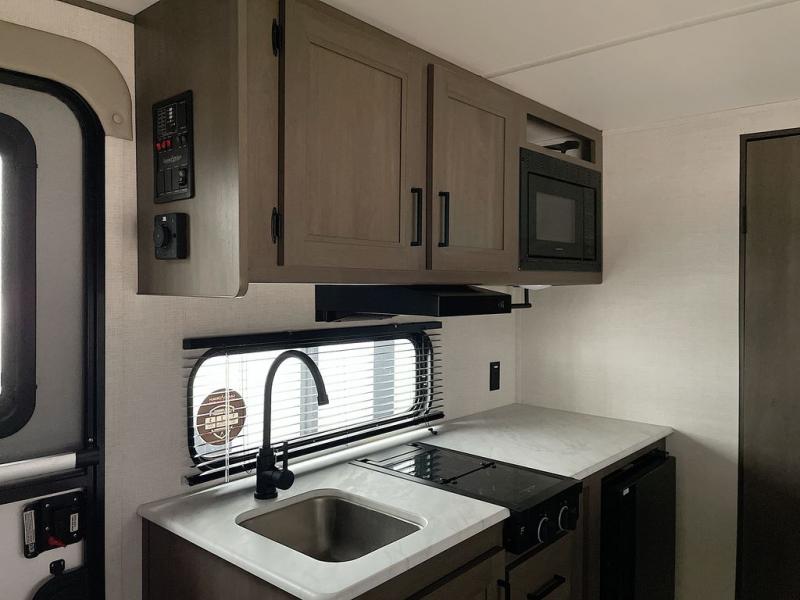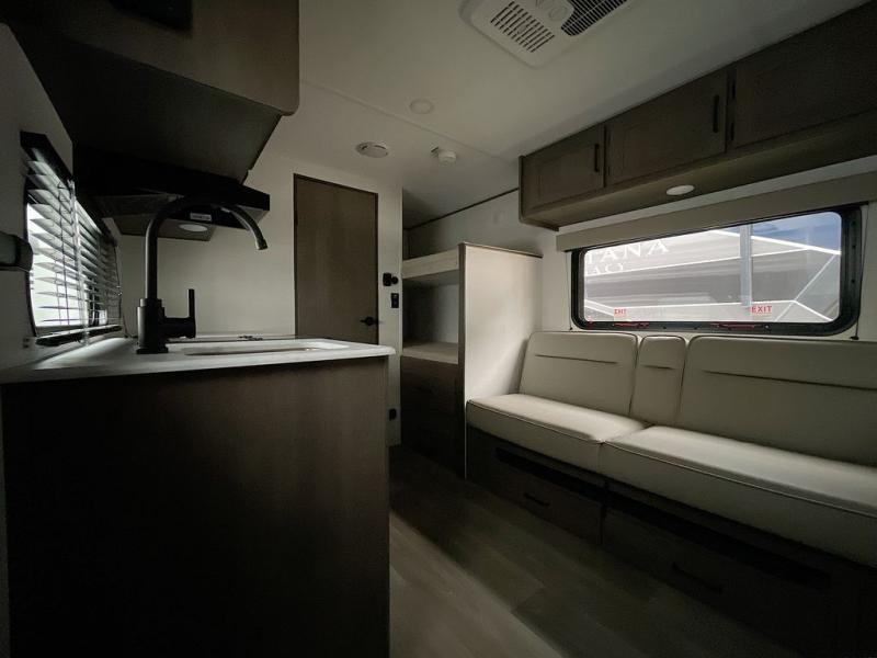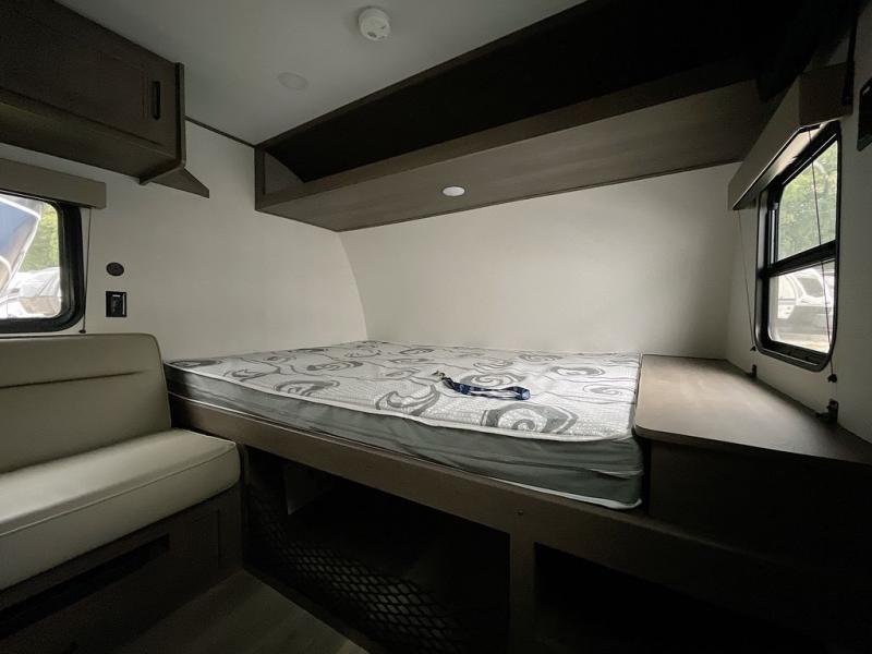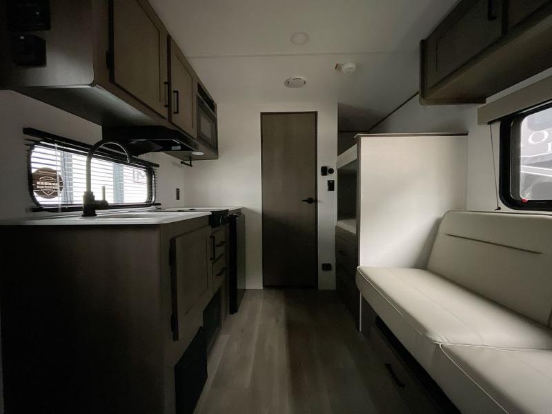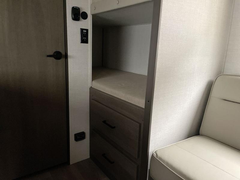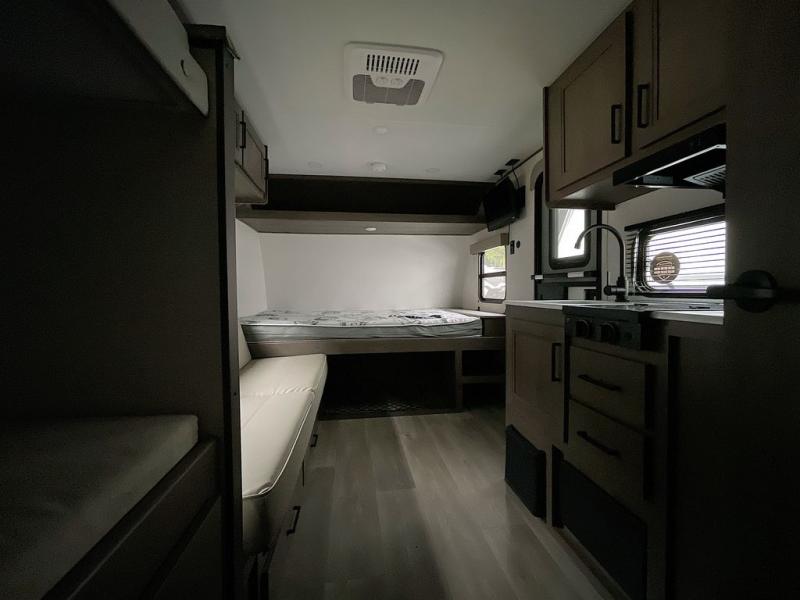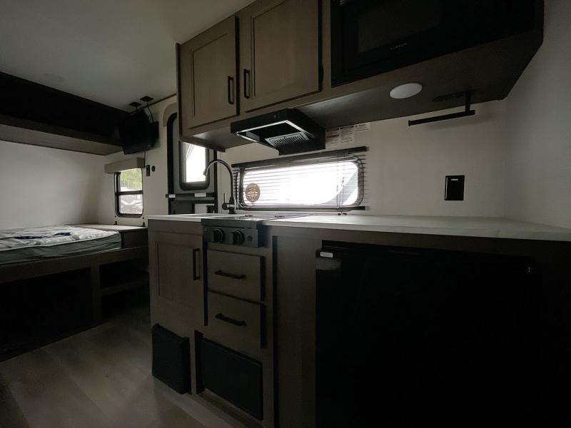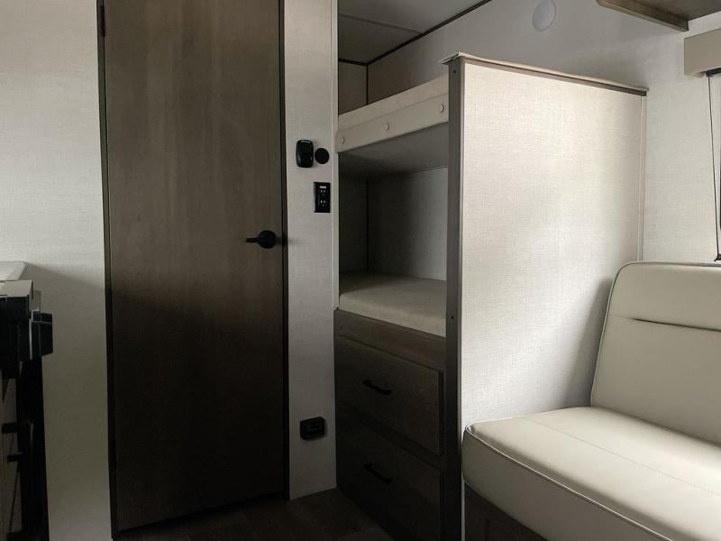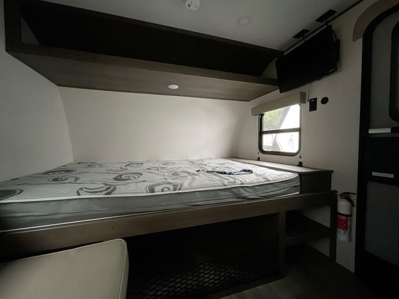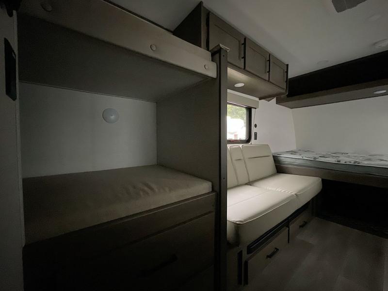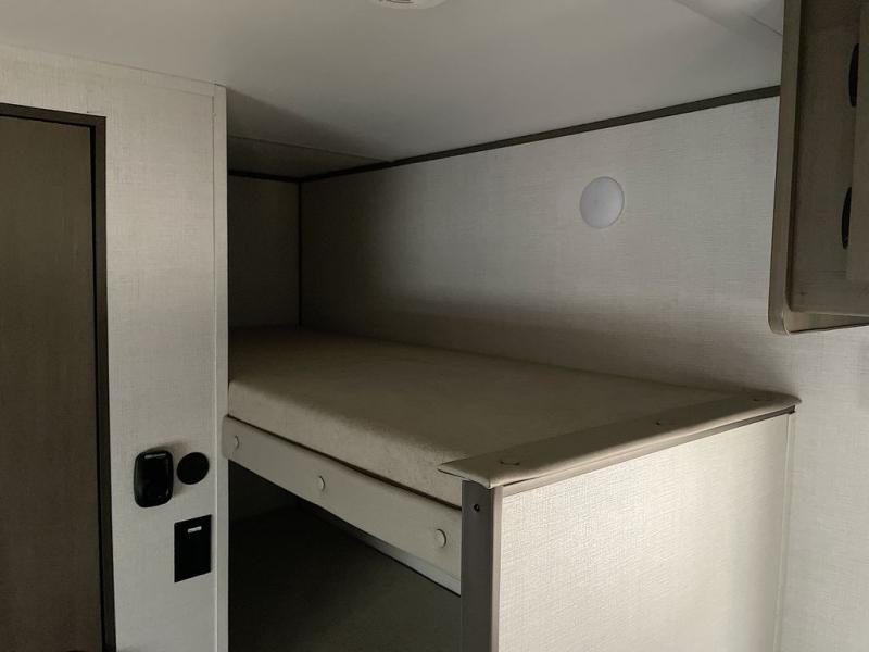 Camping trips to the lake have never been easier than with this travel trailer! The 28" x 67" bunks are right next to the private bath for easy nighttime use, and the front queen bed includes hidden storage for your things. There is also a 66" Jack knife sofa that provides a little more sleeping space for guests. A full kitchen lets you cook meals each day and there is an exterior LP quick connect if you want to fire up your own propane grill.